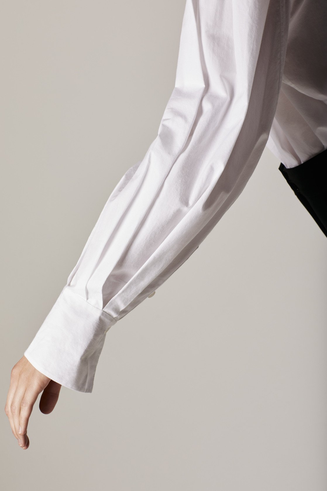 This blouse is all about proportions, whether tied in a bow or looped through once for a dramatic line. The billowed sleeve with drop-shoulder creates an air of softness and ends in a clean cuff.