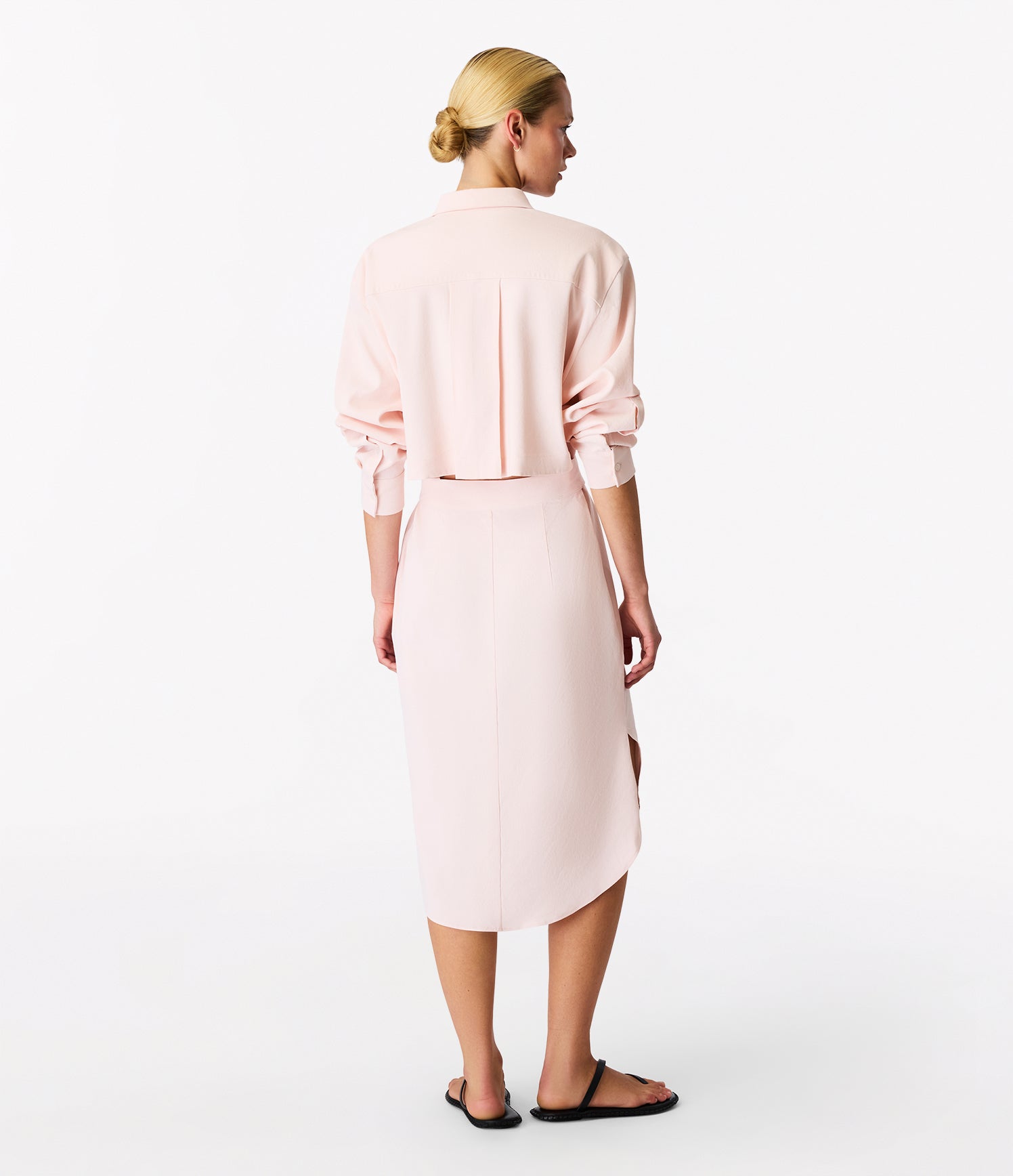 Crafted in hemp blend, this shirt dress features oversized shoulders and sleeves with a curved hem. The back features a cutout with an attached belt. Unlined.