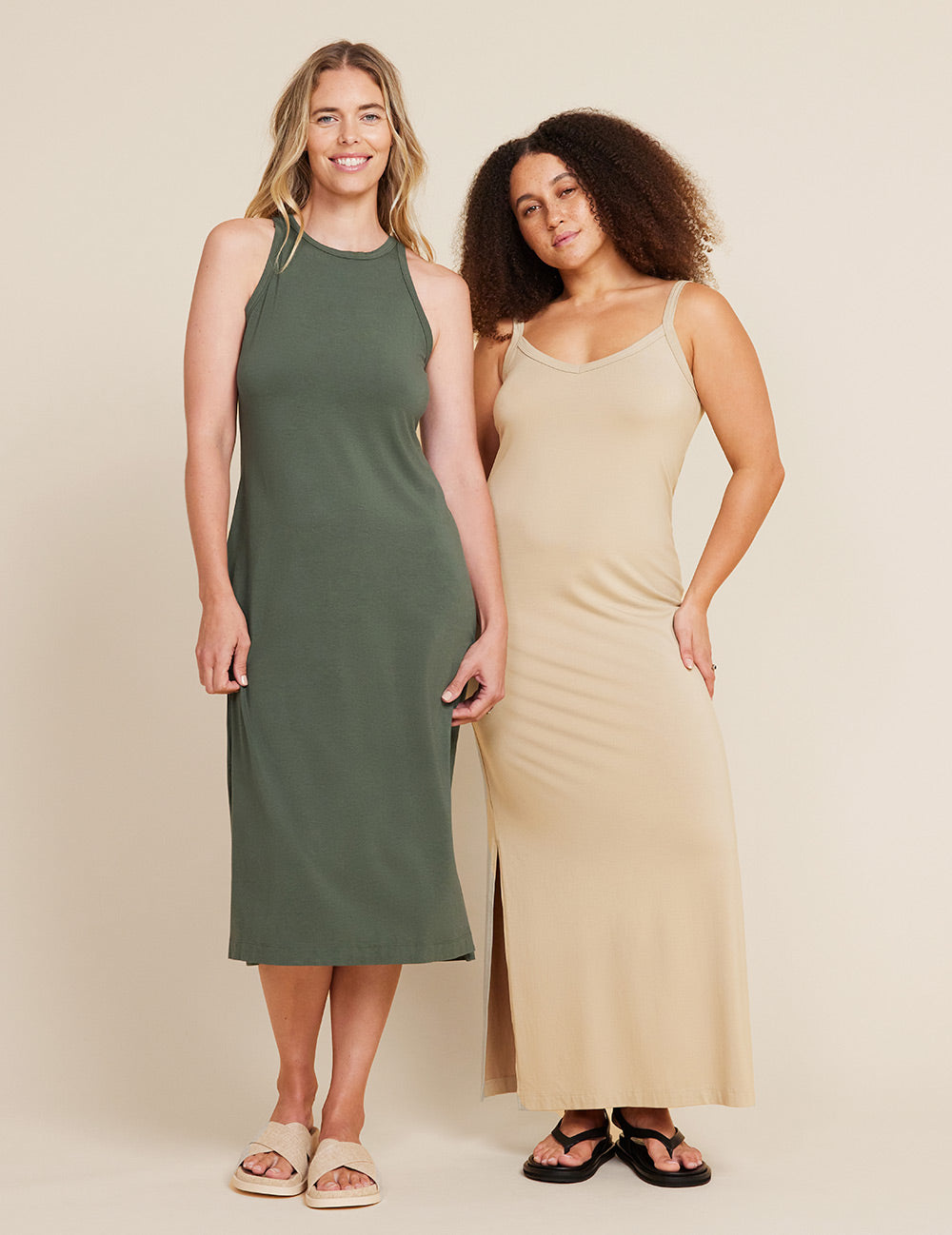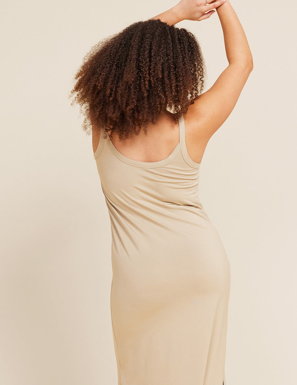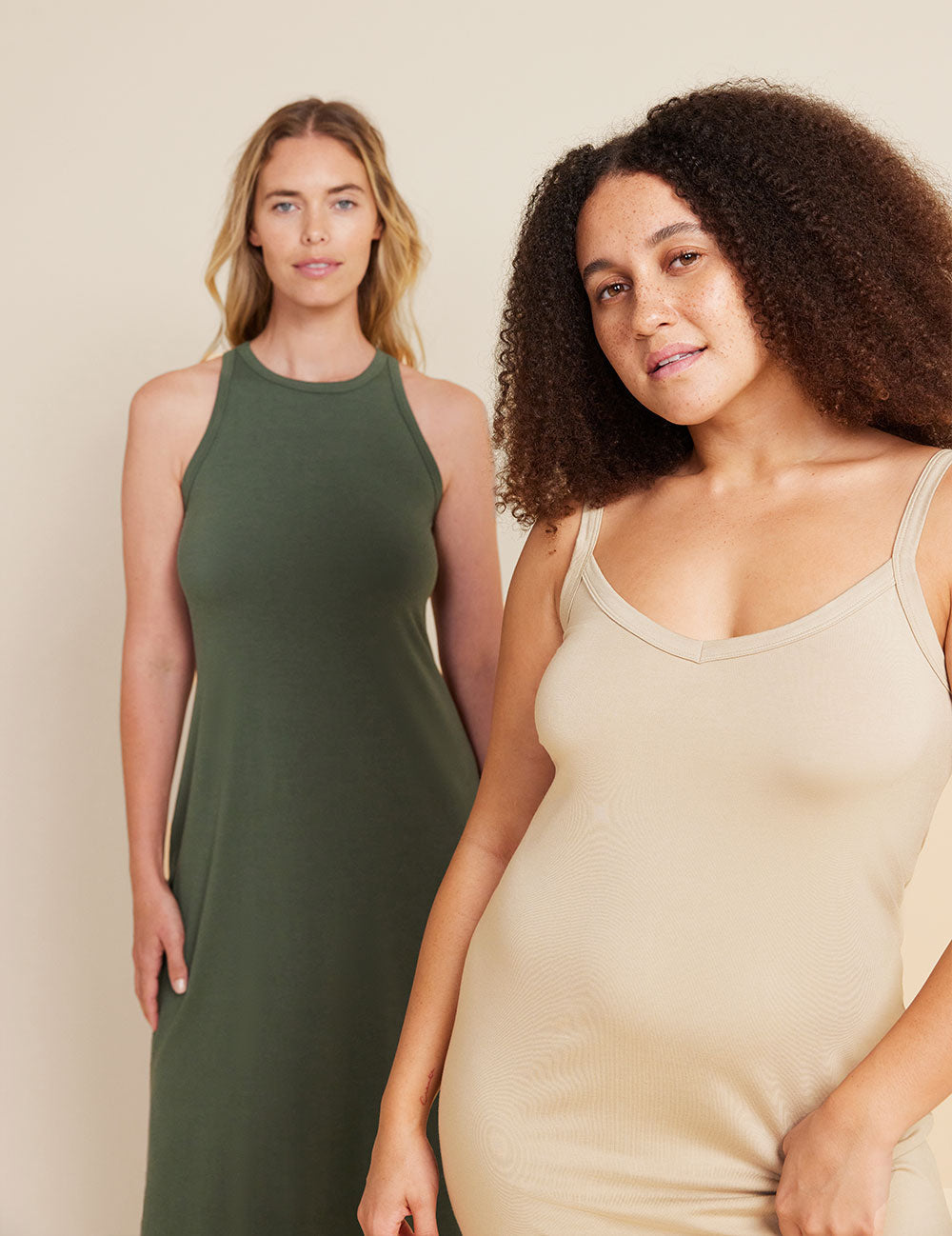• Features a low scoop back, v-neckline, and sits at maxi length for a stylish and comfortable look.