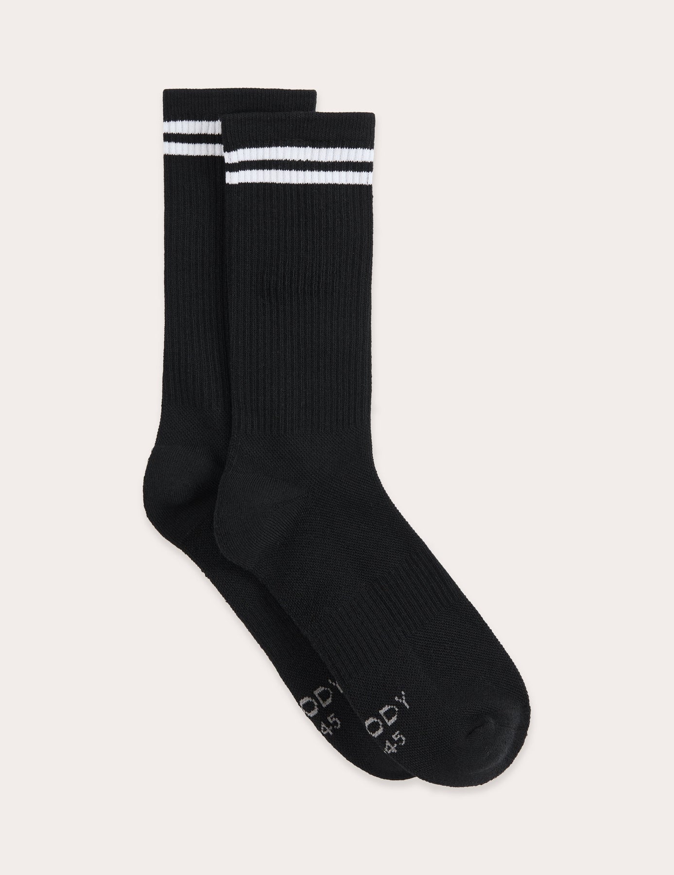 Introducing Boody's Striped Cushioned Crew Bamboo Socks in Black/White for Men & Women. Made comfy with Viscose fibre made from organically grown Bamboo.