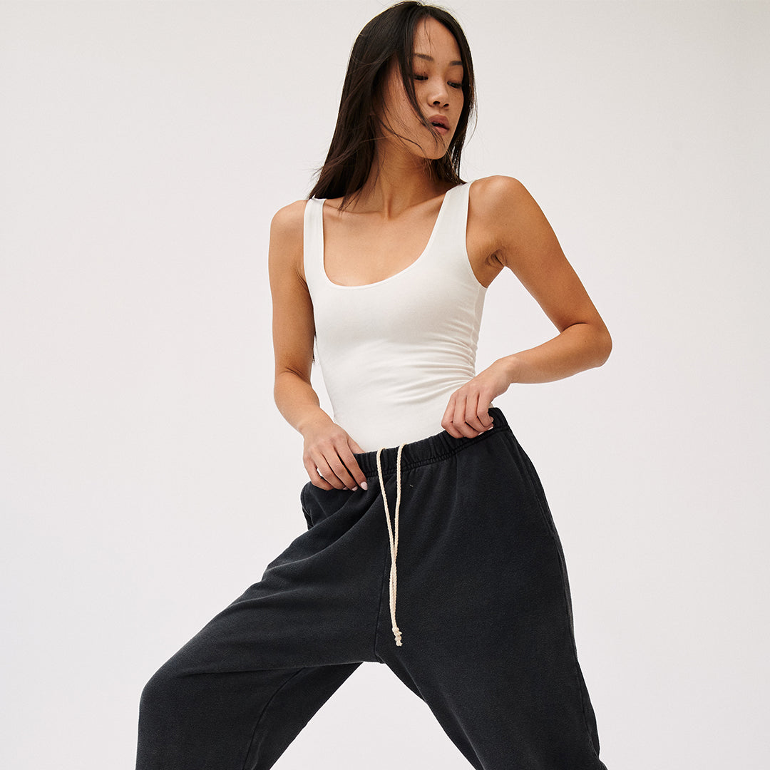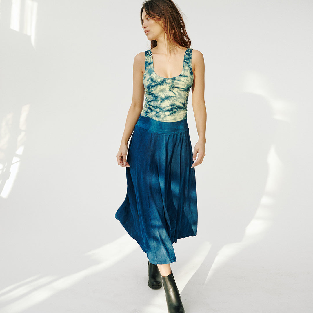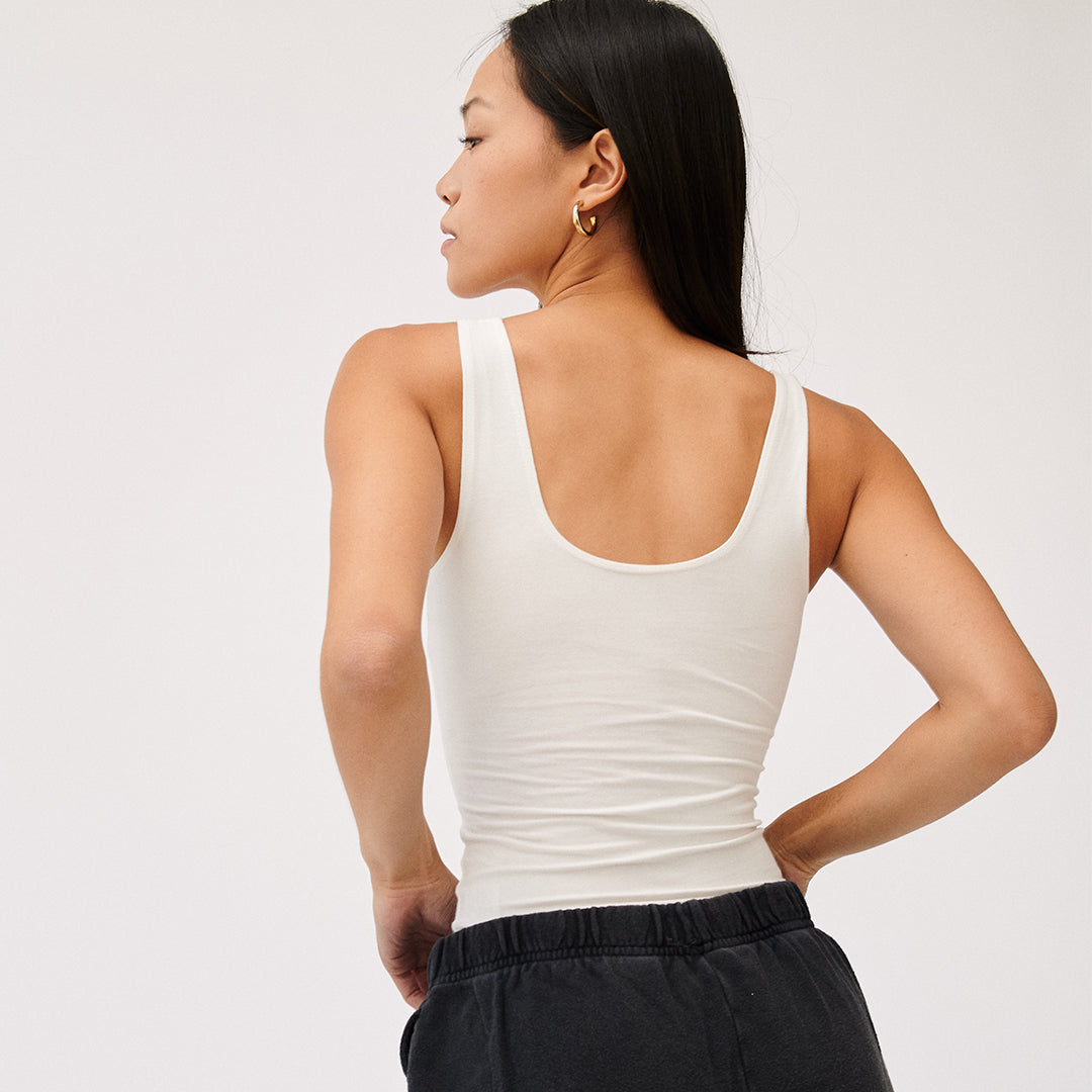 A seamless bottom layer or a standout solo piece. Slim-shaping with a dropped arm hole and tapered straps. Made with 92% organic cotton 8% spandex and dyed with 100% non-toxic vegetable dyes.