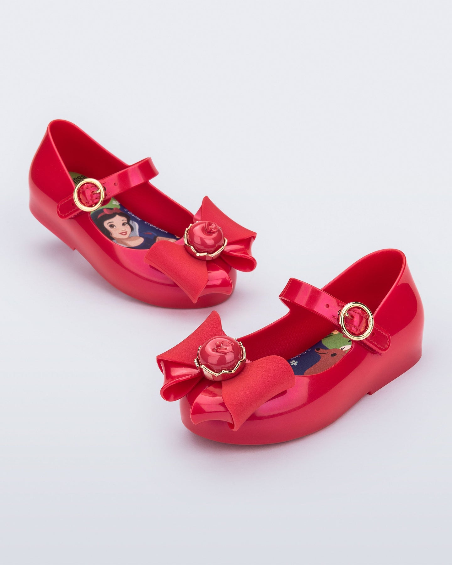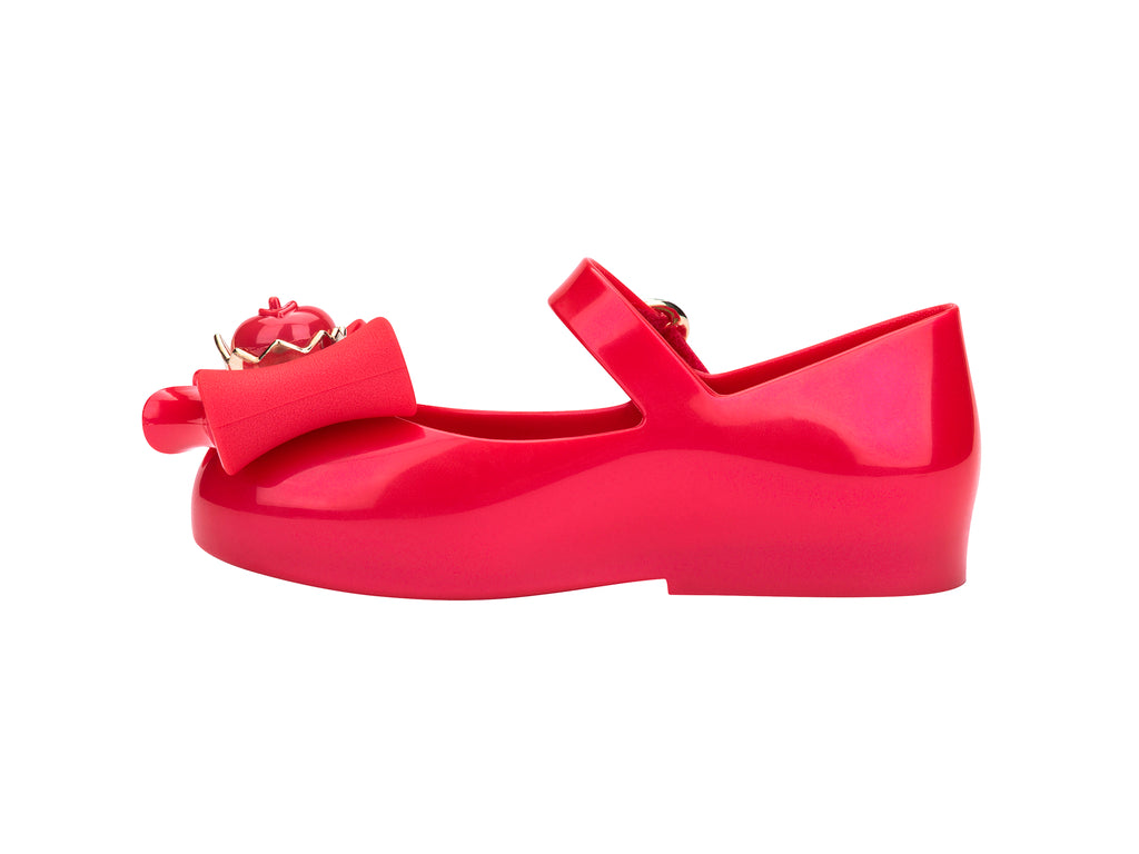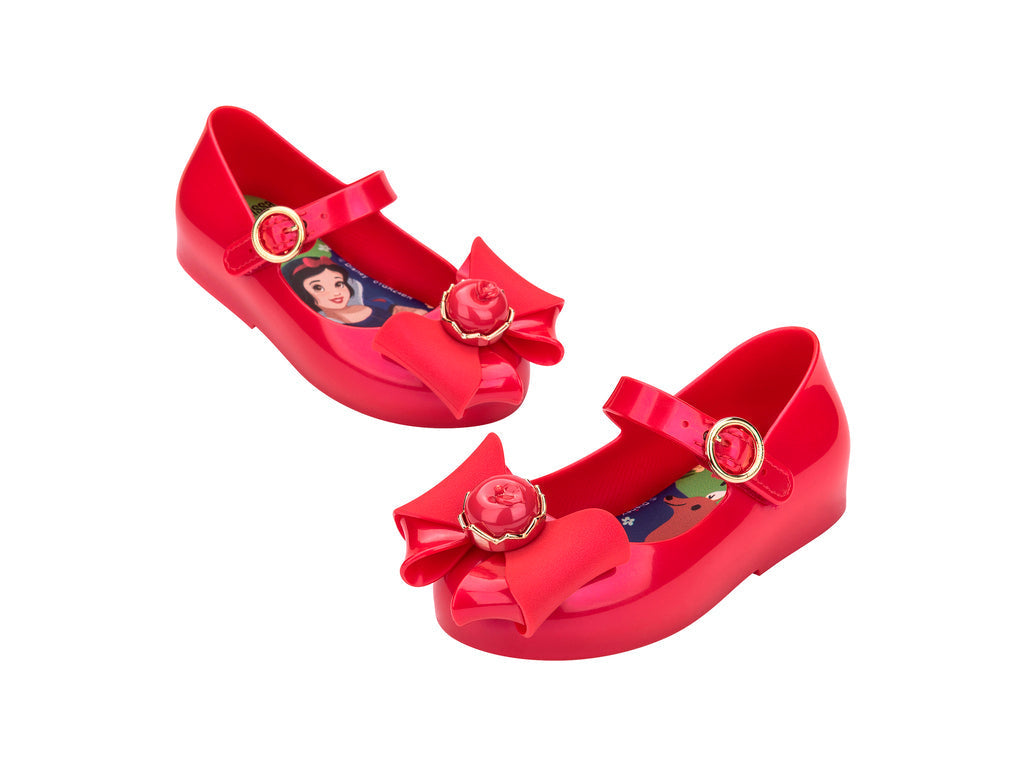 The fairest of them all, meet the Mini Melissa Sweet Love + Snow White ballerina flat. This sweet Disney collaboration brings the world of Snow White to life with a classic ballet-style shoe complete with an elaborate apple bow appliqué, a fairy tale scene on the comfy insole and varying colors to choose from.