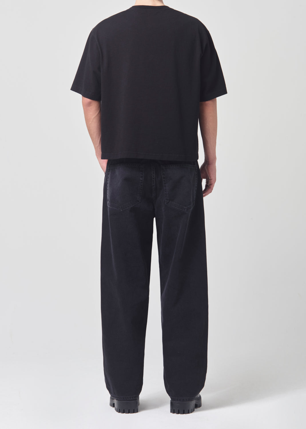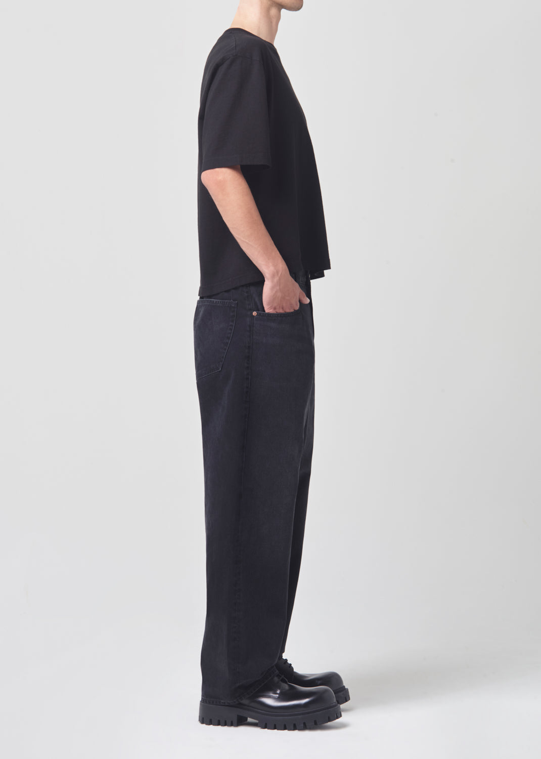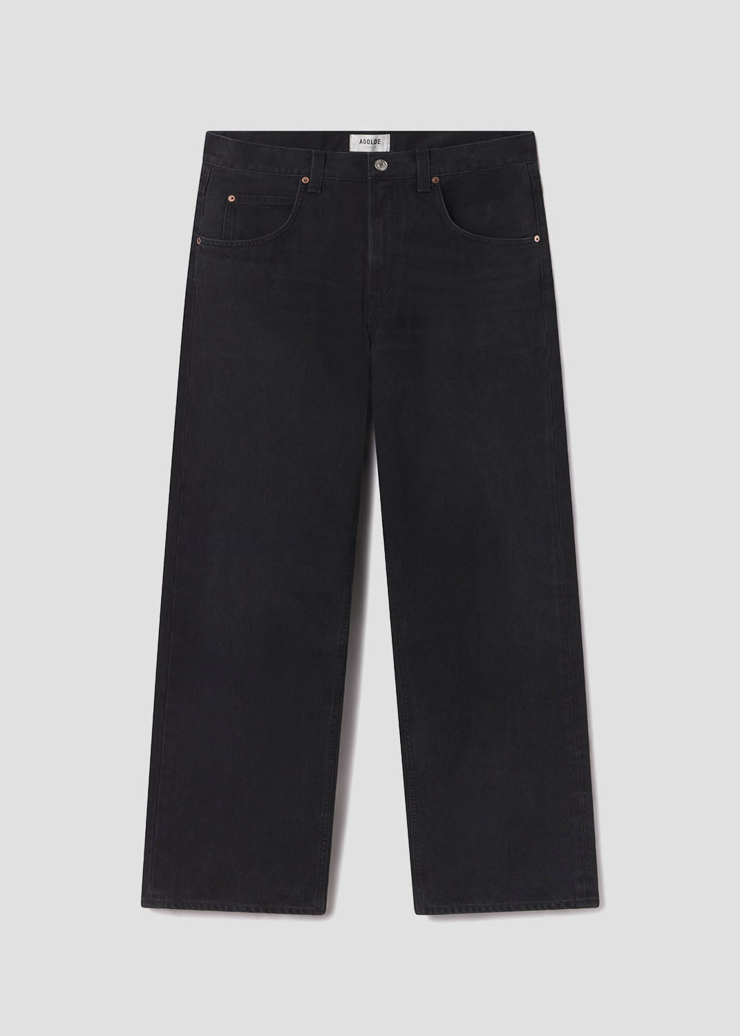 This low slung style features ultra-exaggerated pockets and an easy tapered fit.