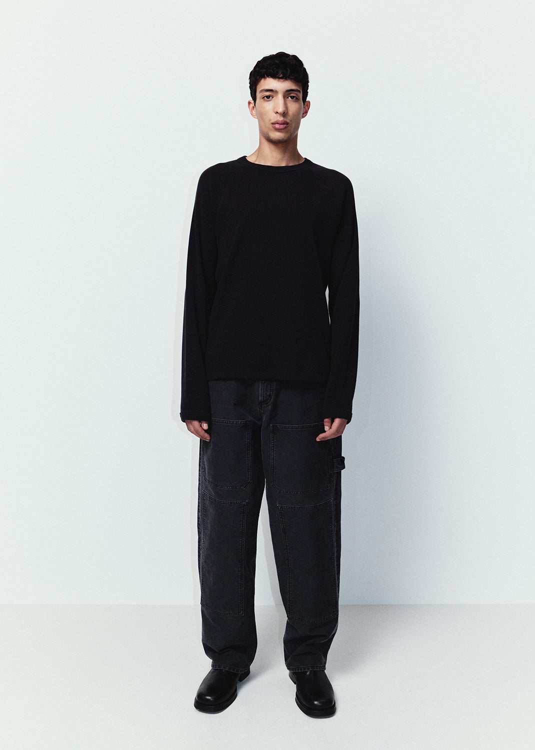 The Fusion Carpenter features a dark, washed-out black cargo pant with a hammer loop and front panel detail. Made from rigid, non-stretch twill, it has a baggy fit with a mid rise.