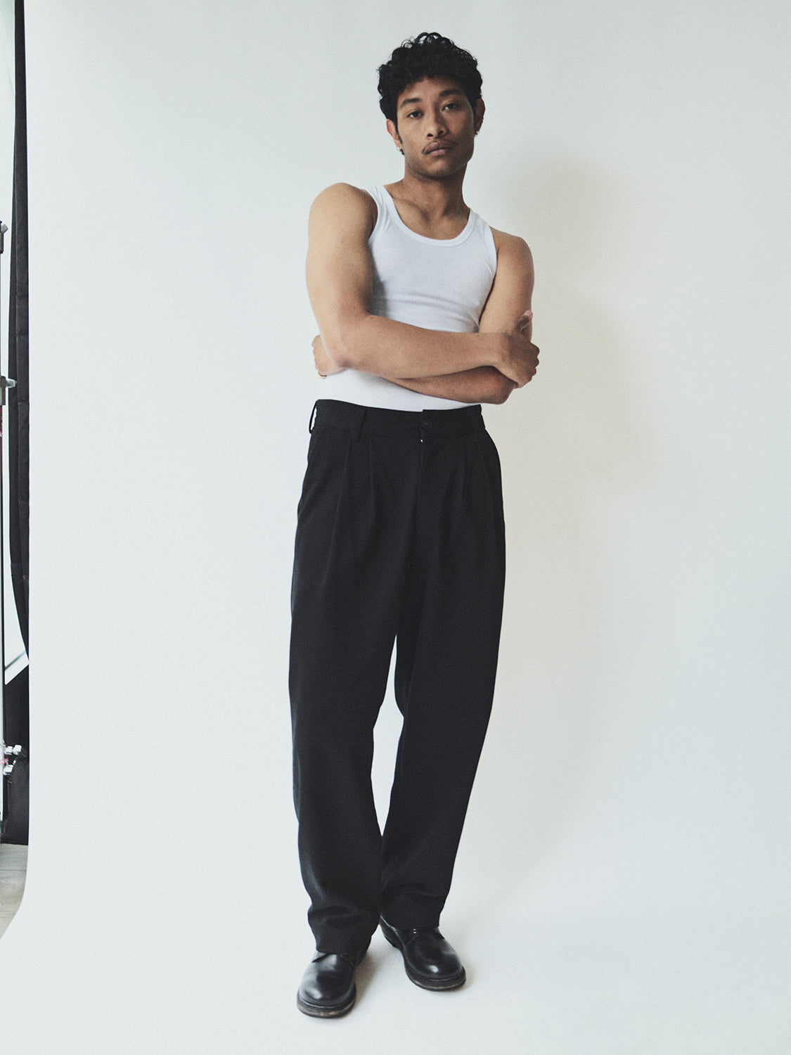 A black trouser with front pleat detailing. True to size with a relaxed, tailored fit.