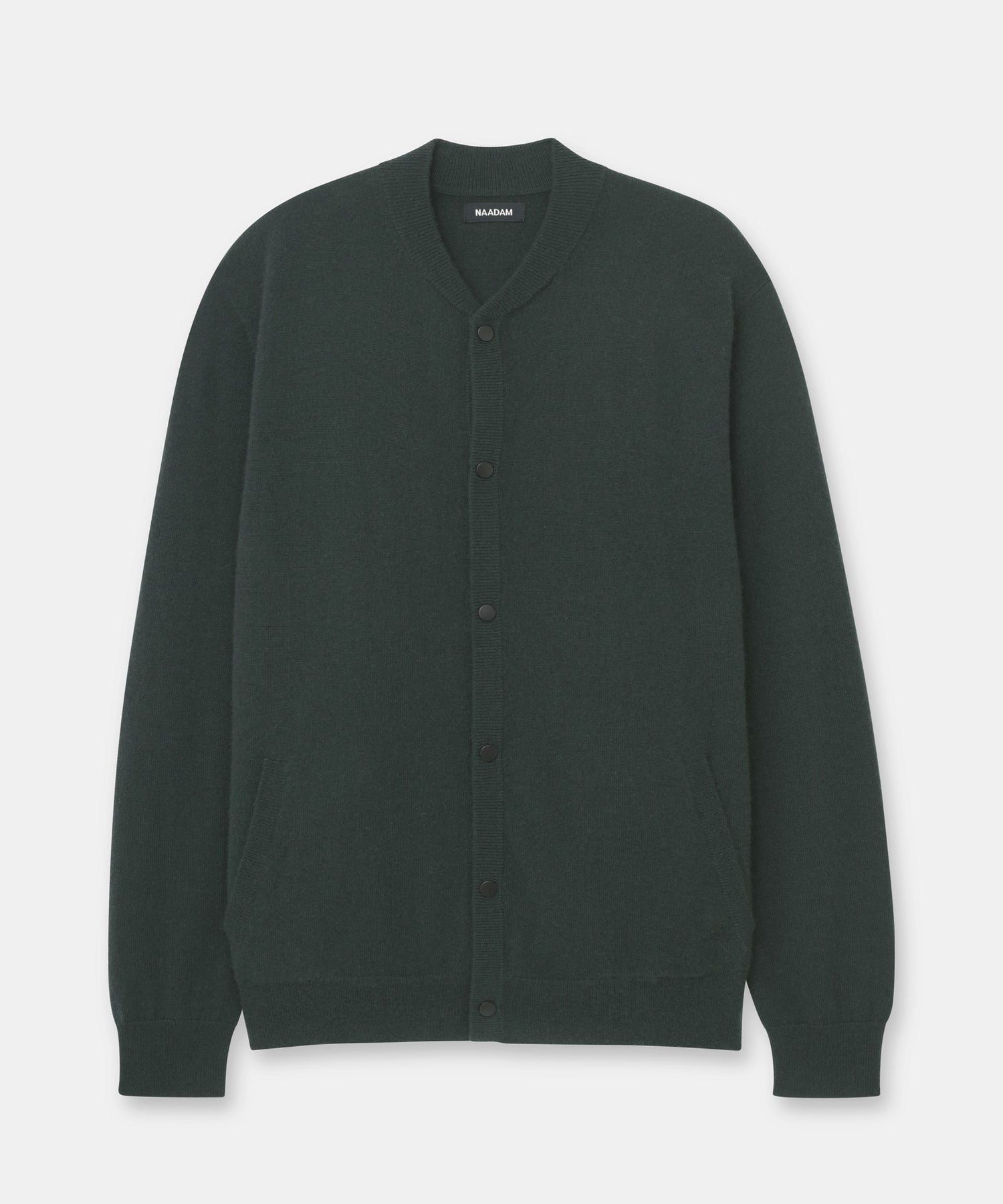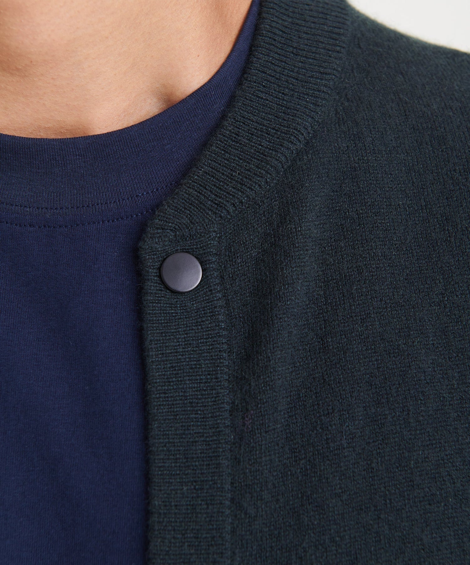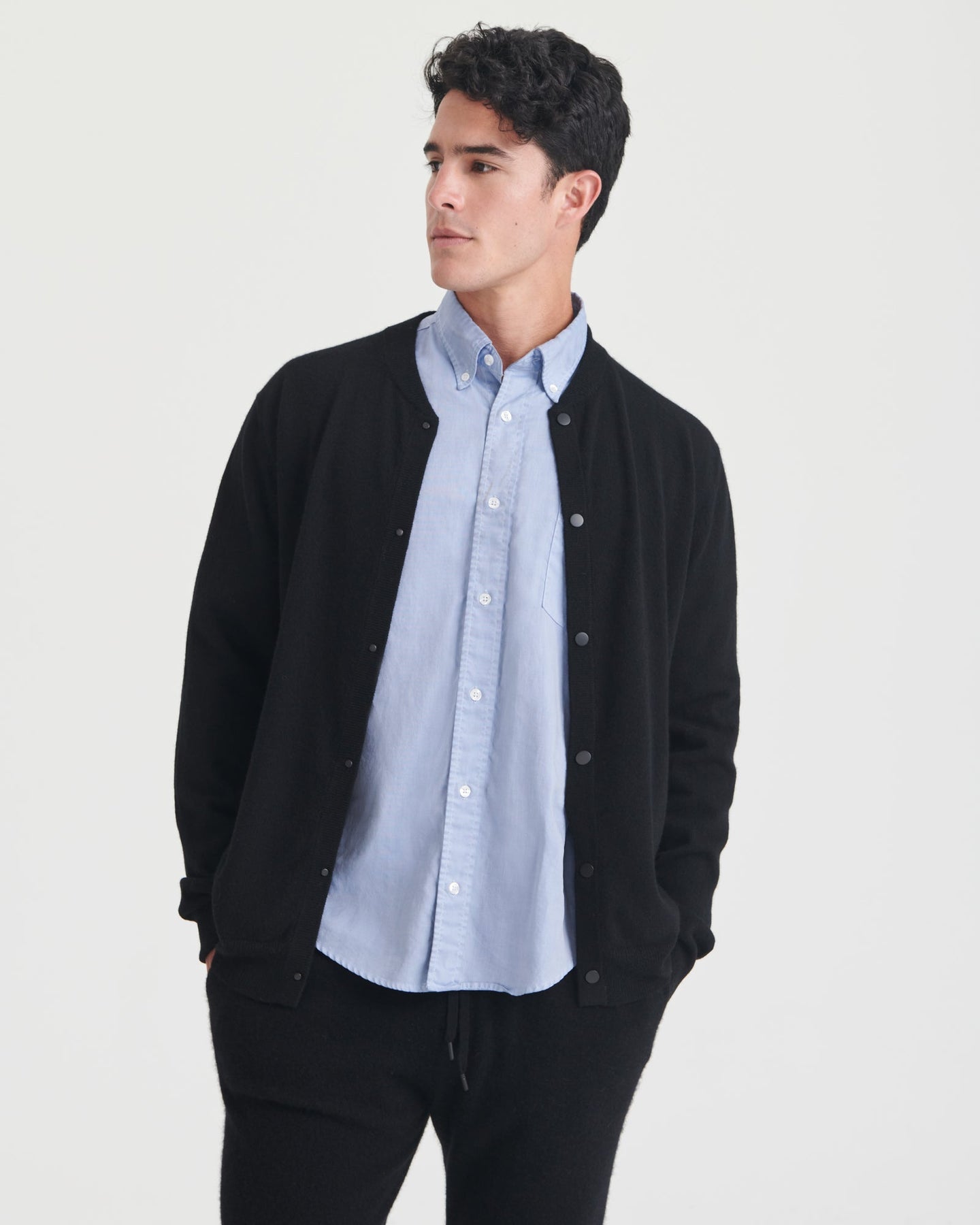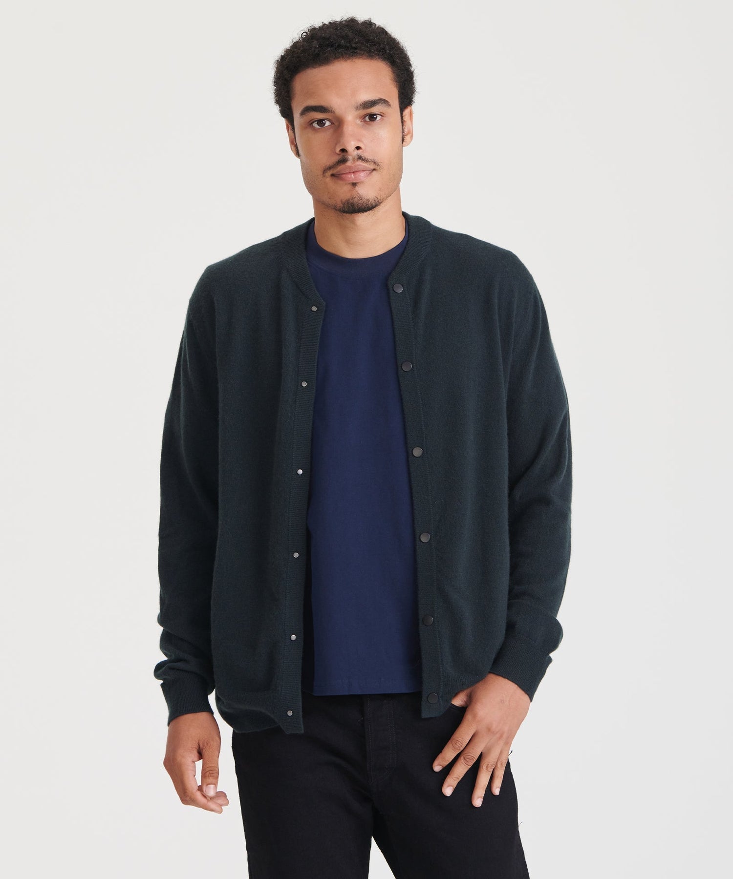 The Cashmere Bomber Cardigan is a stylish sweater jacket with a relaxed classic fit. It features ribbed details, front pockets, a full button placket, and a bomber jacket silhouette. Crafted from 100% premium, sustainable cashmere.