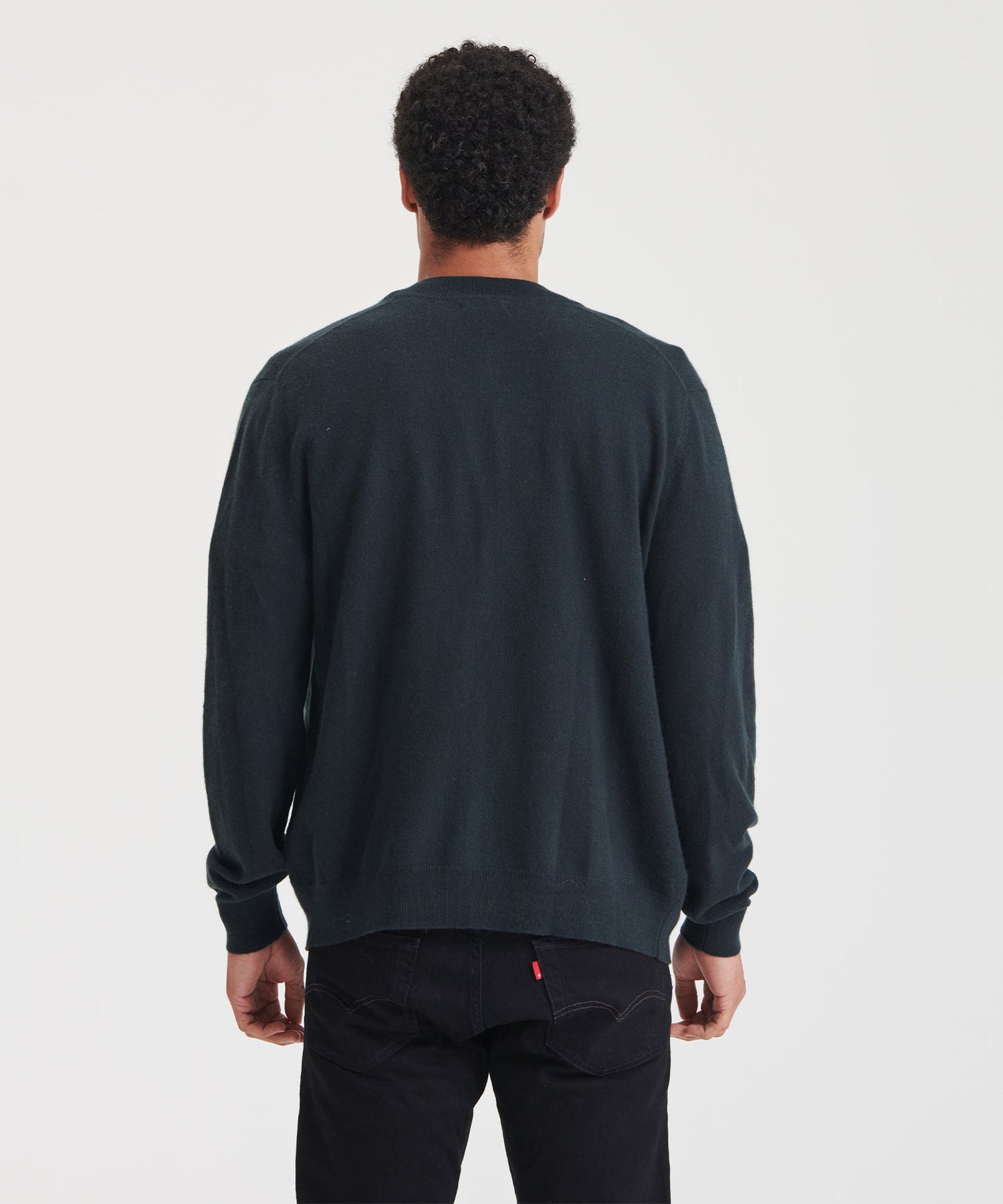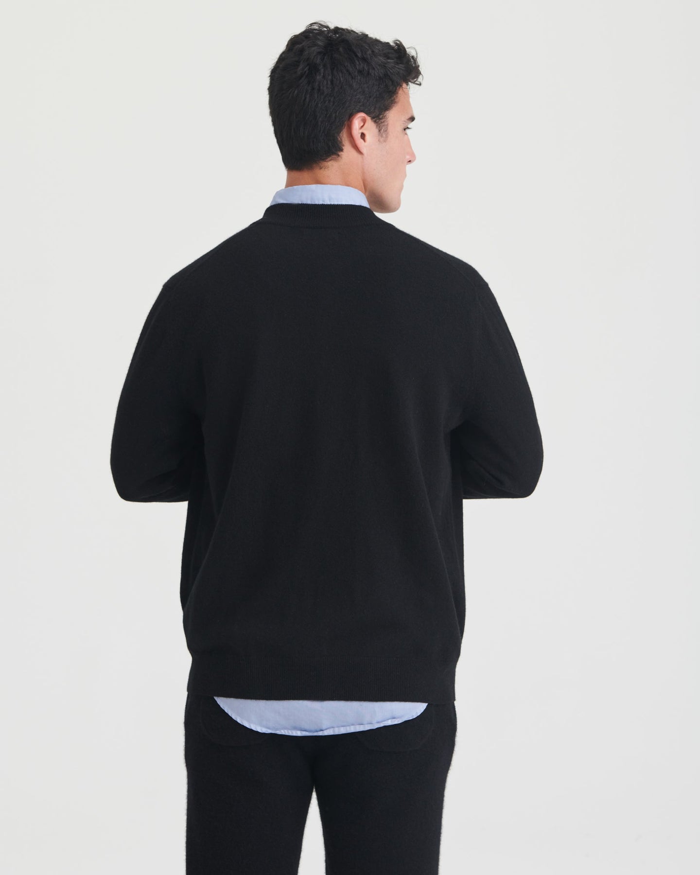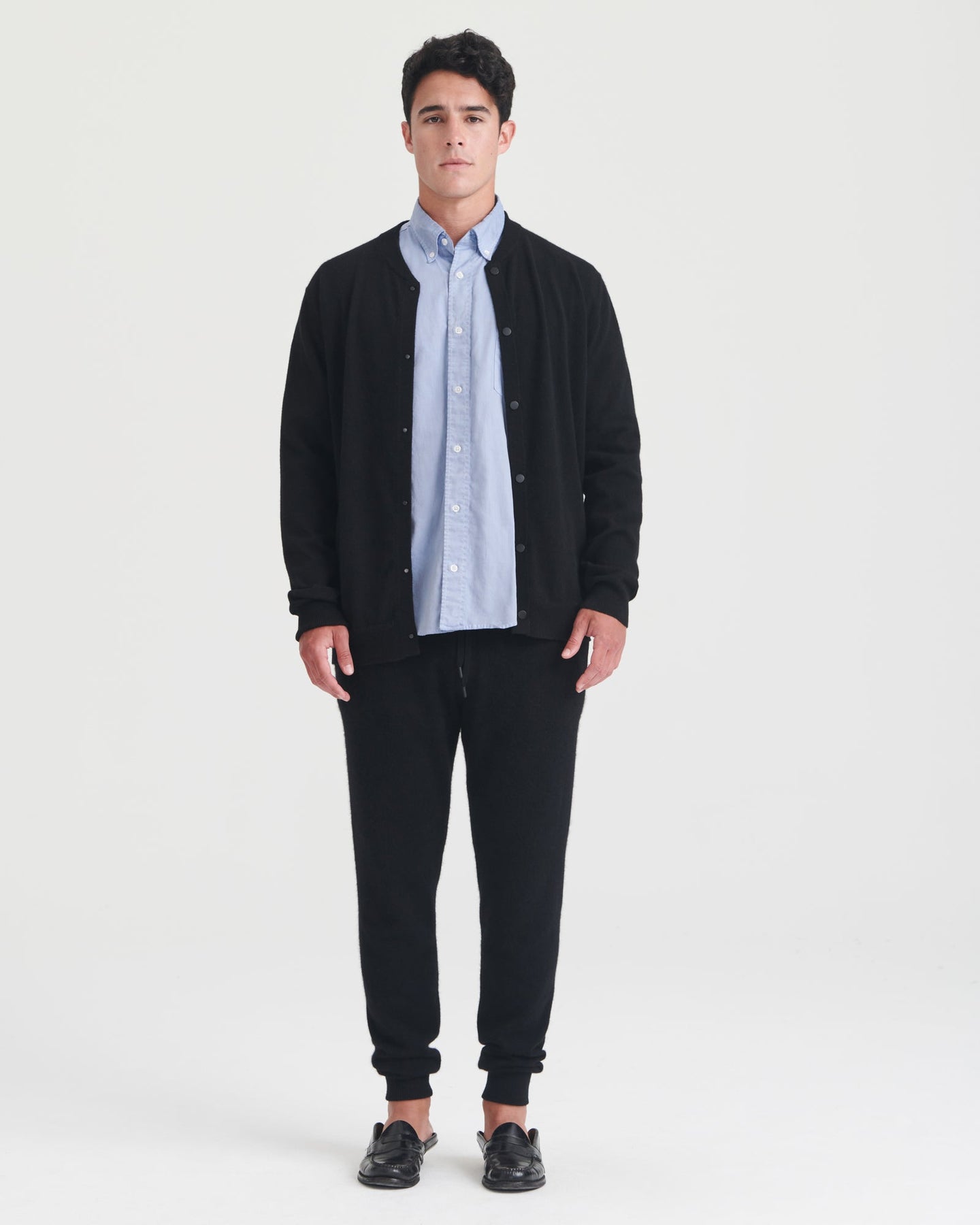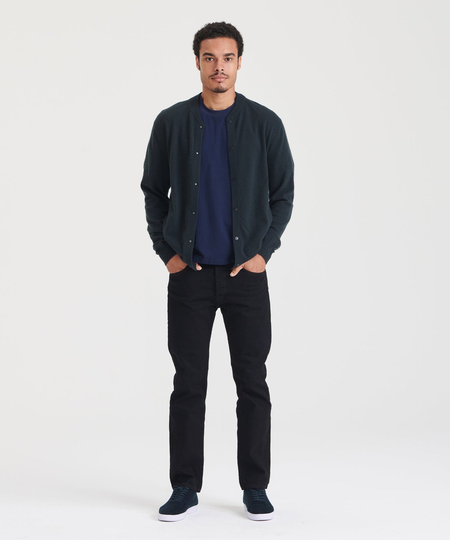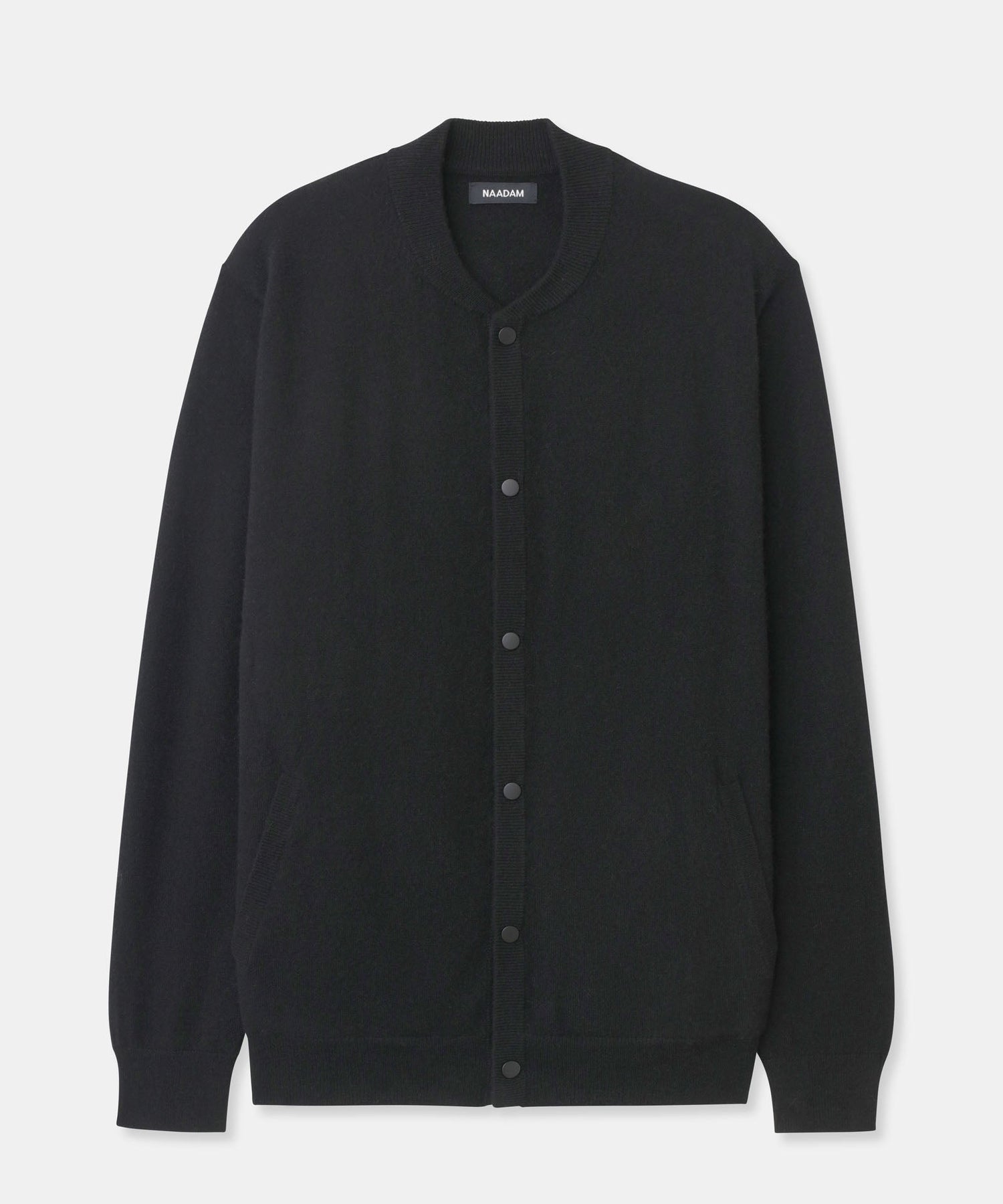 The Cashmere Bomber Cardigan is a stylish sweater jacket with a relaxed classic fit. It features ribbed details, front pockets, a full button placket, and a bomber jacket silhouette. Crafted from 100% premium, sustainable cashmere.