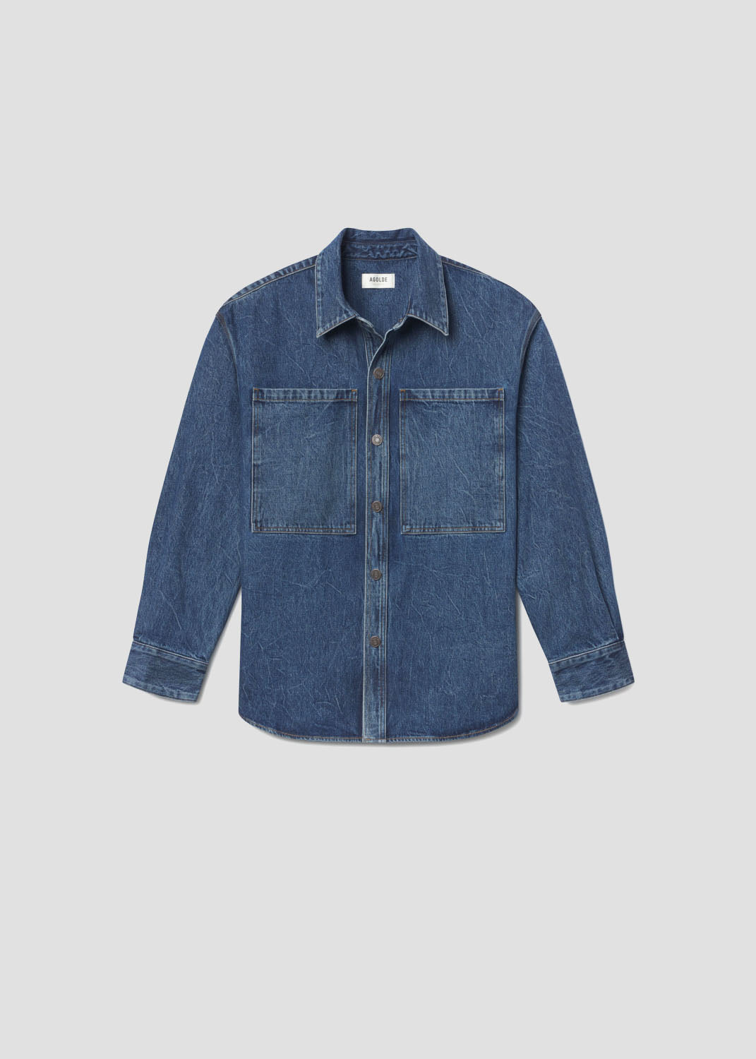 Oversized 90's inspired vintage denim shirt with triple-needle stitching detailing and elongated pockets with a snap front placket.