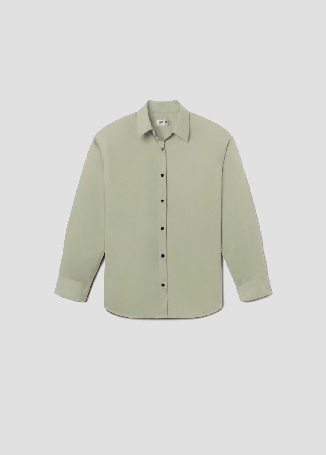 Closet core item must-have. Long sleeve poplin shirt with unique reverse seam detailing and a straight hem.