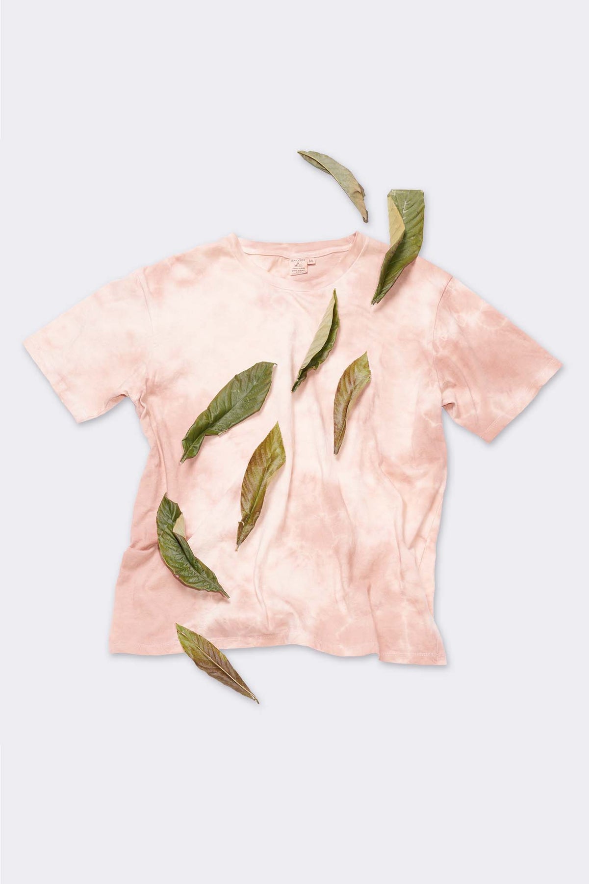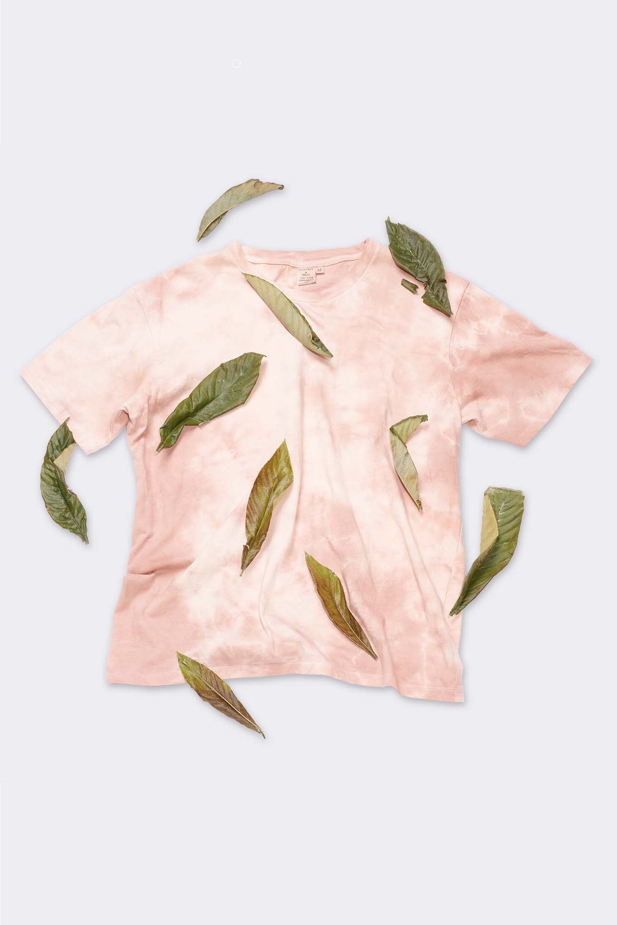 Limited edition artist made. Dyed with foraged loquat leaves by artist Sasha Duerr. Each tee has a unique pattern.