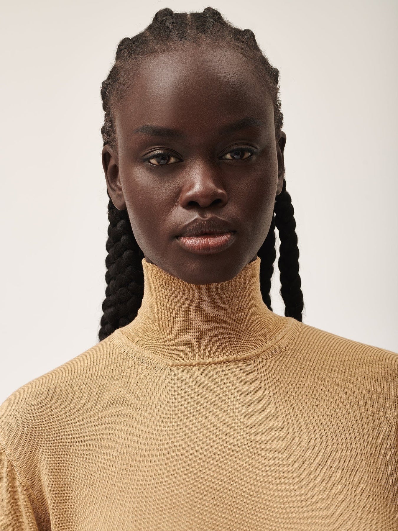 WRAP YOURSELF IN LUXURY WITH THE PANGAIA WOMEN’S REGENERATIVE MERINO WOOL TURTLENECK SWEATER IN CAMEL. MADE FROM NATIVA™-CERTIFIED REGENERATIVE MERINO WOOL, THIS SWEATER OFFERS A SOFT, WARM FEEL WITH A COMMITMENT TO DURABLENESS.