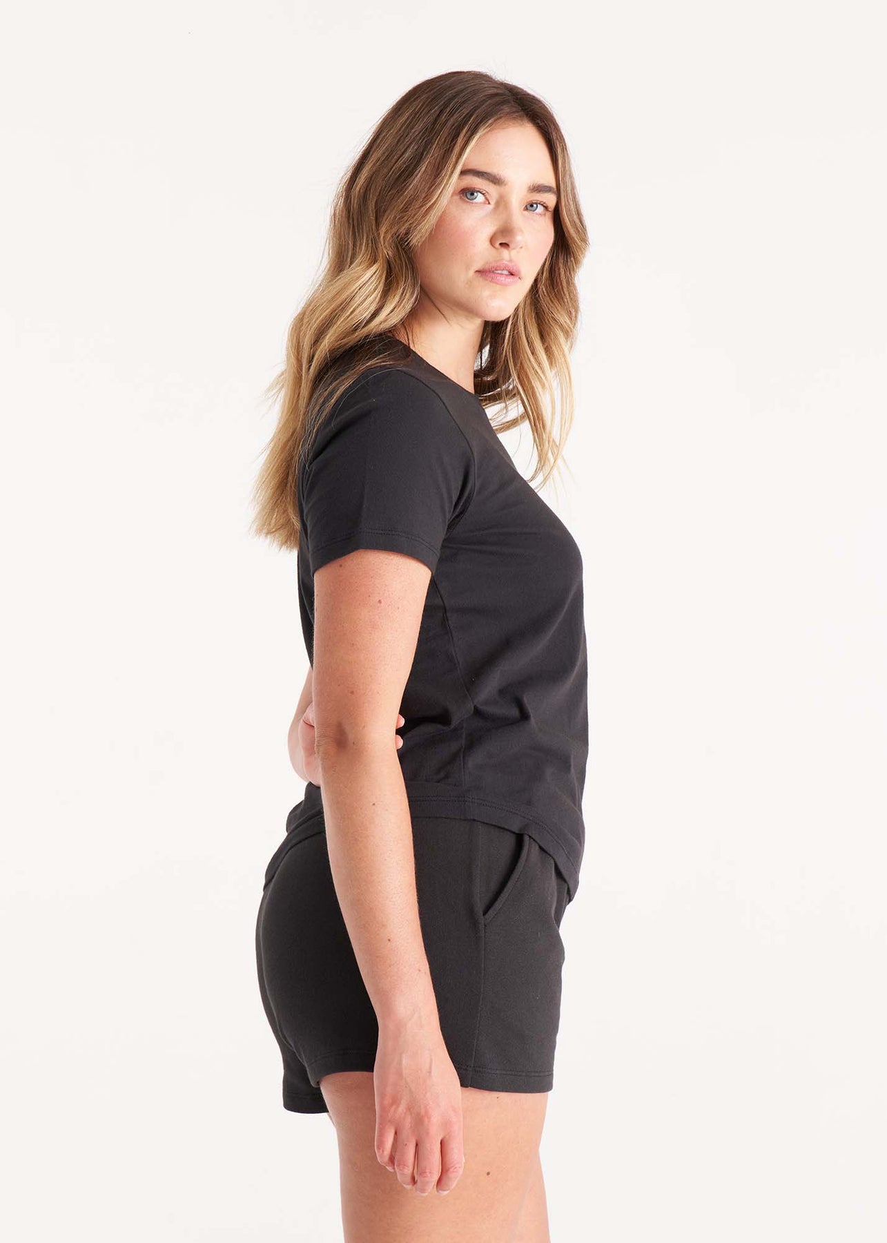 Simple luxury, zero fuss. Our women's crew neck tee is crafted from organic and recycled cotton jersey for softness, breathability, and planet-friendly wear. Designed with a relaxed fit and short sleeves, it's your go-to for effortless style on easygoing days. Ethically made in Los Angeles with eco-friendly dyes.