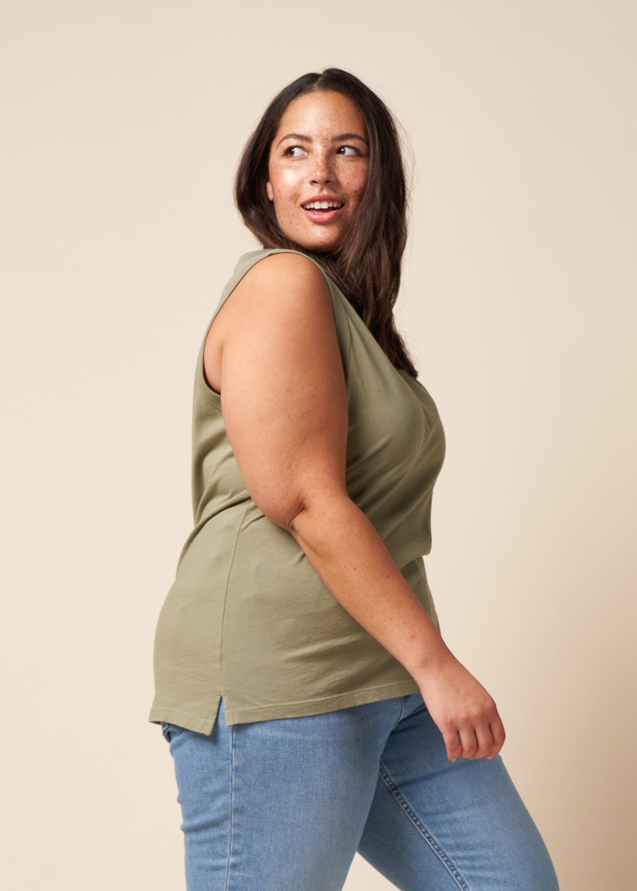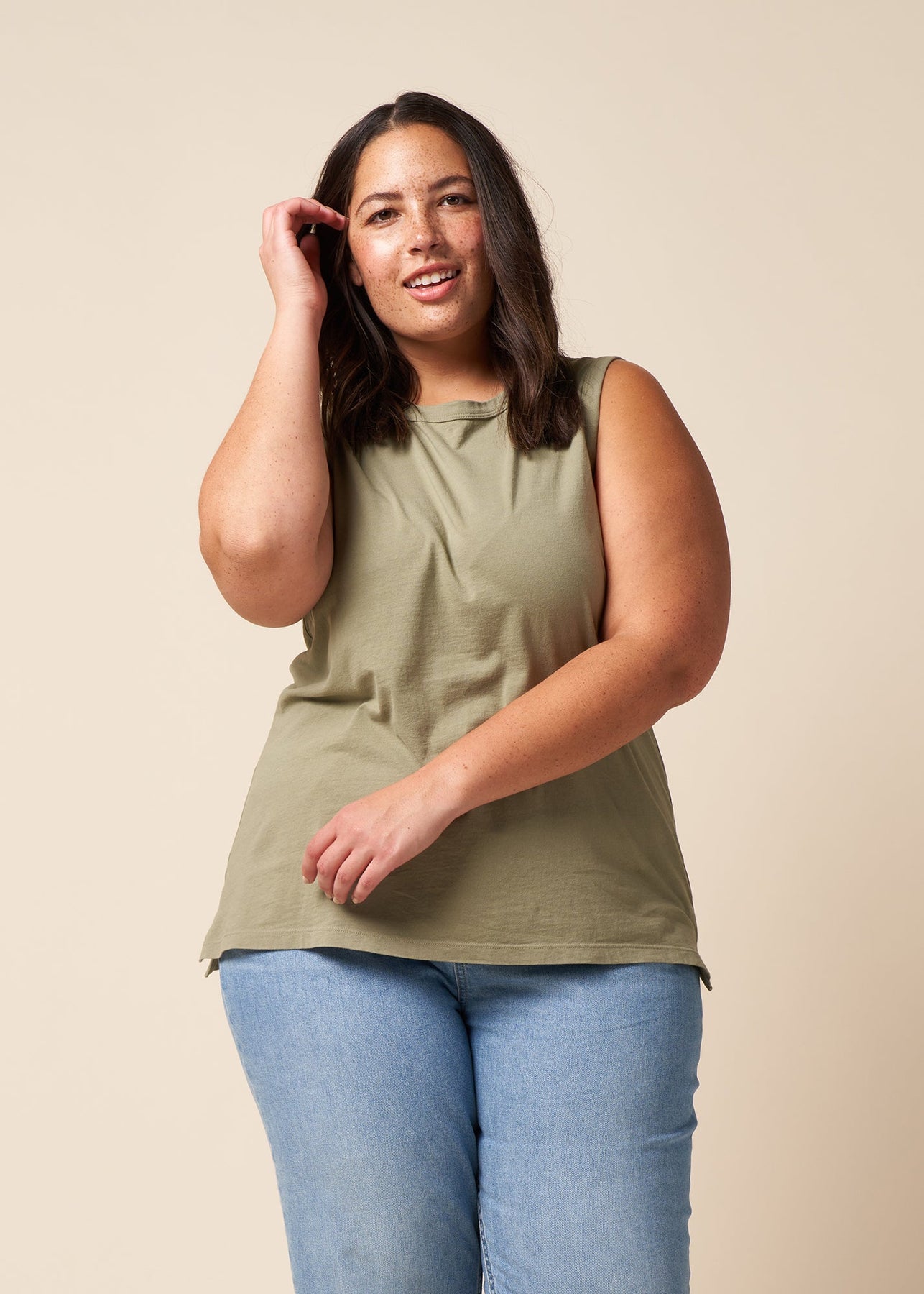 Mix it up. Tuck in, tie, let loose – whatever you fancy – this loose-fitting tank pairs with anything from your favorite high waisted jeans to our Classic Jogger. Generous in length, side slits at hem, and binding at neck and arms complete this tank for a modern vintage look. Made of recycled and organic cotton, it’s soft feel and lived in wash comes from our non-toxic and low impact dyes.