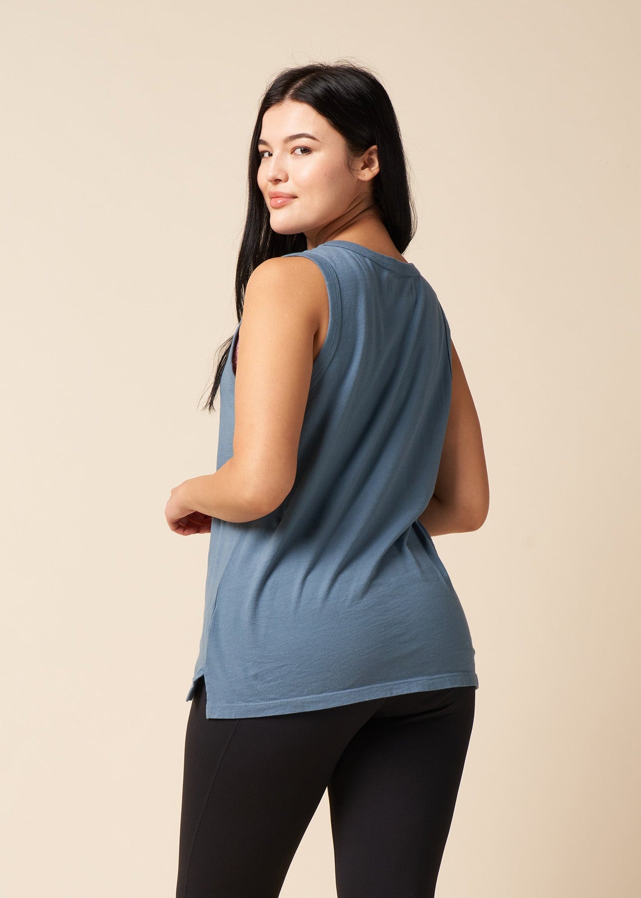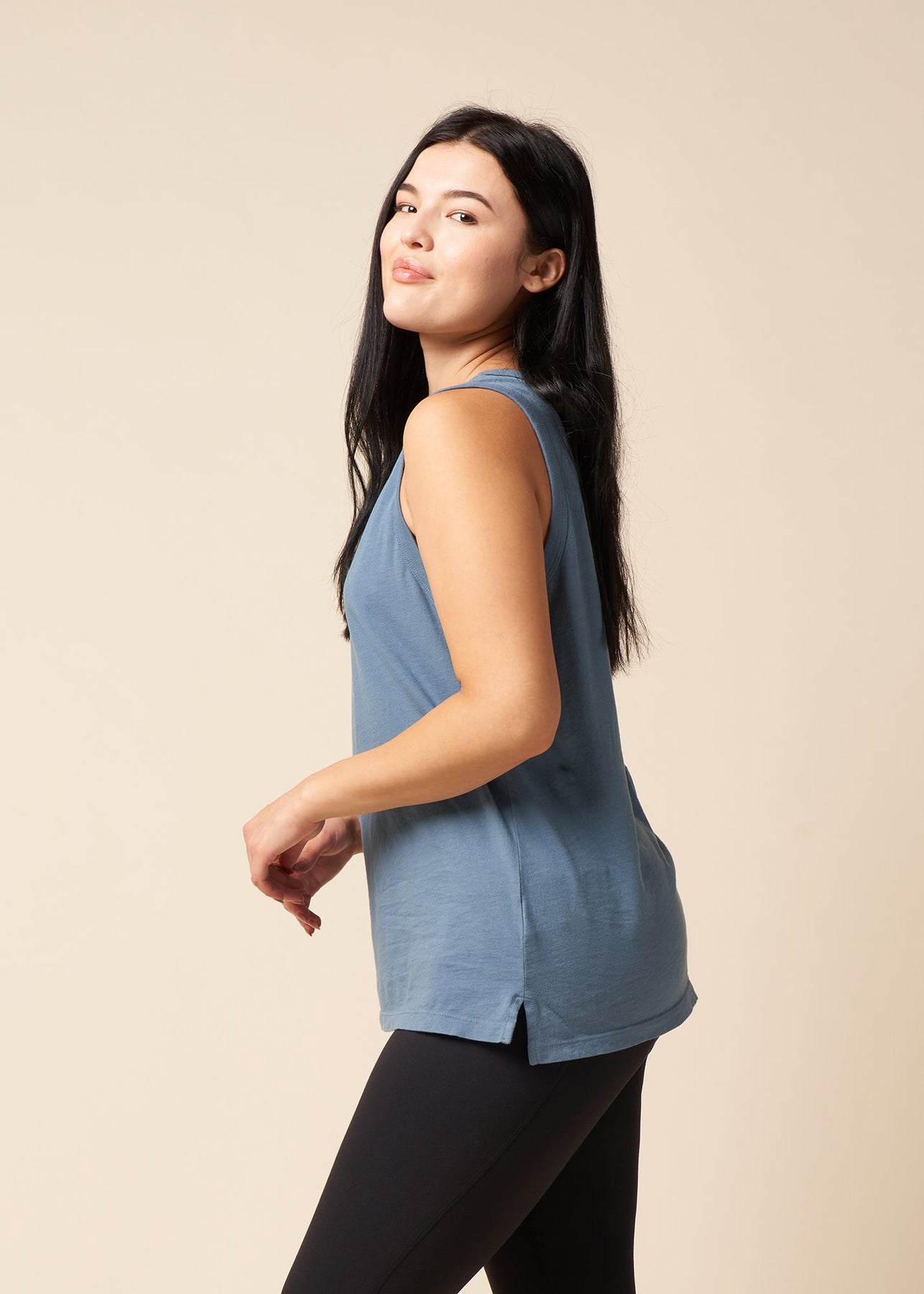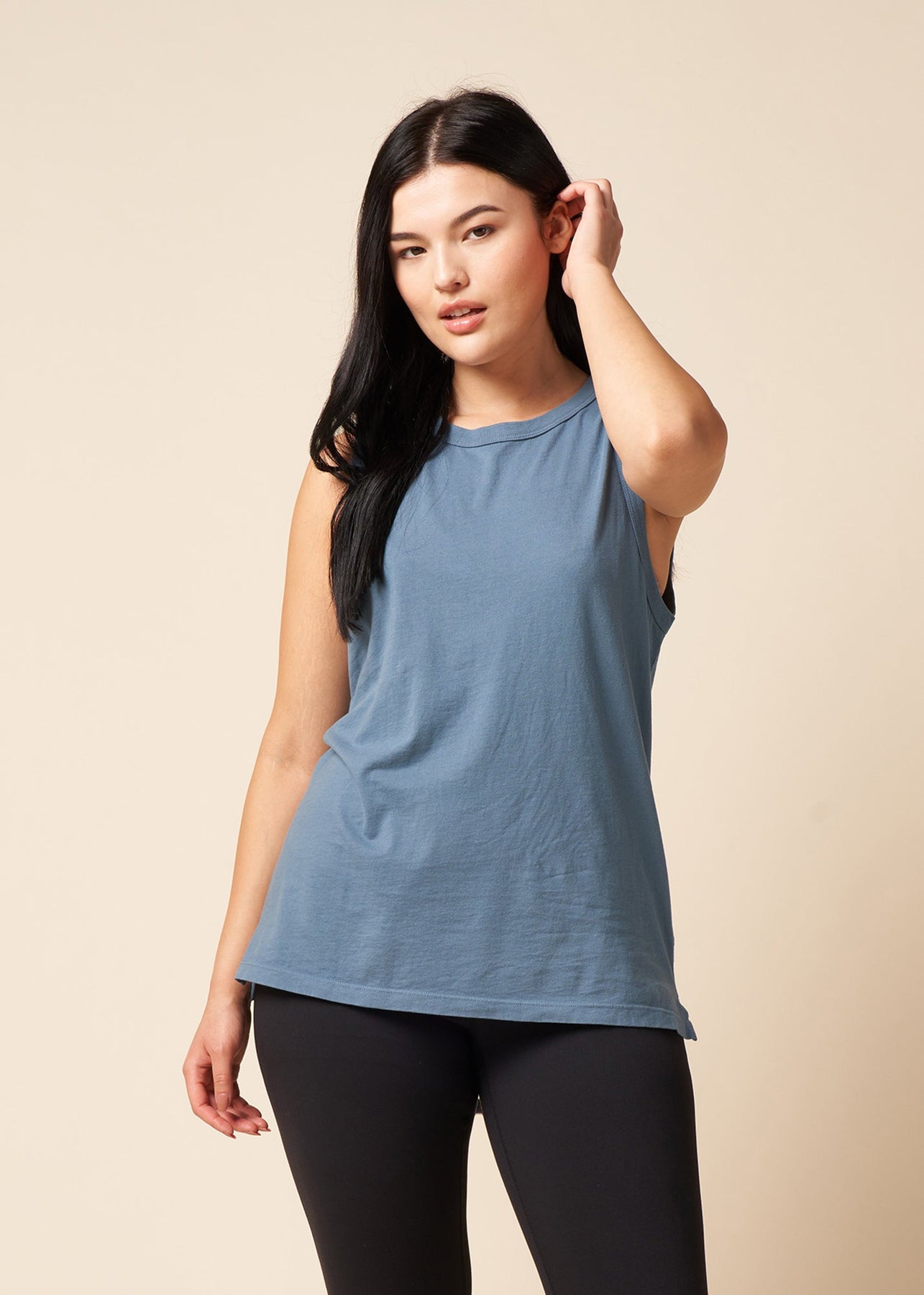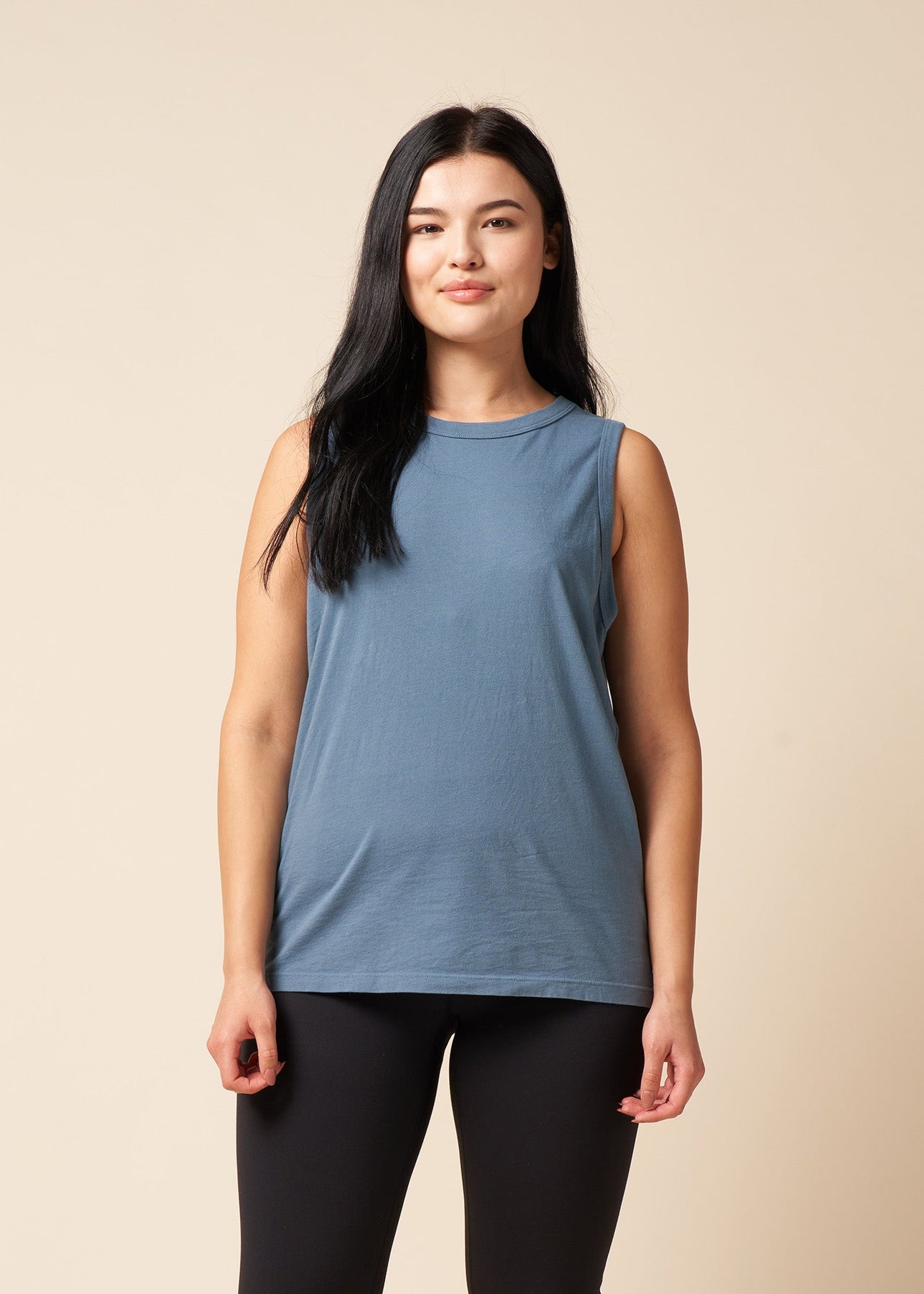 Mix it up. Tuck in, tie, let loose – whatever you fancy – this loose-fitting tank pairs with anything from your favorite high waisted jeans to our Classic Jogger. Generous in length, side slits at hem, and binding at neck and arms complete this tank for a modern vintage look. Made of recycled and organic cotton, it’s soft feel and lived in wash comes from our non-toxic and low impact dyes.