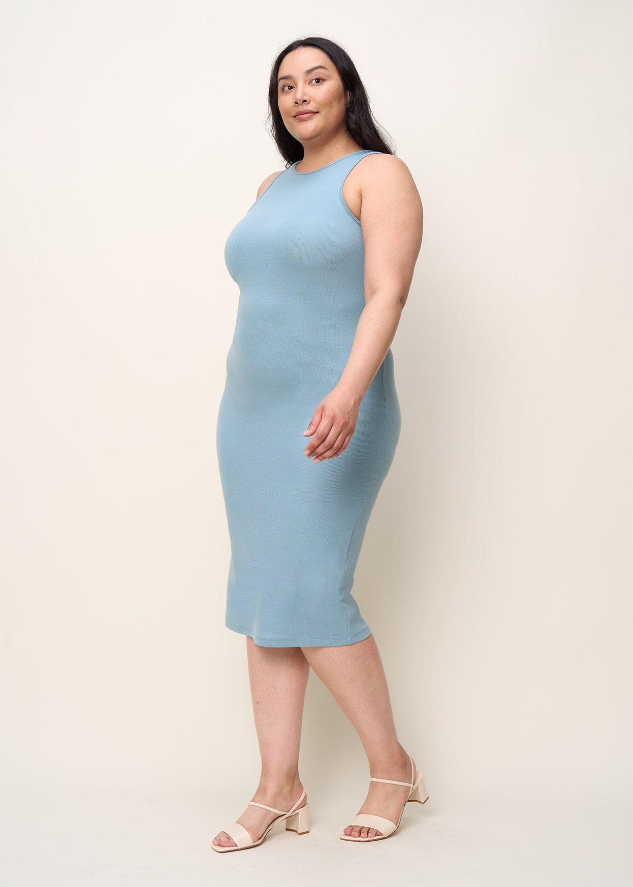 Our racerback midi blends style, comfort, and sustainability in one timeless piece. Made in Los Angeles from super soft, breathable Tencel™ Lyocell stretch rib knit, it features a bra-friendly racerback, flattering bodycon fit, and eco-friendly dyes. From casual days to parties and vacations, this versatile dress is made to move with you.