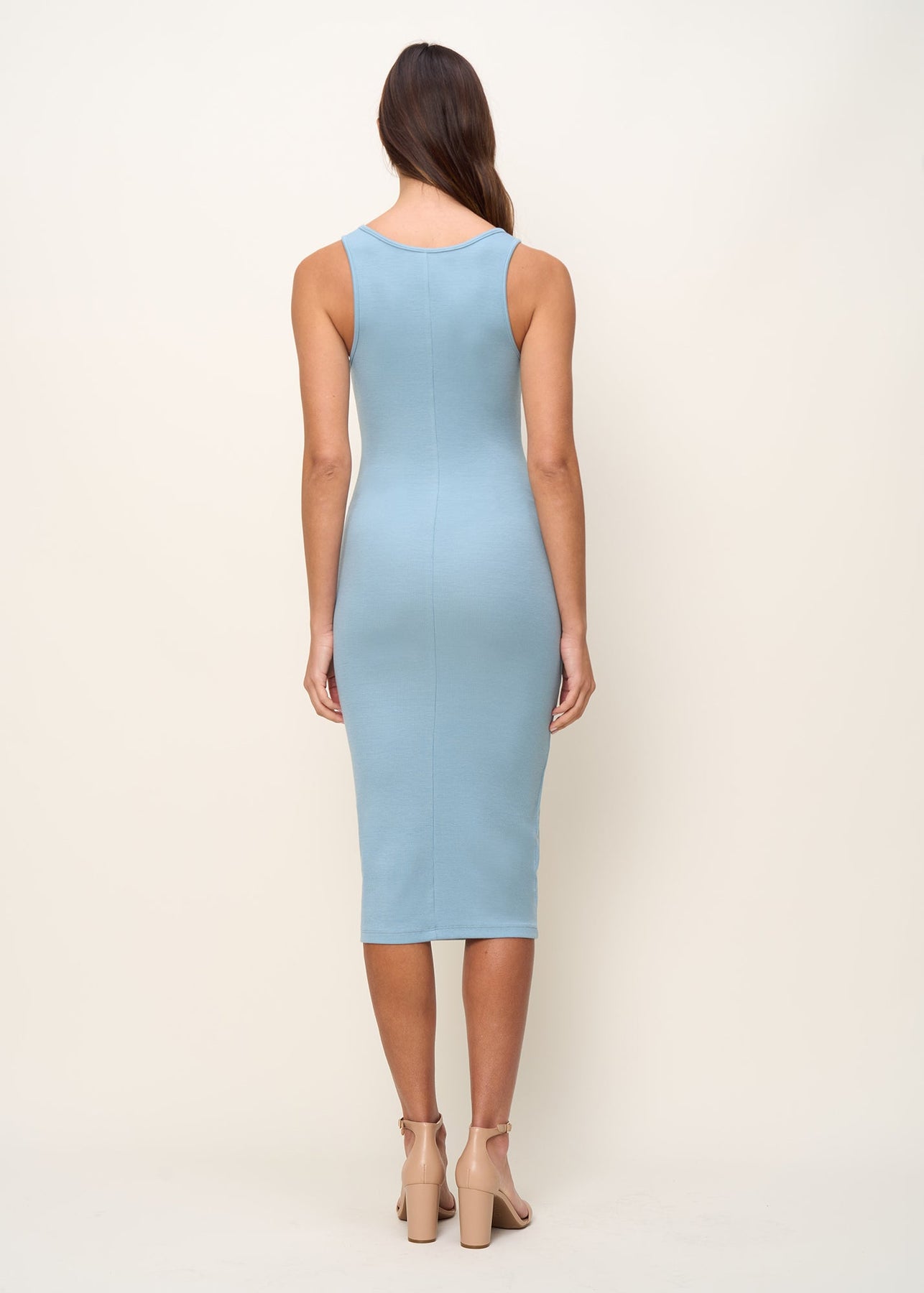 Here's the scoop... Our sleeveless midi dress is crafted in Los Angeles from soft, breathable Tencel™ Lyocell stretch rib knit. With a bra-friendly scoop neck and flattering bodycon fit, it's designed for comfort and confidence - whether for casual days or special occasions. Finished with eco-friendly dyes, it's a sustainable staple made to celebrate every figure.