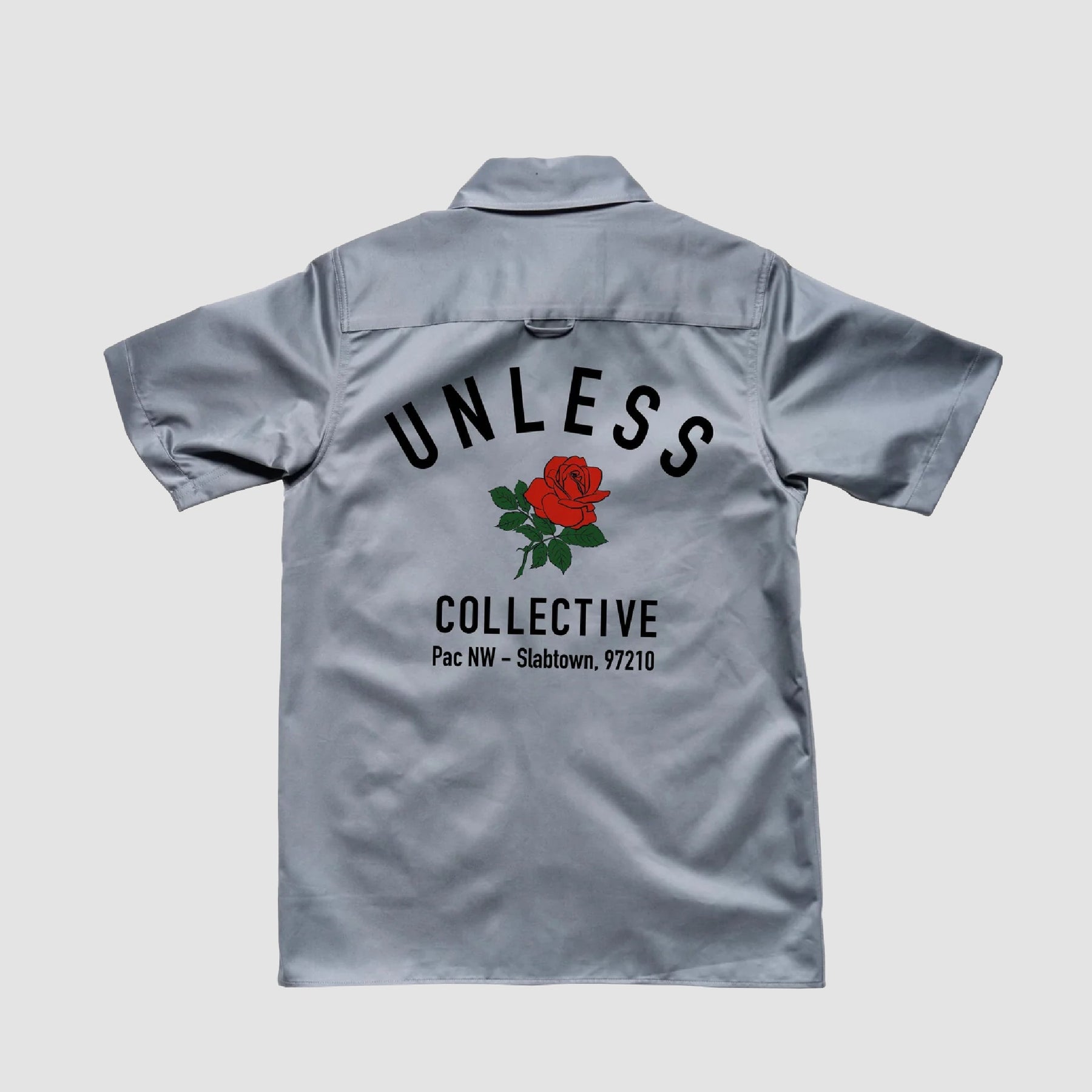 Check out our take on the traditional work shirt. We’ve embellished ours with a premium printed UNLESS Collective rose graphic on the back and a name tag on the front. This is one work shirt you might not want to get dirty.