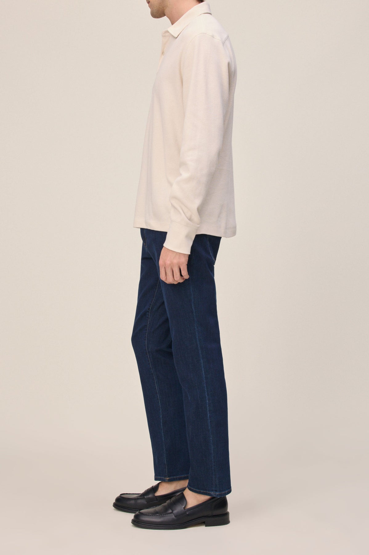 Our most popular slim fit jeans are sharp but not skinny, a silhouette we first fell for in Amsterdam. Crafted from high retention fabric that’s engineered to prevent baggy knees and saggy waistbands, it’s versatile, high performance denim that’s extremely durable and easy to dress up or down. Midnight is a versatile dark wash with contrast metallic hardware and tonal stitching.
