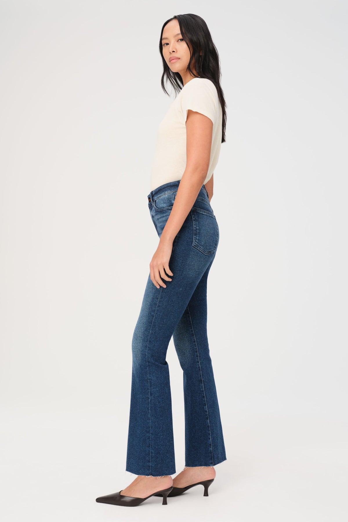 NAO is a fresh take on this season's bootcut trend. Cut with a high waist, sculpting stretch, and punctuated with a leg-lengthening slim flare. Huntington is a dark indigo wash with a raw hem.