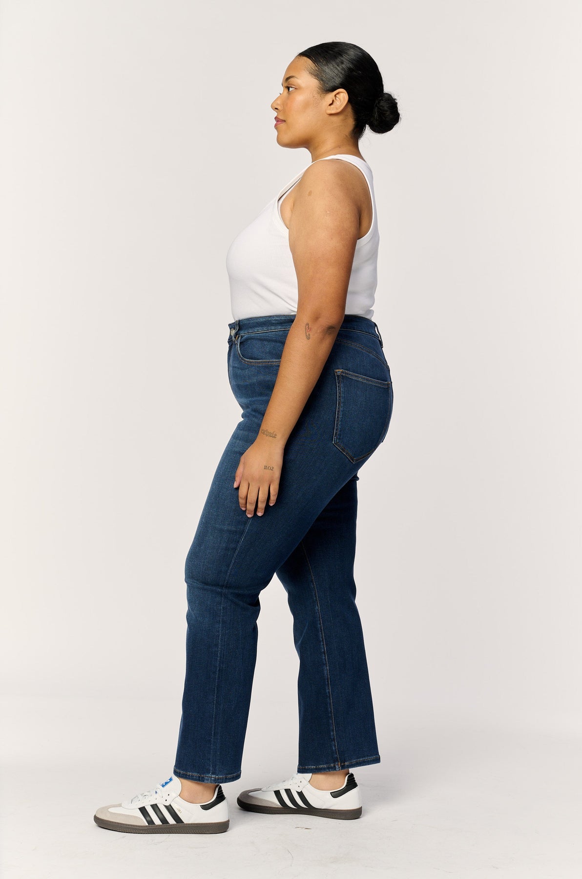 Denim meets yoga pants for the most comfortable jeans you'll ever own. ASE Stretch is our bestselling high-rise straight fit with extra stretch and a super-soft feel. It’s your favorite jean upgraded with maximum comfort for long flights, long walks, and long hours at your desk.Vroom is a dark wash denim with authentic fading and character throughout. It features a brushed silver shank and antique copper rivets, golden brown thread, zip fly and a clean hem.