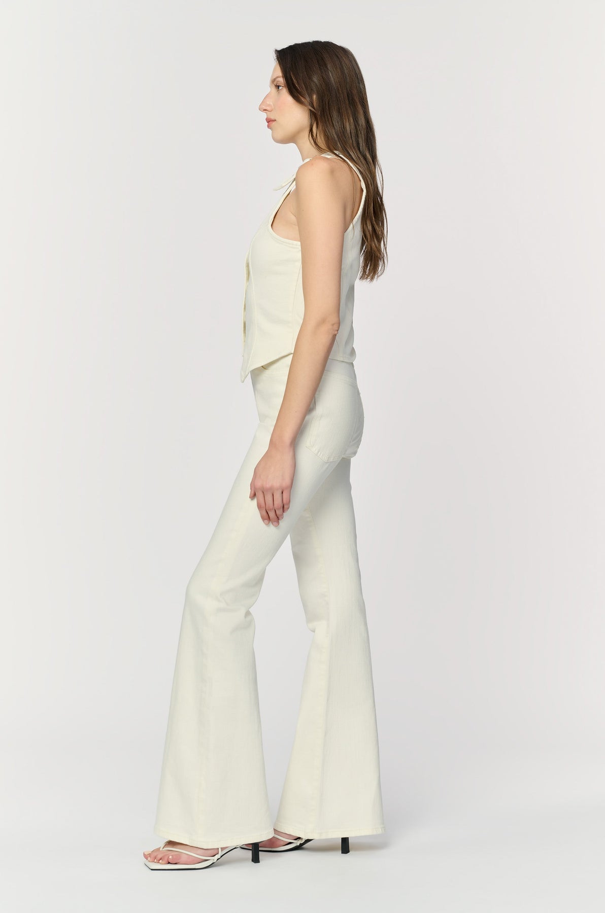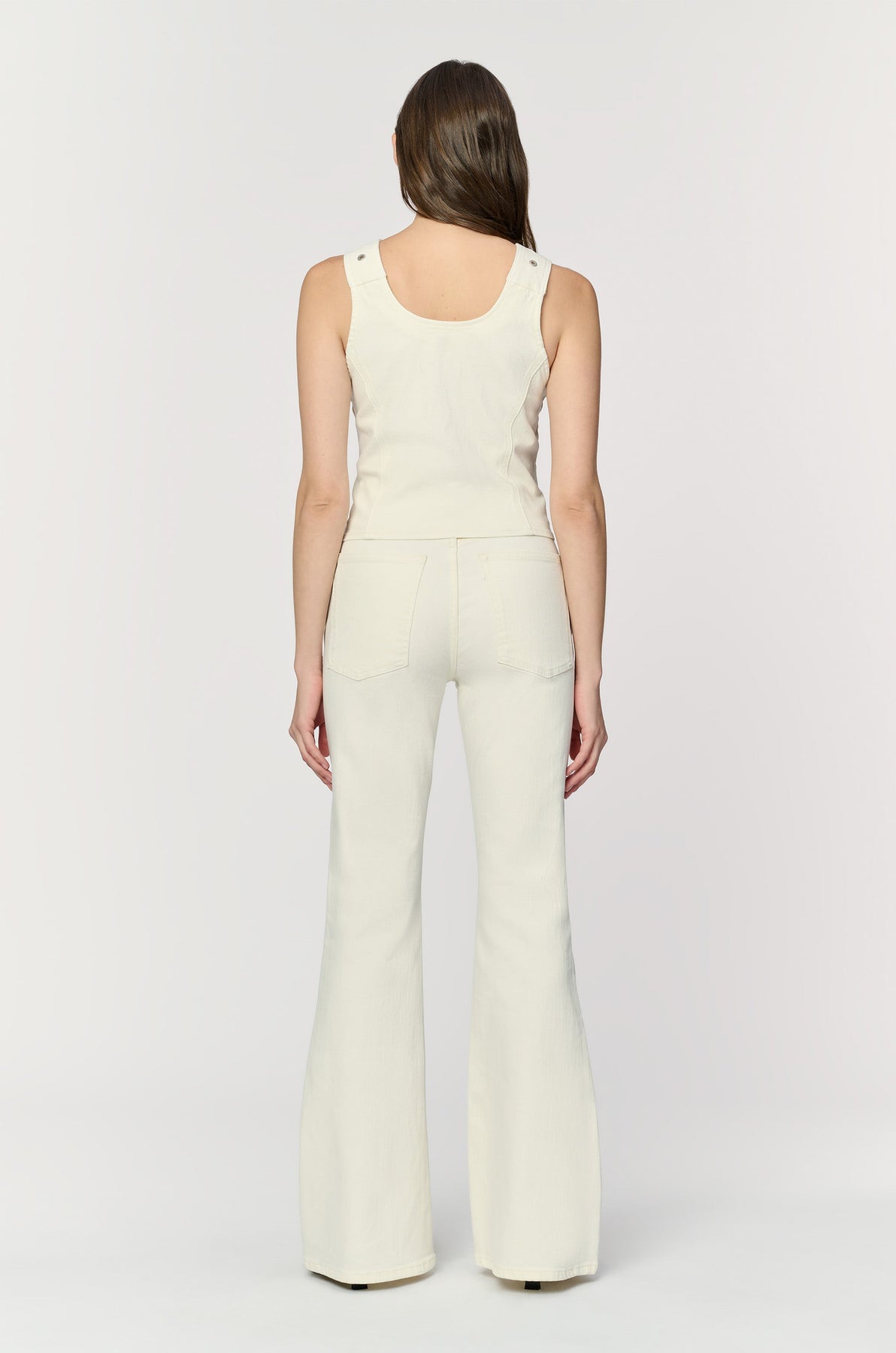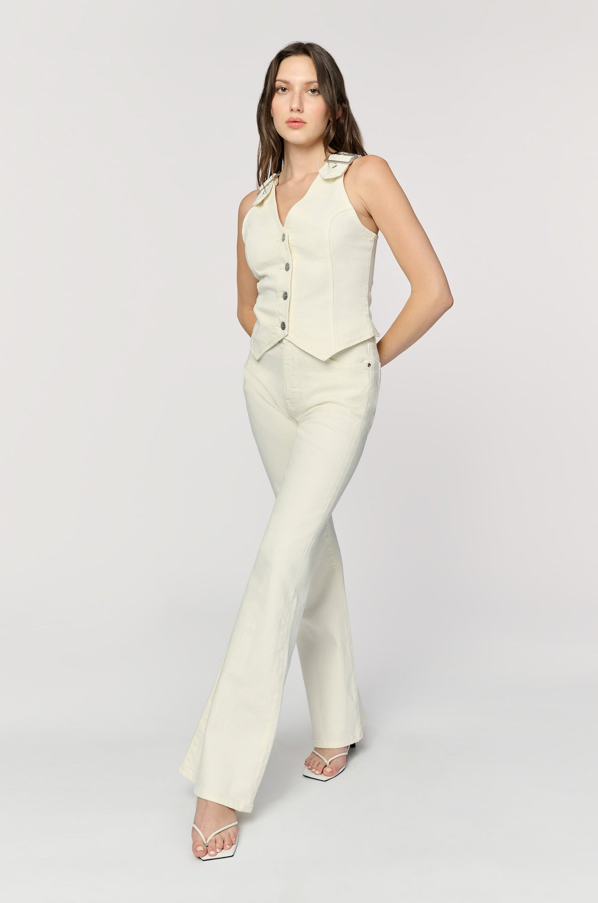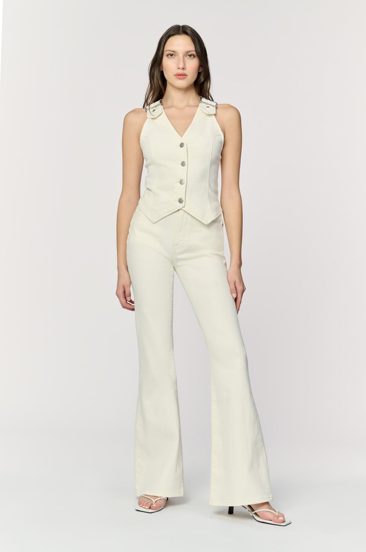 Created at the crossroads of bespoke tailoring and classic denim details, the JNB Vest has the perfect, contoured fit with statement-making hardware. It features metal buckles at the shoulders, center front button closure and denim-inspired double seam detailing. Cloud is a warm, off white wash. It features silver shank center front opening, adjustable silver buckle shoulder straps, khaki stitching and a clean hem.