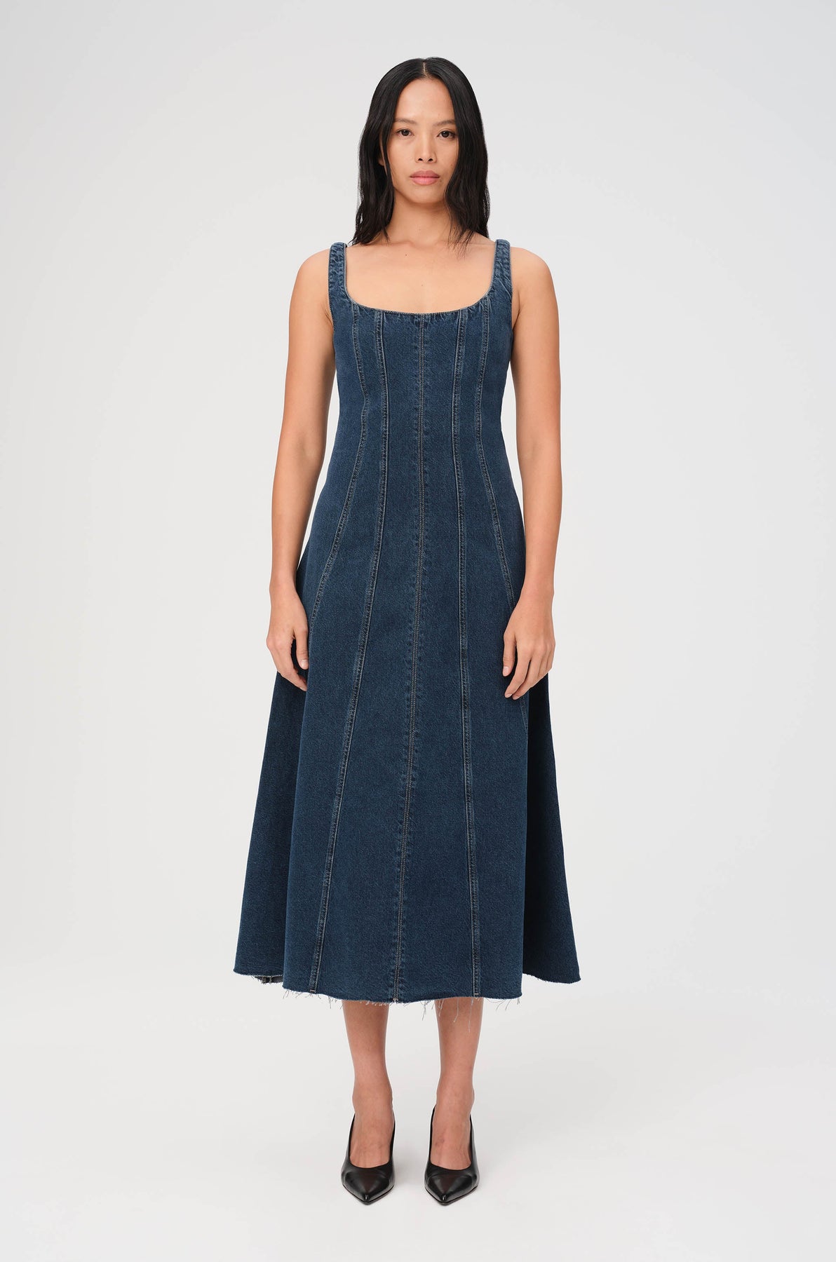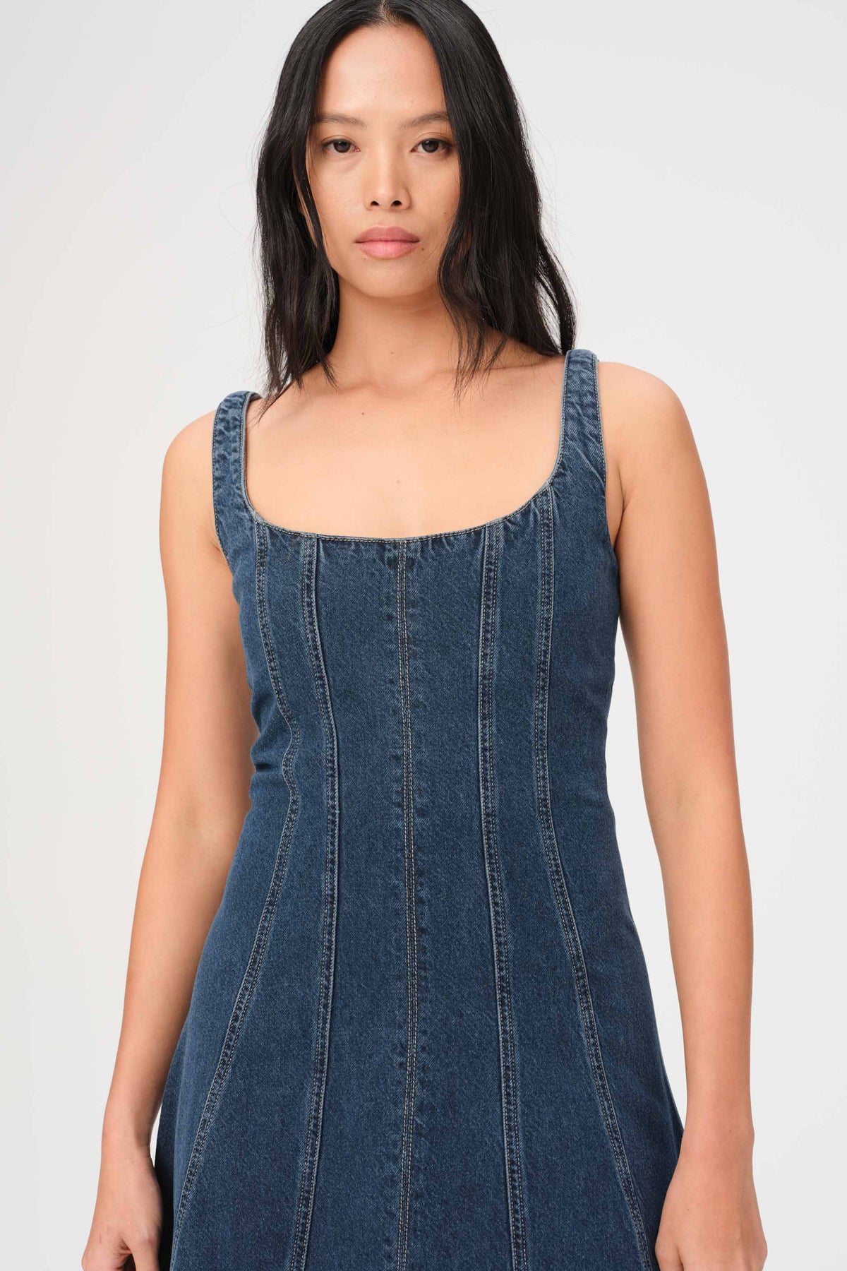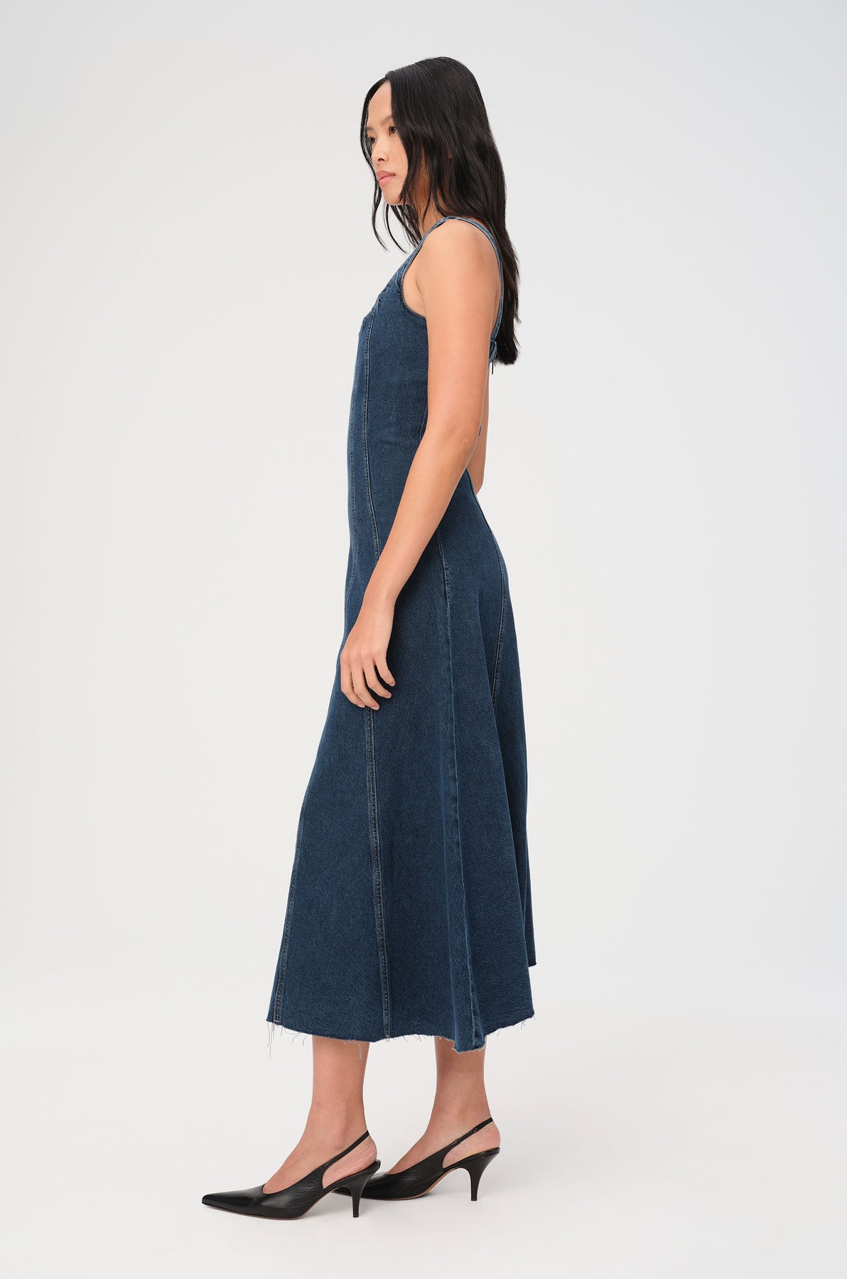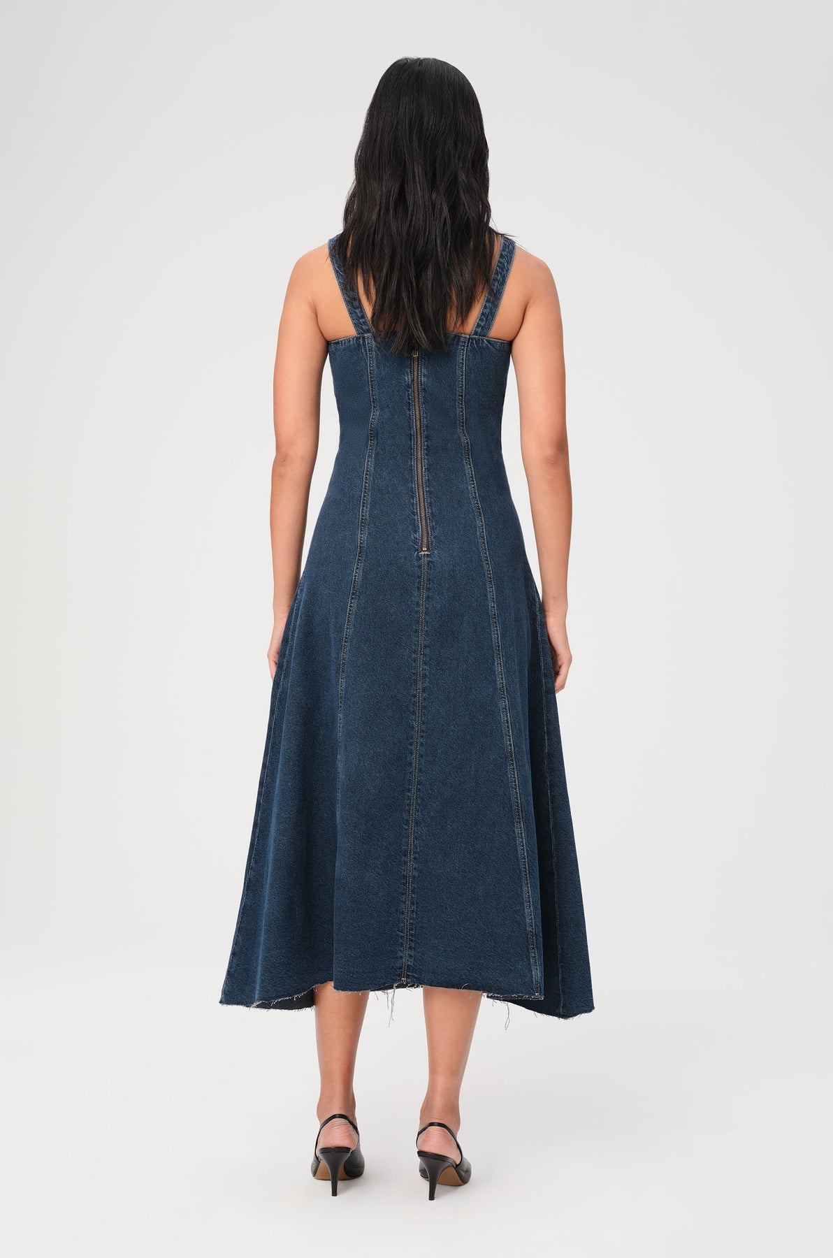 Under Pressure is a mid-to-dark indigo wash. It features a brushed silver zipper at the center back, adjustable back straps, khaki stitching, and a clean hem.