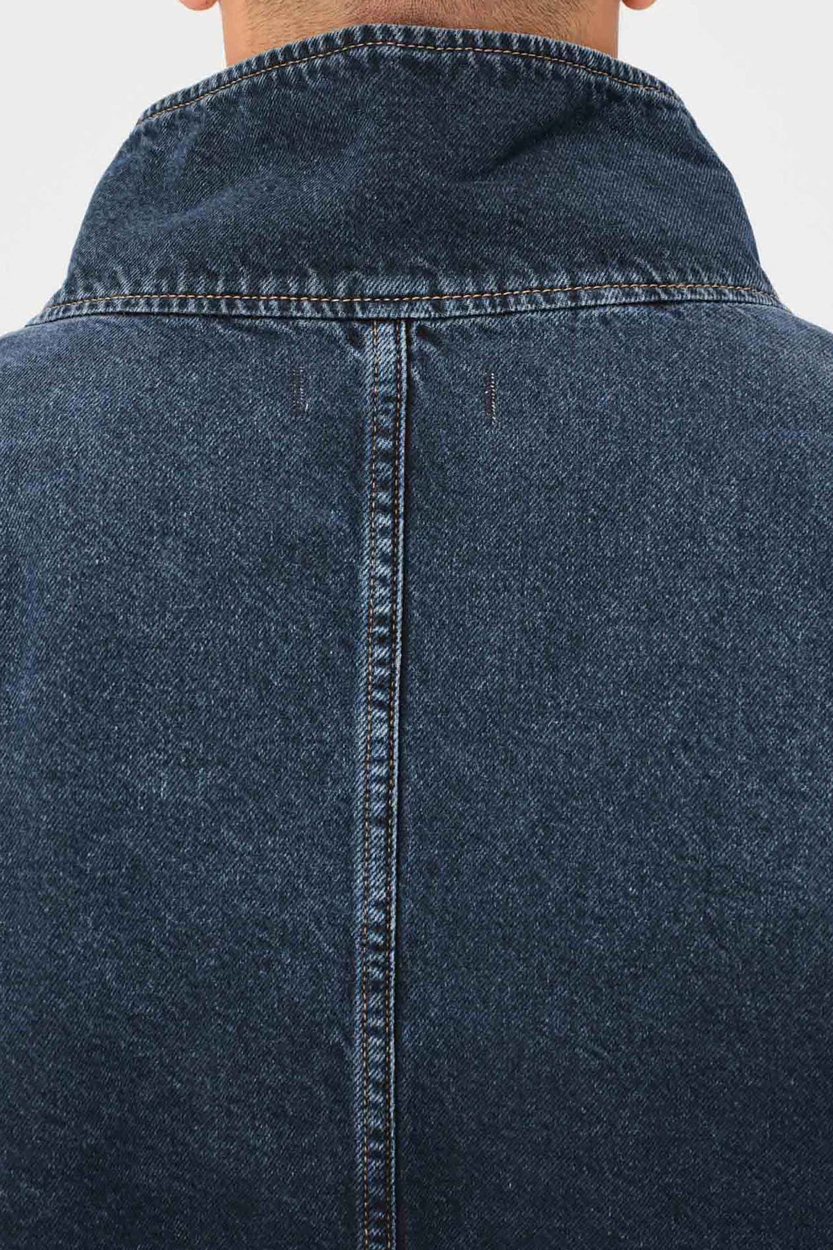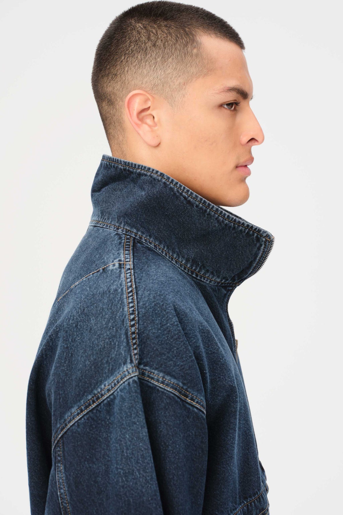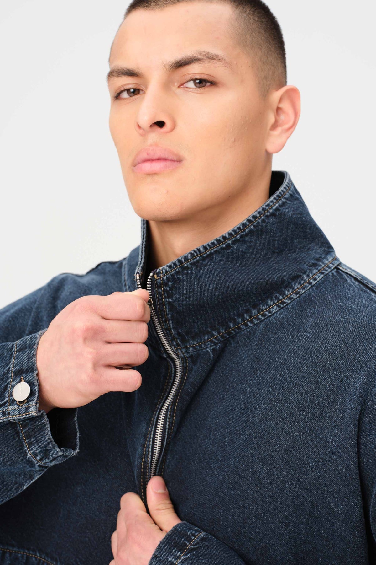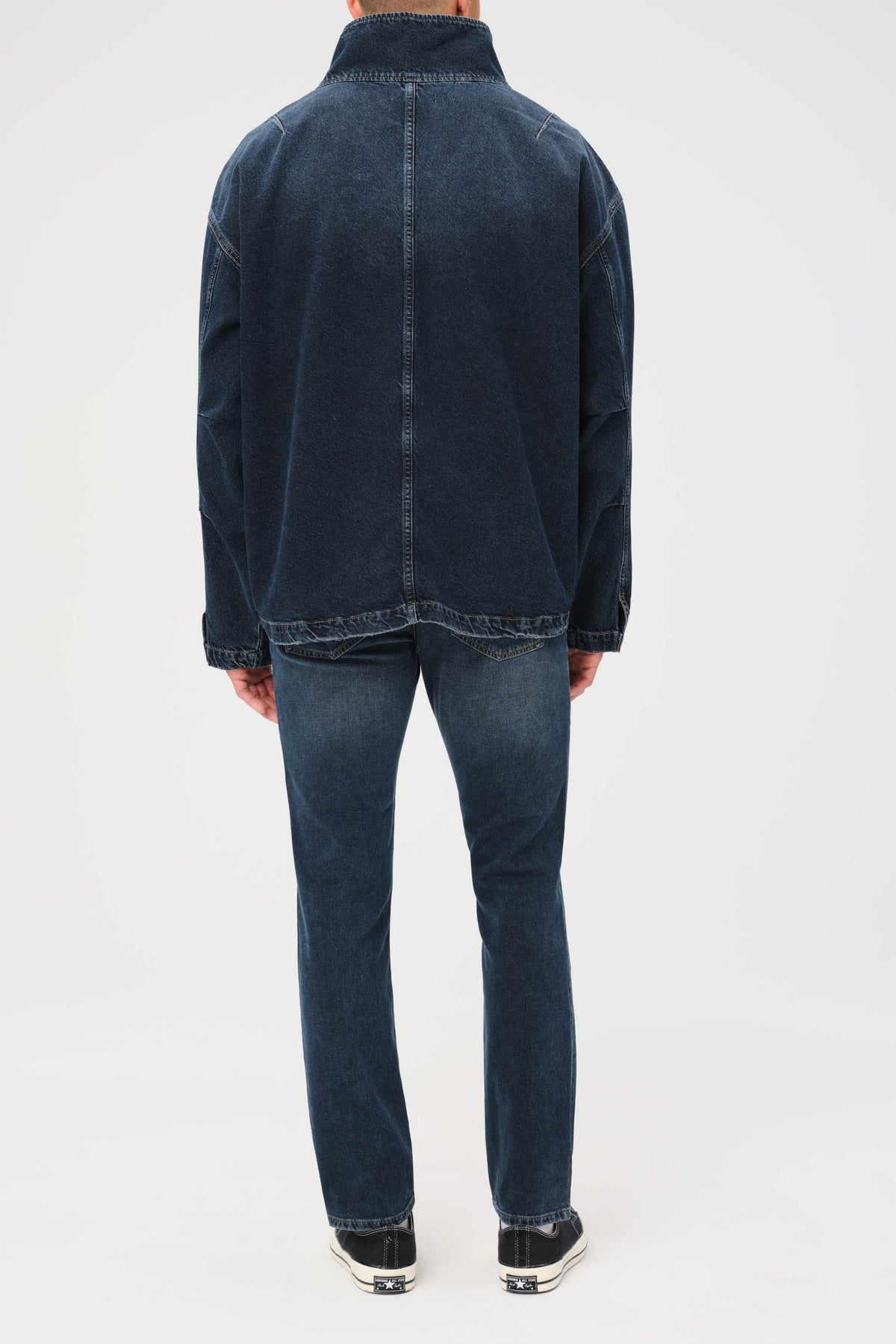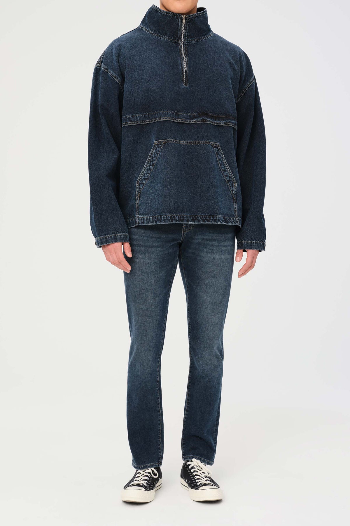 Porter is an overdyed, rich dark indigo wash with fading and character throughout. It features a silver zipper at the neck, khaki stitching and a clean hem.
