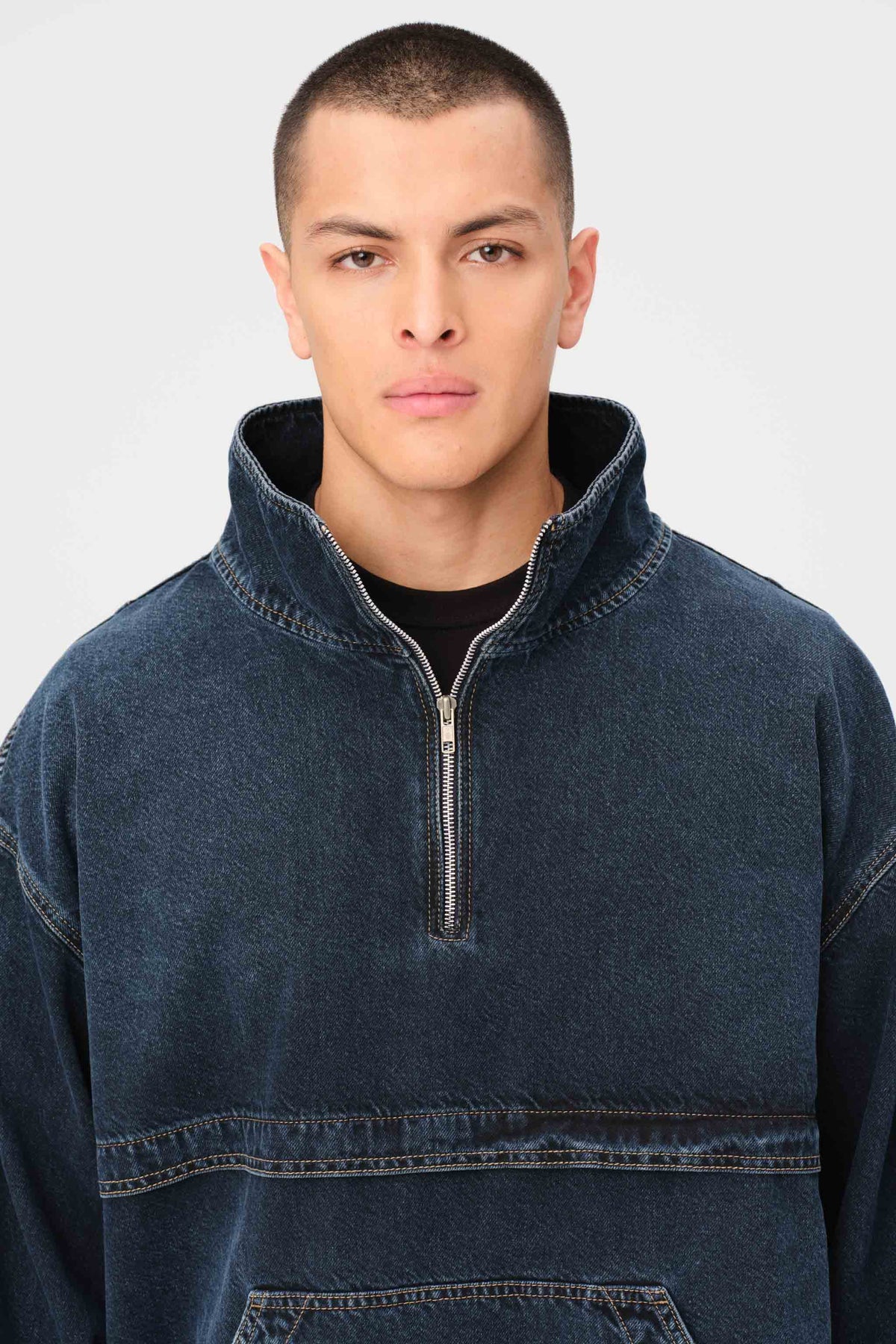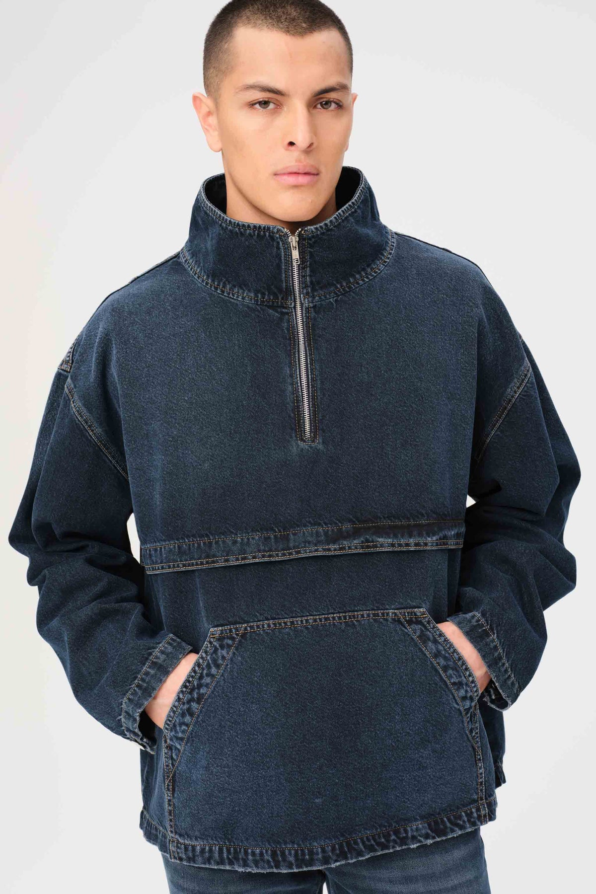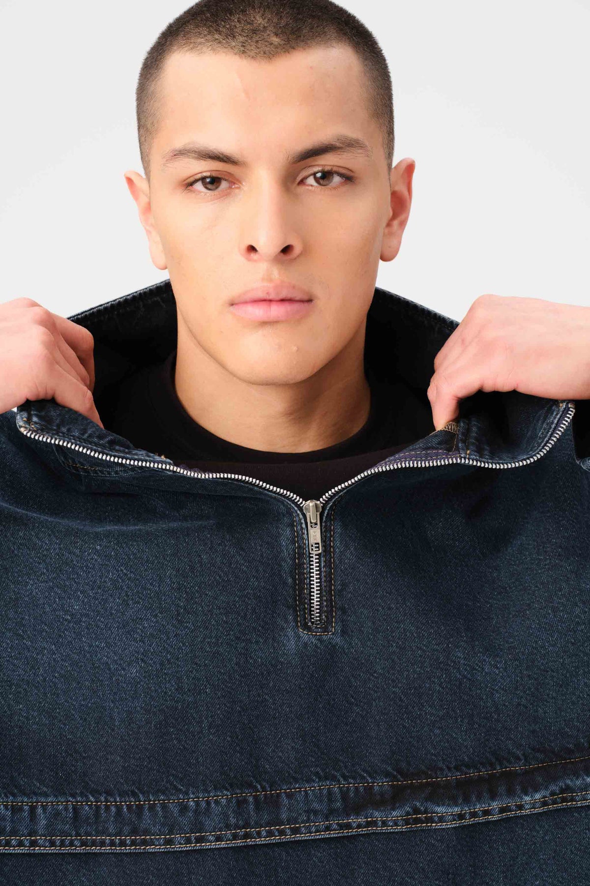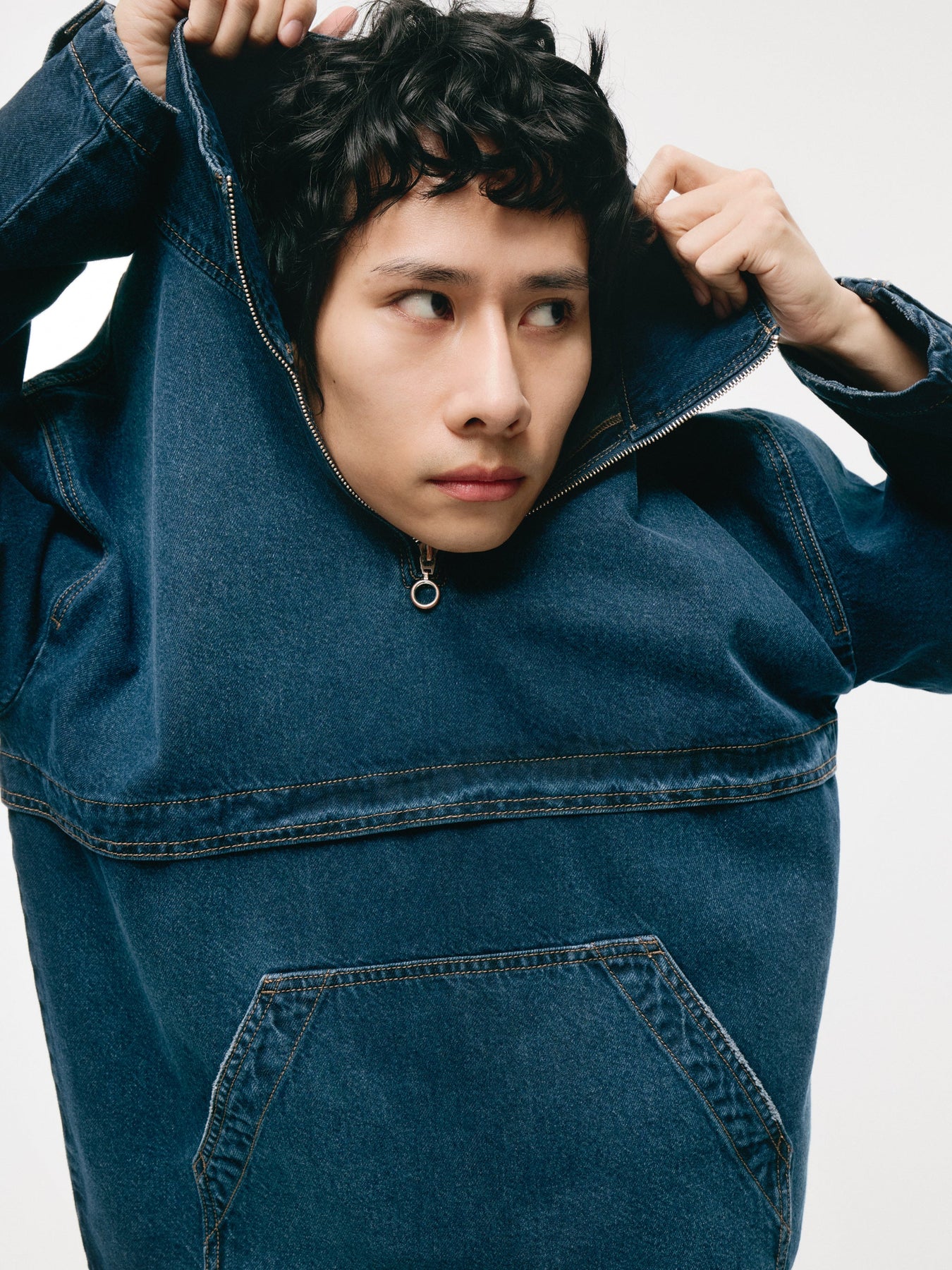 Time to layer up. MRY is this season's new take on the denim jacket. A sporty pullover silhouette is accented with a front pouch pocket and seam details.