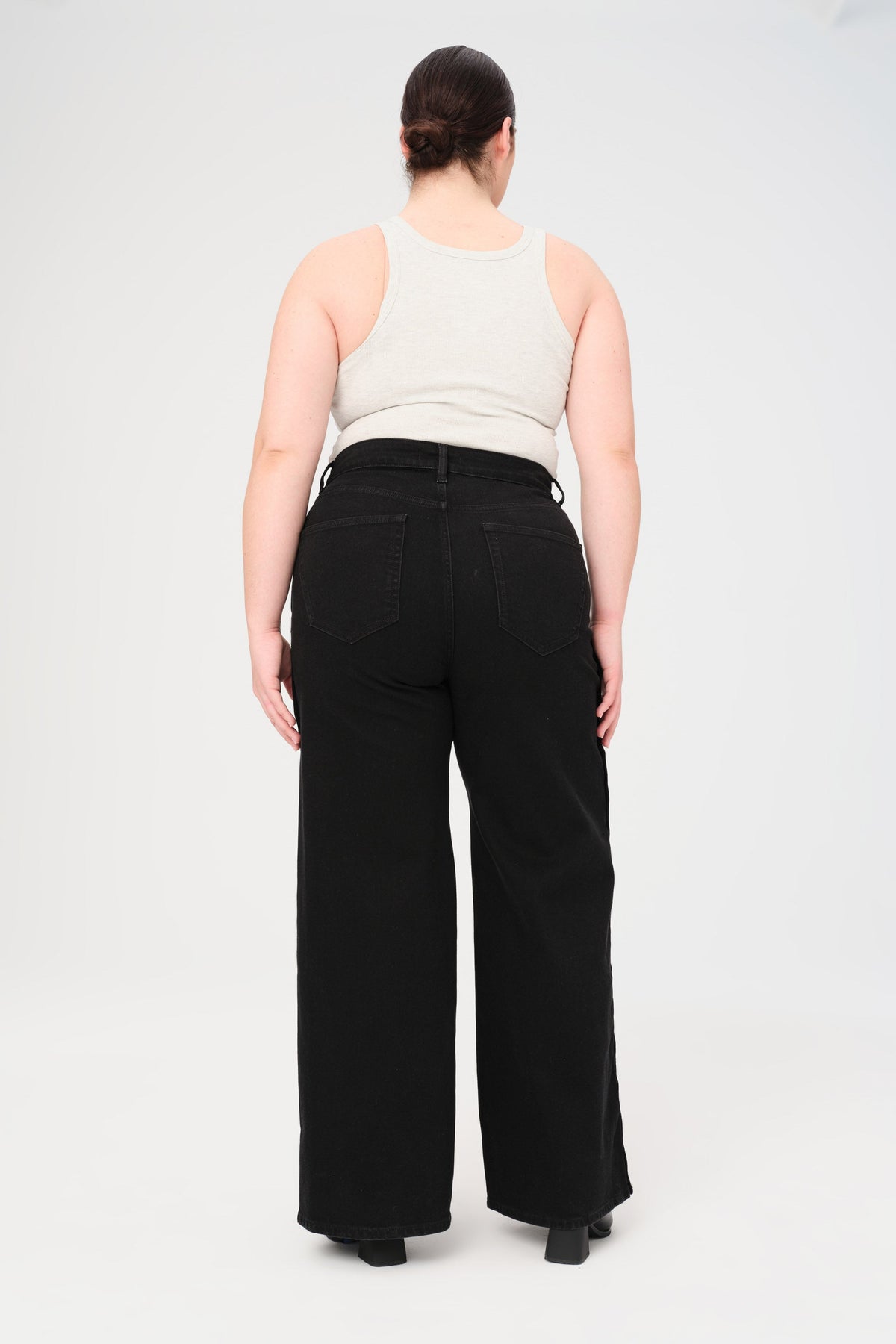 With a luxuriously laid-back look that reminds us of the south of France, NCE is right at home on the Côte d'Azur or just about anywhere else. Designed with a gently sculpting high-rise fit, these wide leg jeans are casual yet always sophisticated. Snap out of it is a no-fade black denim with silver logo snaps along the side seams from thigh to hem. It features silver hardware, tonal stitching, and a clean hem.