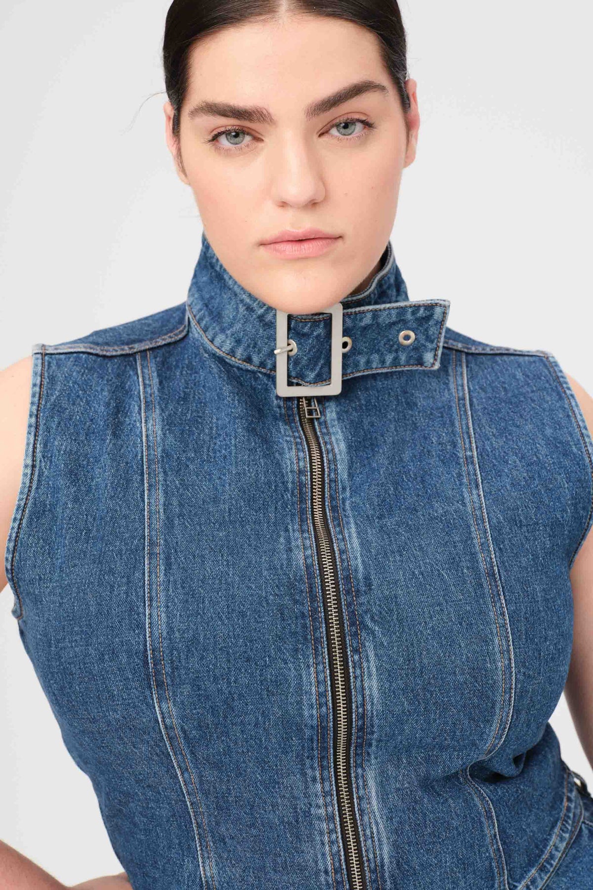 If there was a vote for the most popular top of the year, it would be the vest. MRS is a cropped, fitted style with hook and eye closure at the front. Lost Highway is a true mid-indigo wash with subtle fading. It features a brushed silver buckle at the neck, double sided zipper at the center front, khaki stitching, and a clean hem.