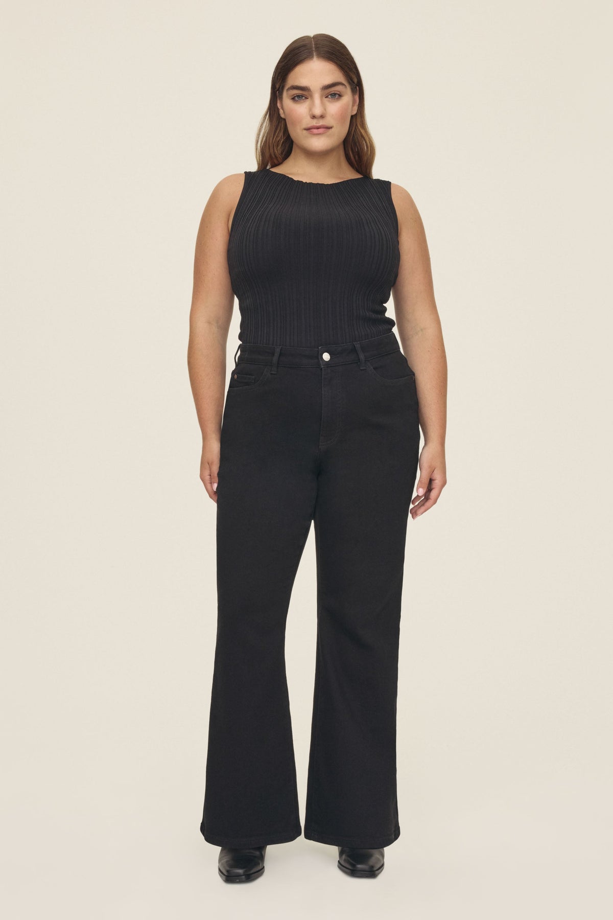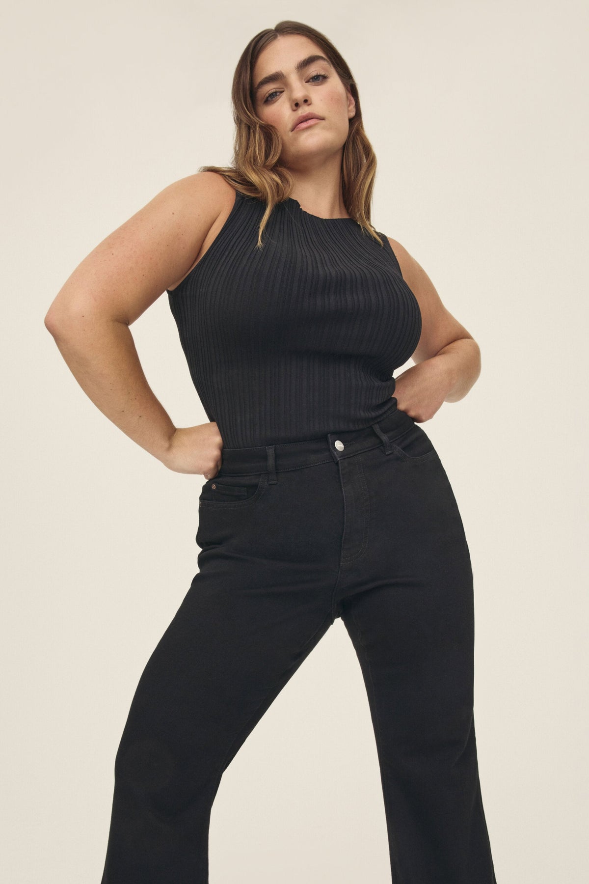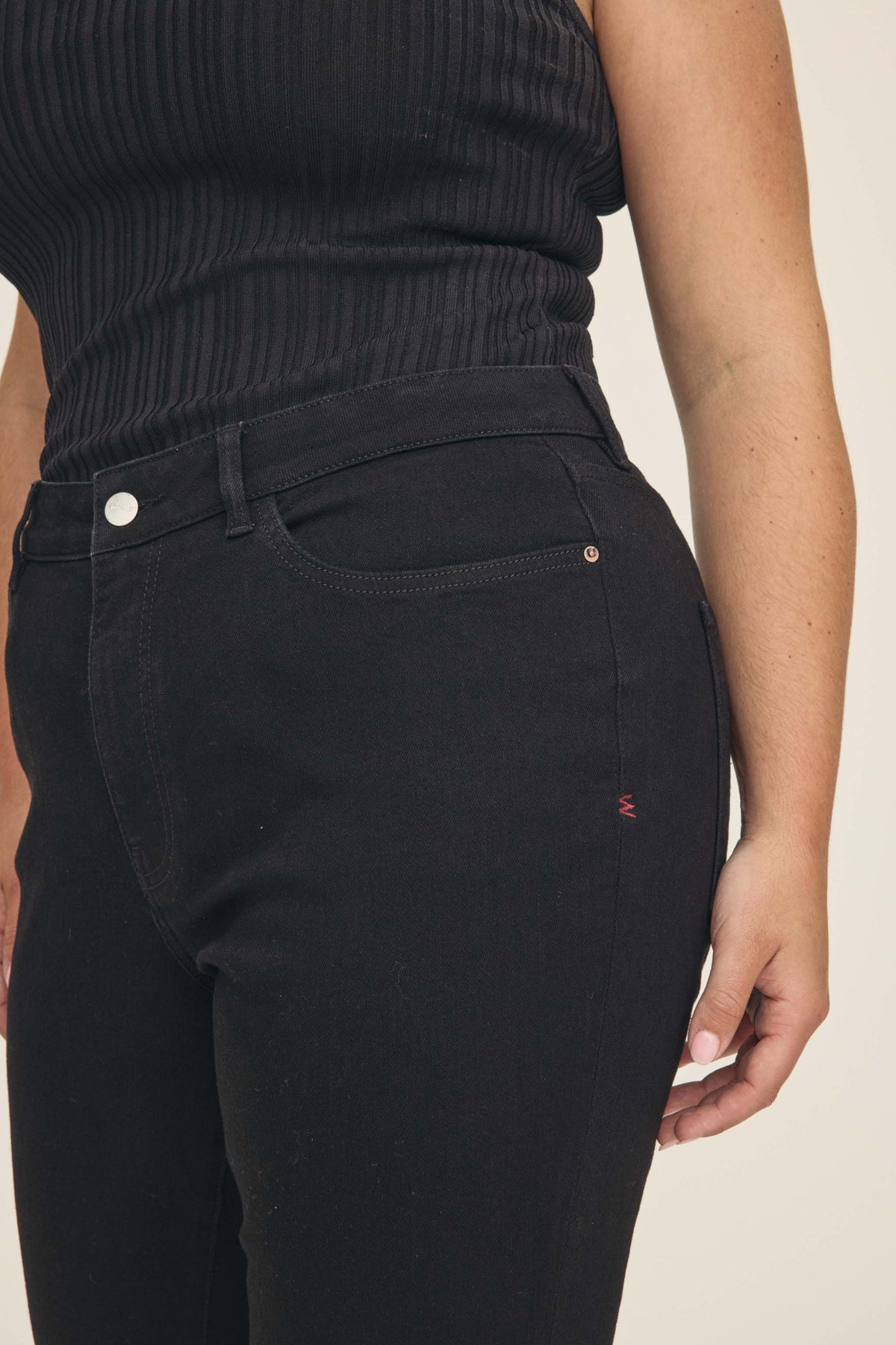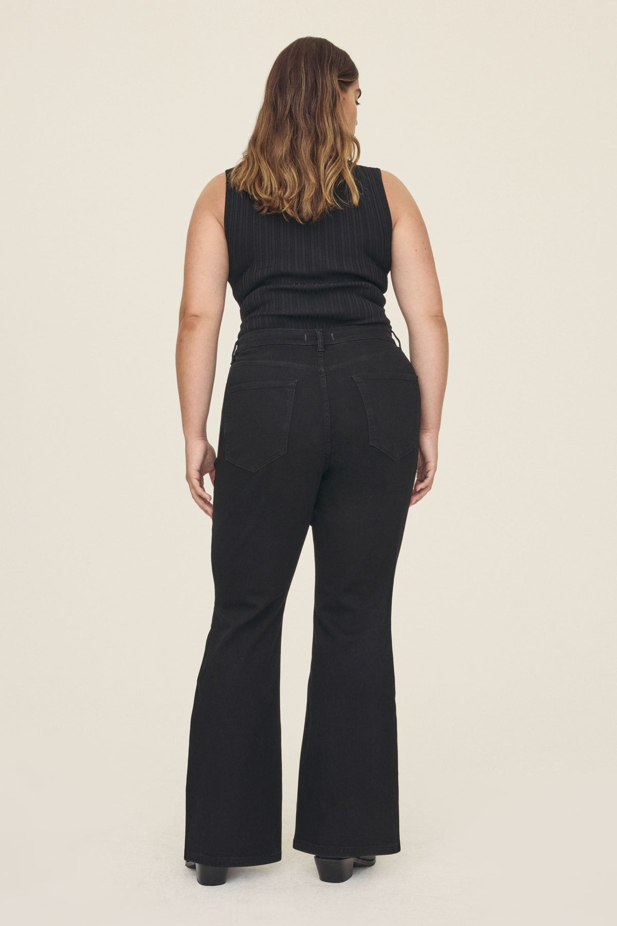 NAO is a fresh take on this season's bootcut trend. Cut with a high waist, sculpting stretch, and punctuated with a leg-lengthening slim flare. Jet Black is a black rinse wash with all the comfort of our stretch fabrications. It features a brushed silver shank, antique copper rivets, a zip fly front and a clean hem.