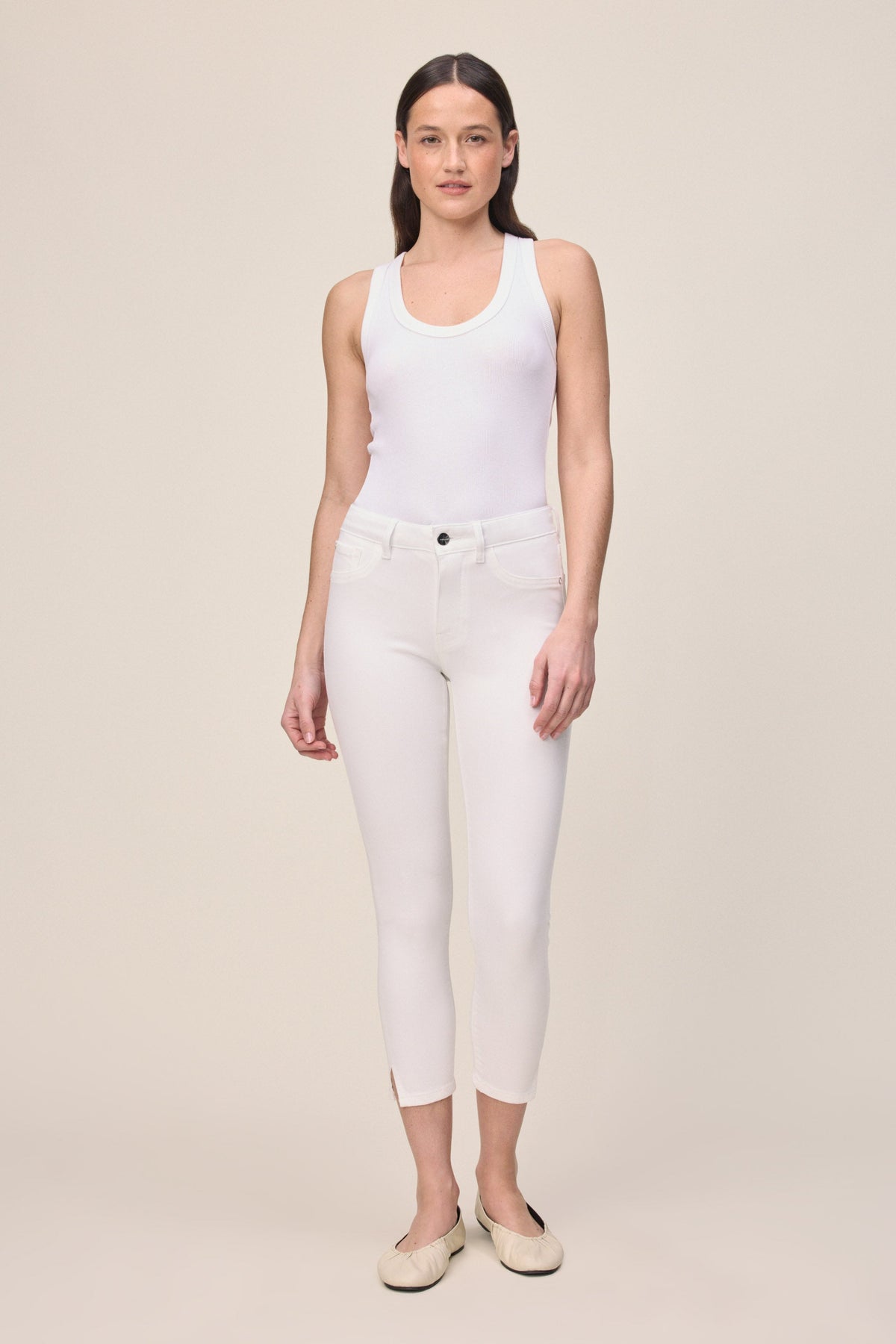 Optic is a clean, bright white that is completely opaque. It features a silver shank and copper rivets, tonal stitching and a clean hem.
