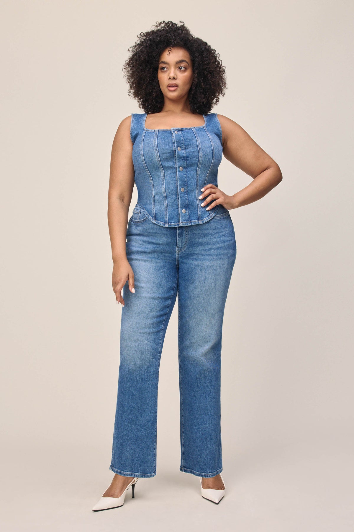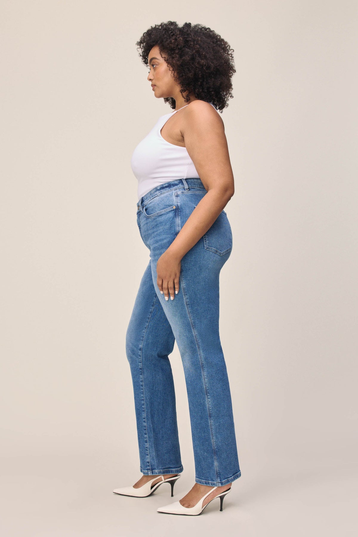 SAT is a high-rise straight jean that's a nod to the most-loved 90's denim style. Crafted with certified cotton and a hint of stretch, this 31" inseam jean looks vintage, but is made with way less water, dyes and chemicals than any other jean in your closet. High Road is a mid-to-light indigo wash with vintage fading and character through out. It features a silver shank, copper rivets, khaki stitching and a clean hem.