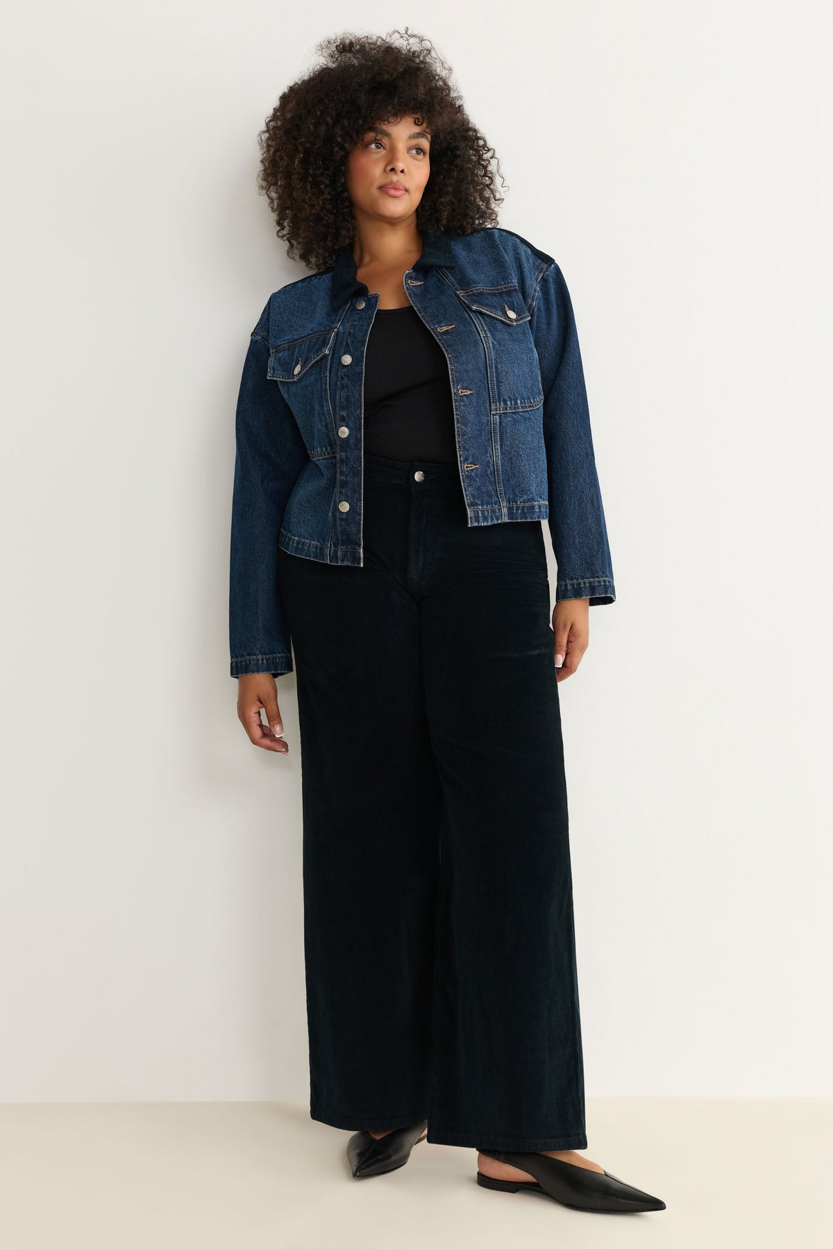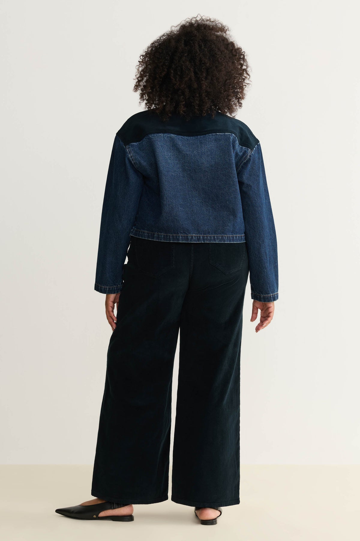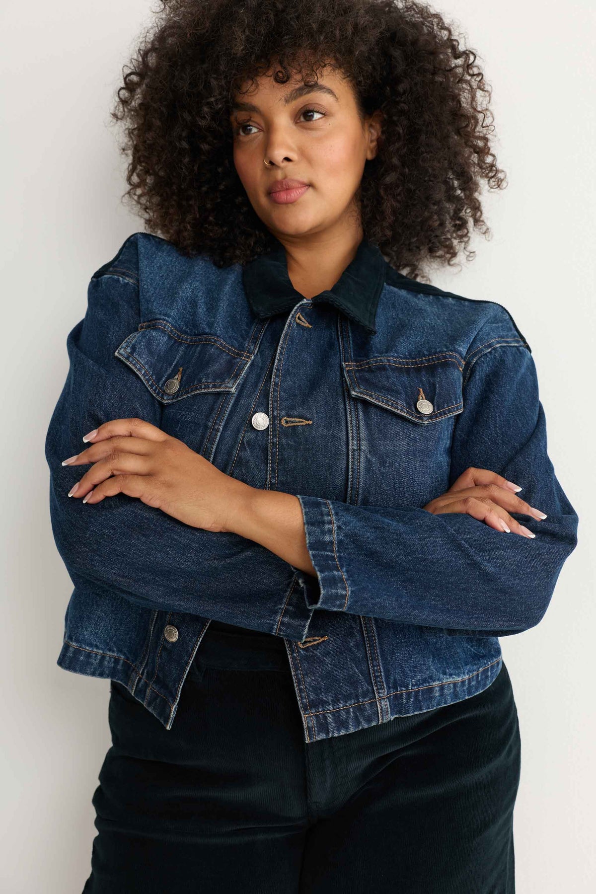 Mercer is a dark indigo wash with a navy corduroy collar. It features silver hardware and utility pocket detailing.
