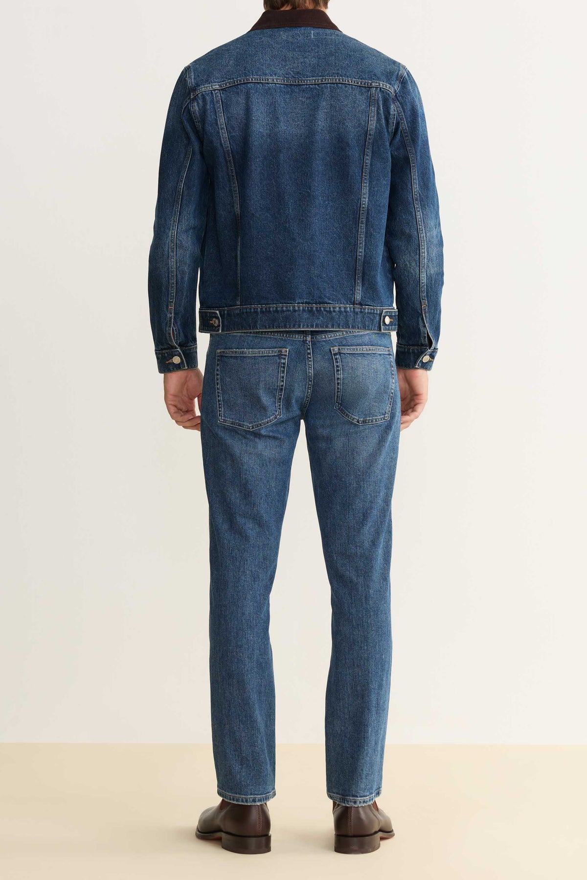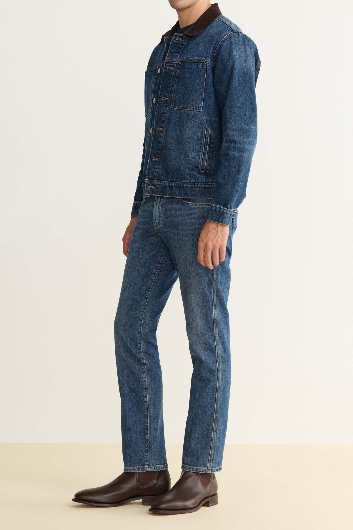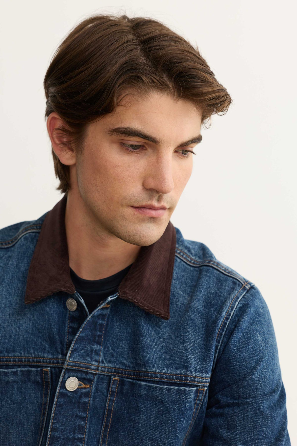 With a nod to Seattle and its legendary grunge scene, SEA is the denim jacket of our dreams. Perfectly detailed with classic styling and updated in our innovative performance denim with a modern fit, this year-round jean jacket is absolutely essential. Hawthorne is a dark indigo wash with a brown corduroy collar. It features silver hardware and a clean hem.