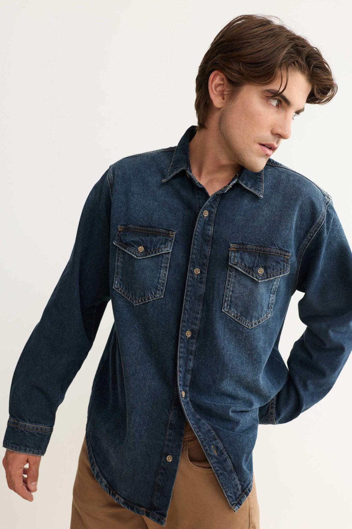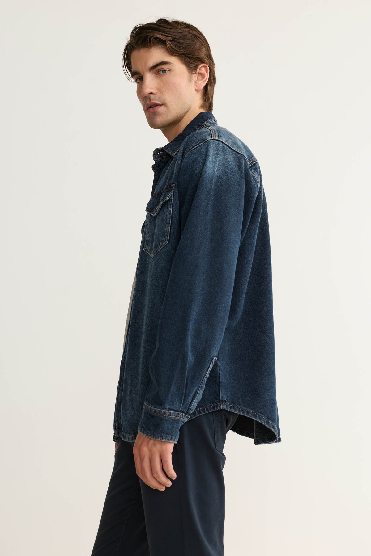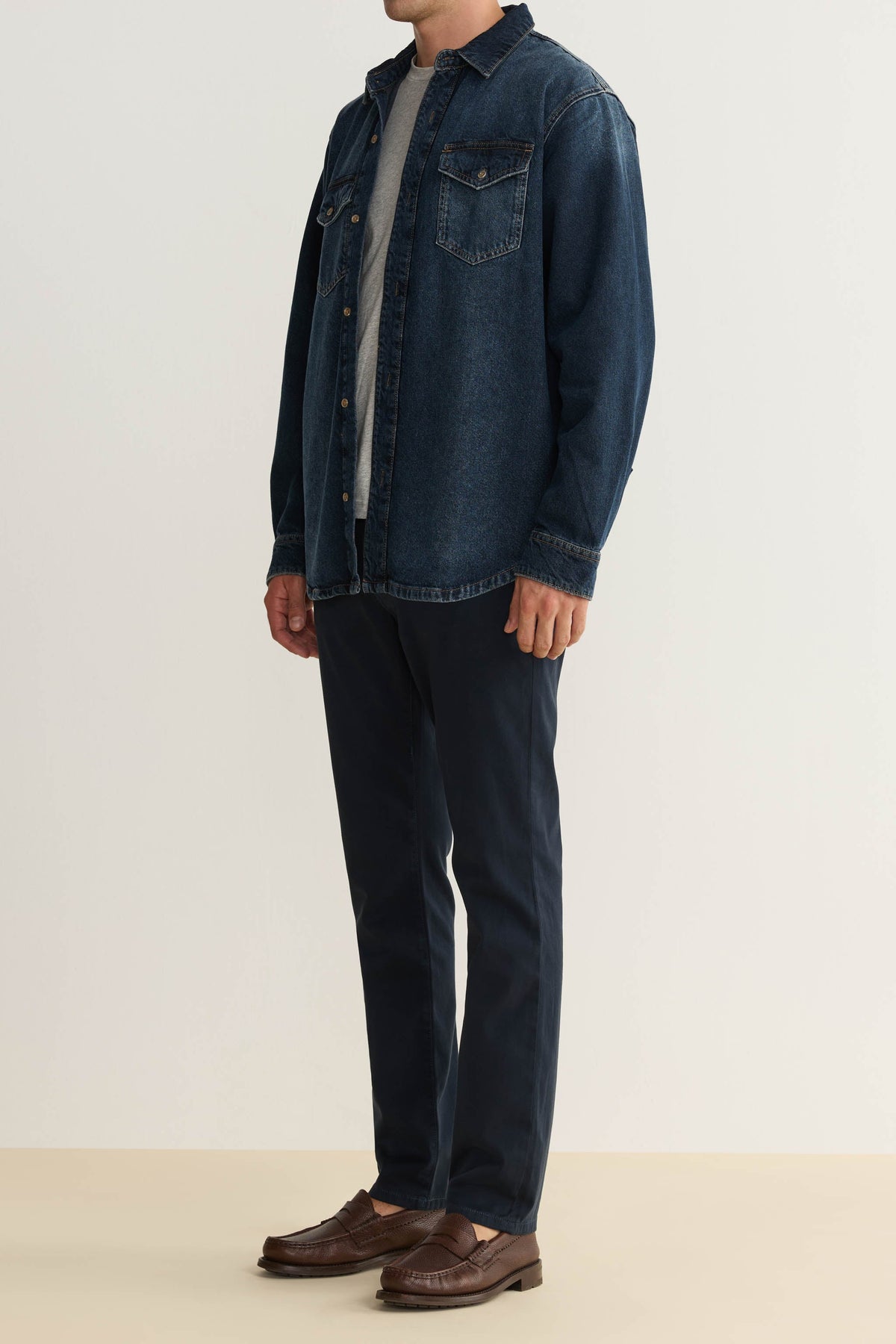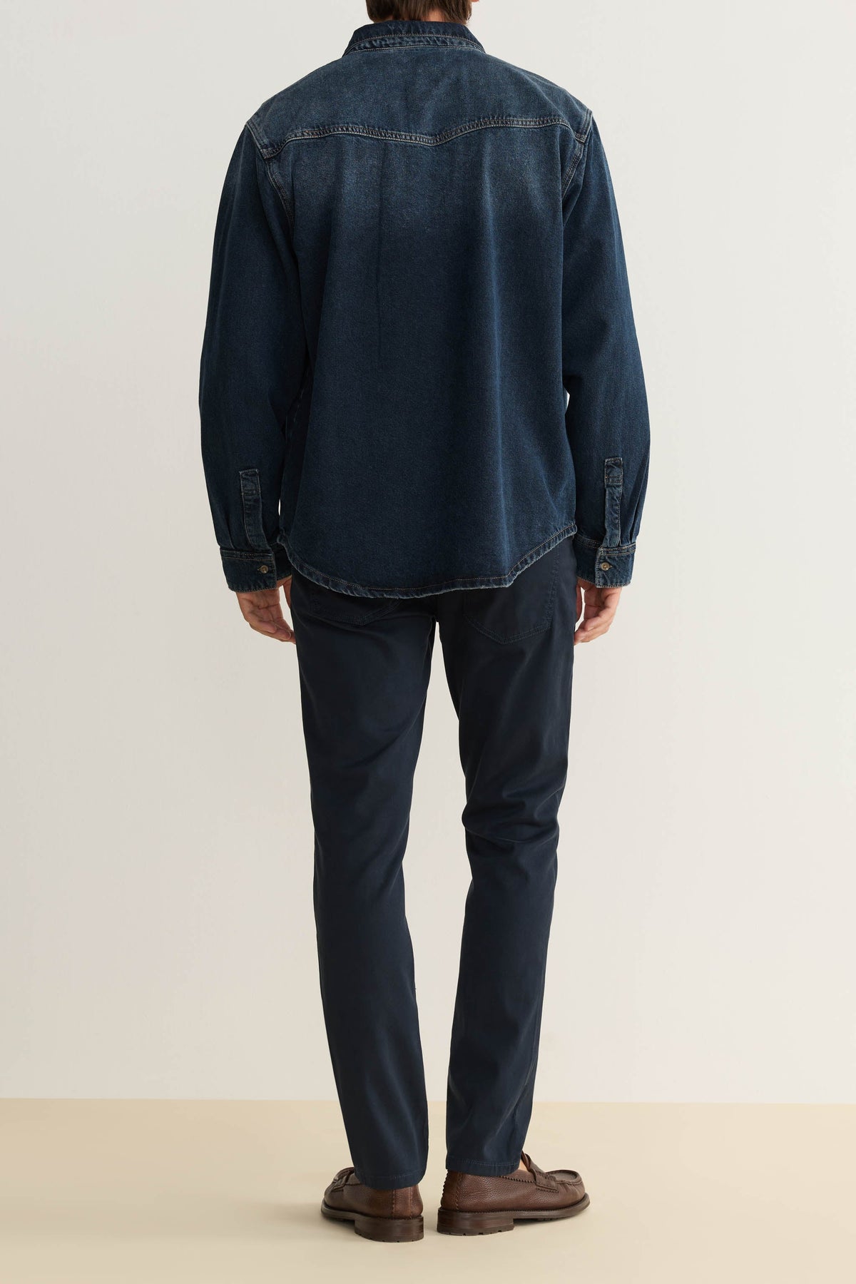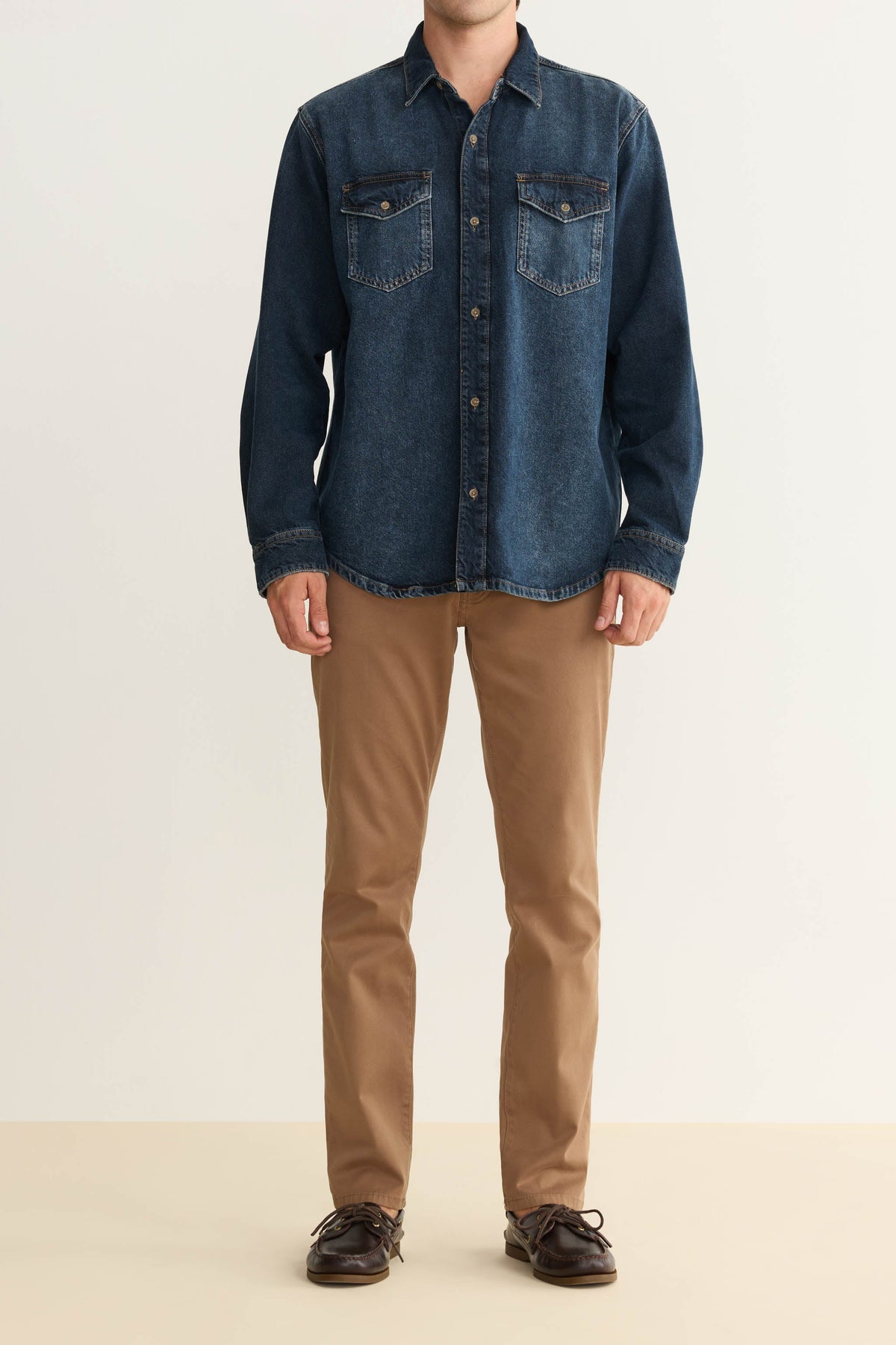Roll up your sleeves with this American Midwest-inspired denim shirt. The DET is a classic button-down fit with a pointed collar, dual chest pockets, and a rounded shirttail hem. Porter is a dark indigo wash with subtle character throughout. It features a silver shank, copper rivets and a clean hem.