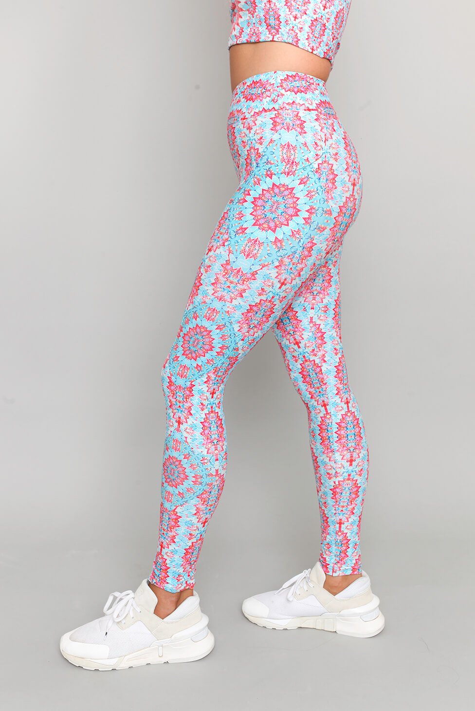 Vibrant hues of turquoise and oceanic coral combine for a coastal-inspired aura, designed for the wanderlusters. This print is a standalone stunner, but pairs perfectly with natural stones and textures for a full-on bohemian vibe. With minimal slip pockets and a straight, high-waisted band, this legging seamlessly blends function with form. Pairs well with the Amalfi Crisscross Four-Way Top.