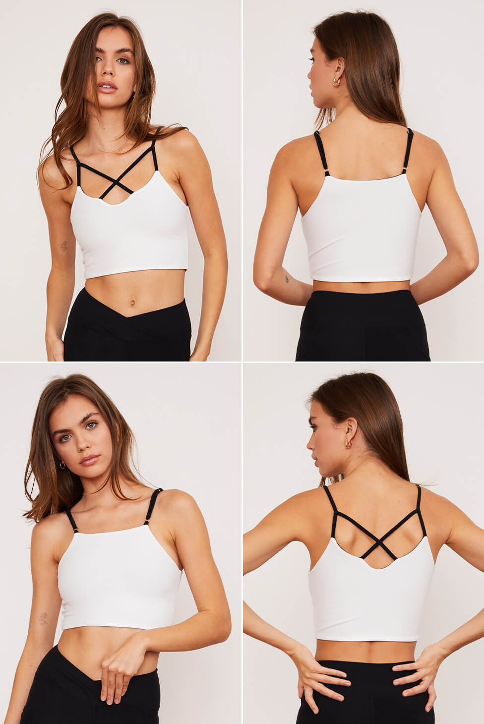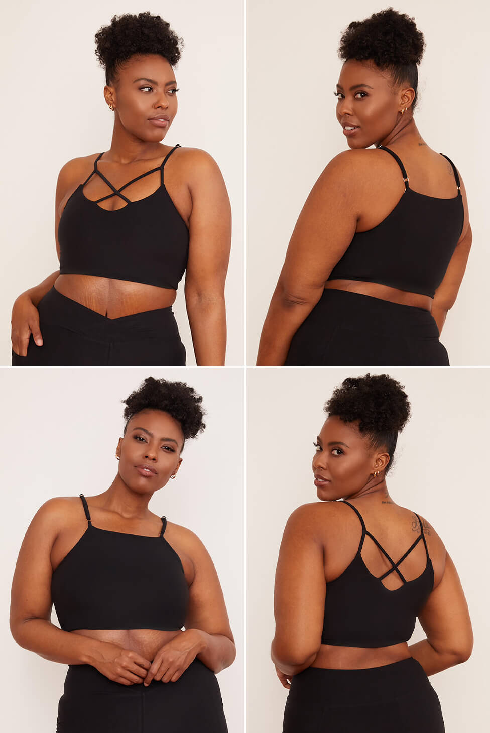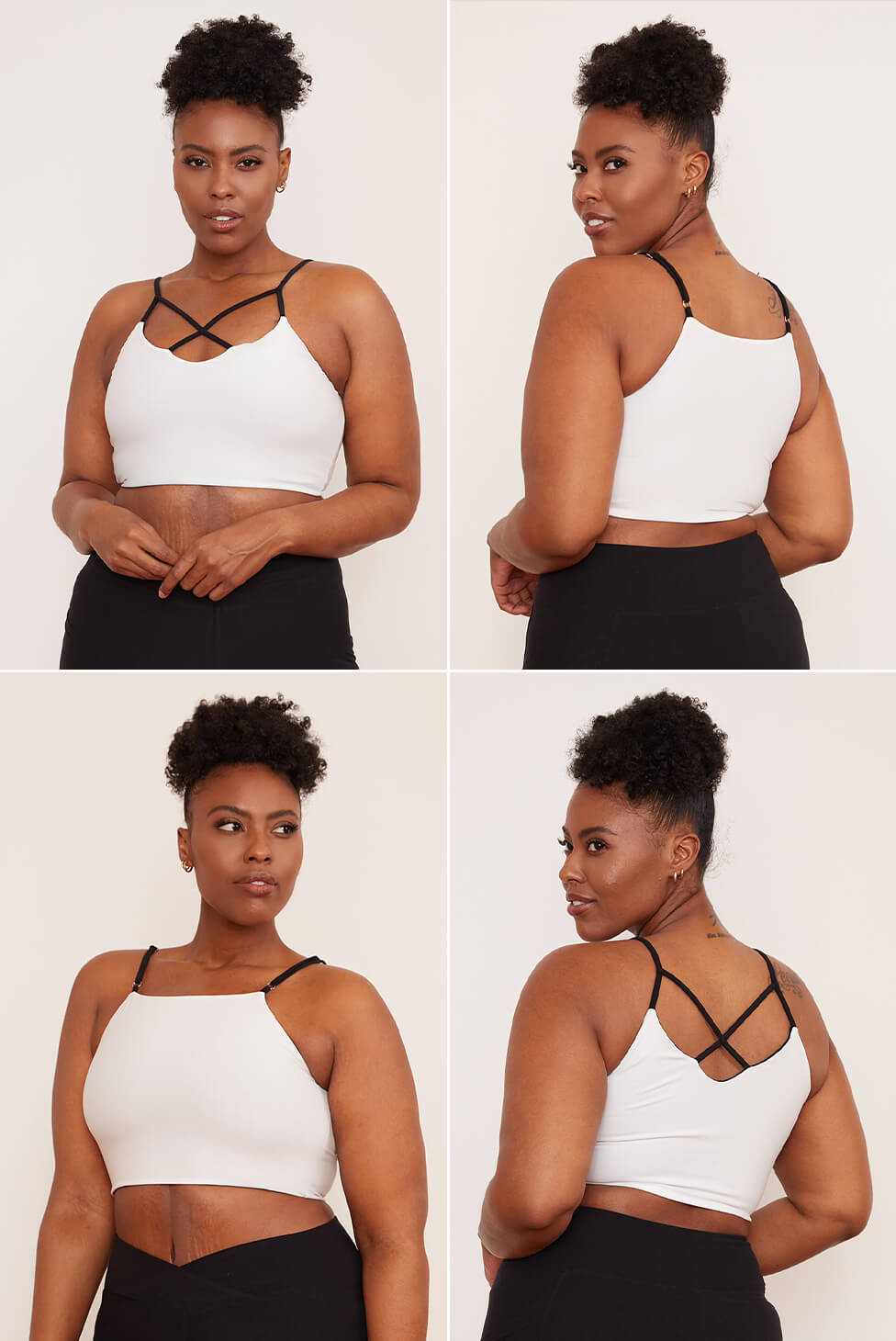 One top, four ways — because sustainability is magical. Wear this miracle of a top with the sexy crisscross detailing in the front or turn it around for a sporty high-neck. For our next trick, flip it inside out for a color-blocked look. Featuring adjustable straps, this mid-length top is your sustainable staple. Oh, and it's lined for just the right amount of coverage. See? Magic. Made using post-consumer recycled plastic — 84% RPET and 16% spandex.
