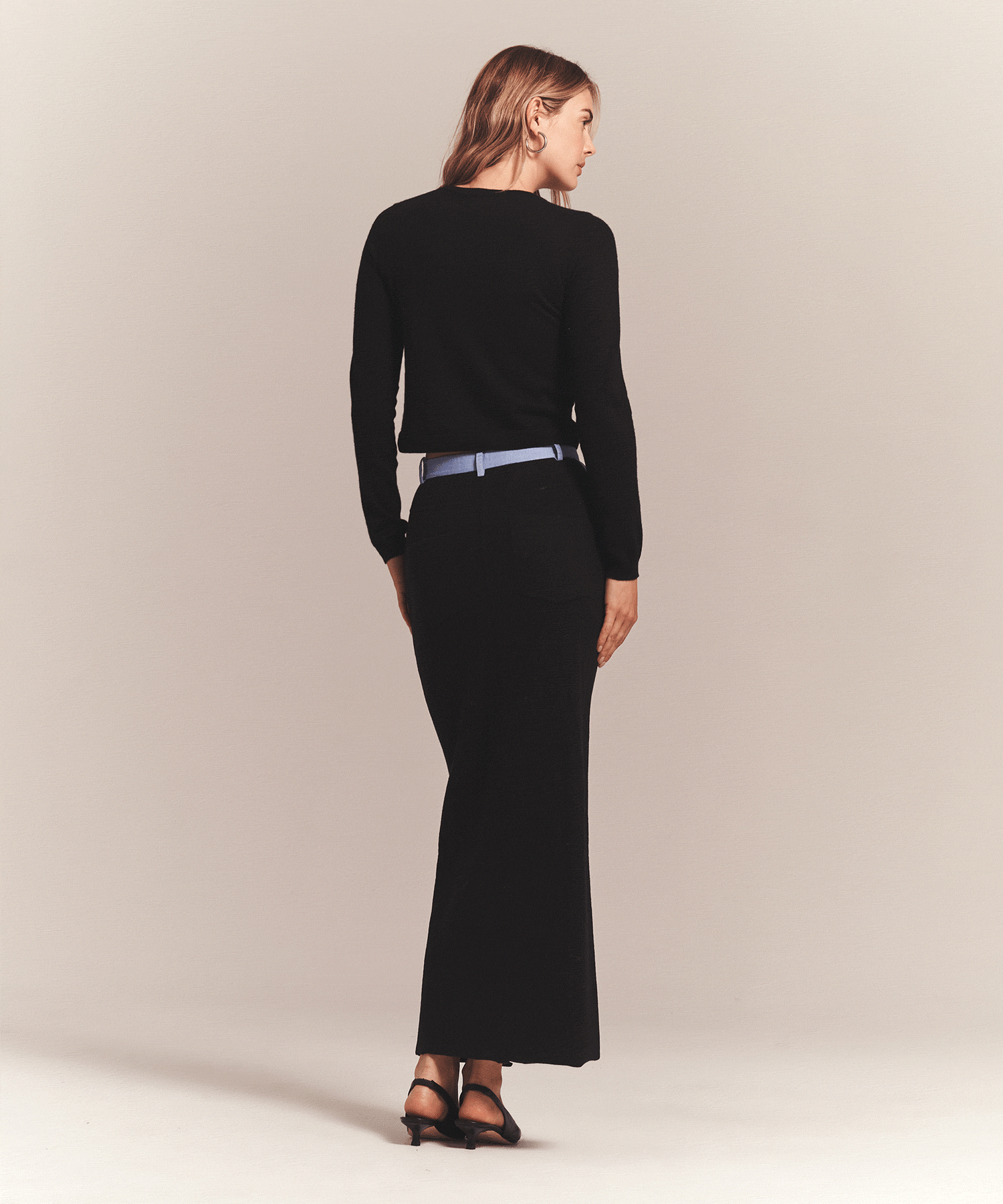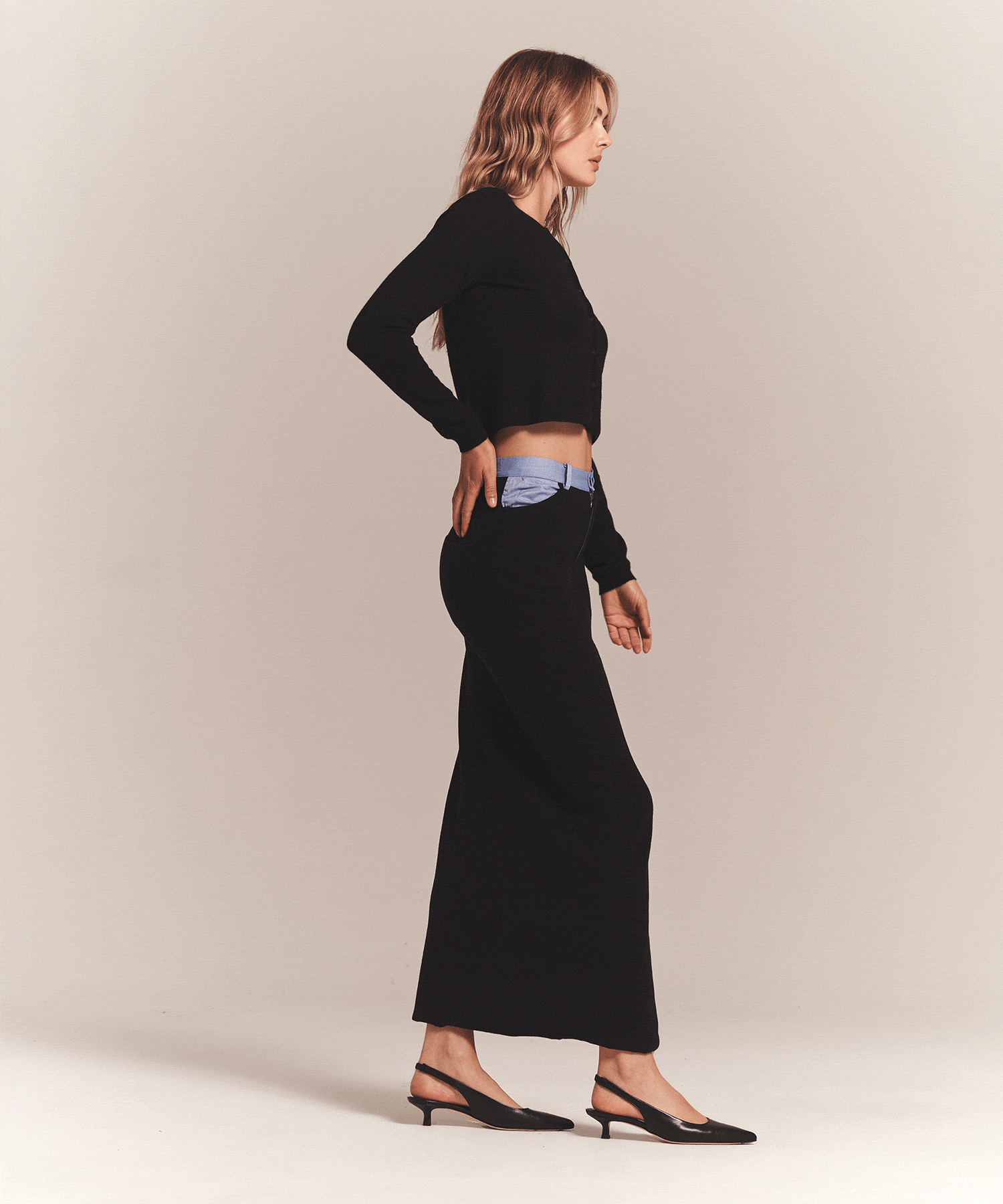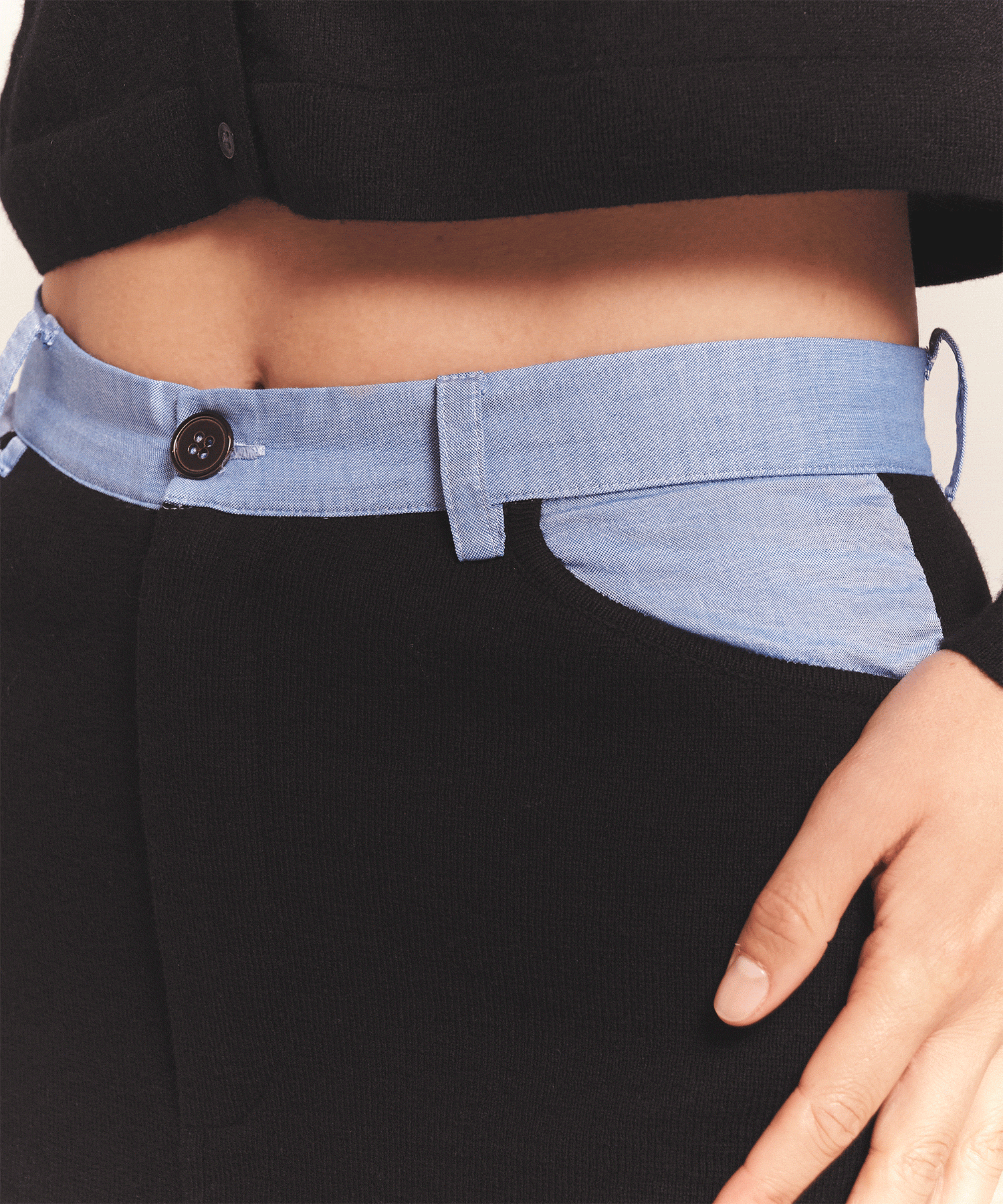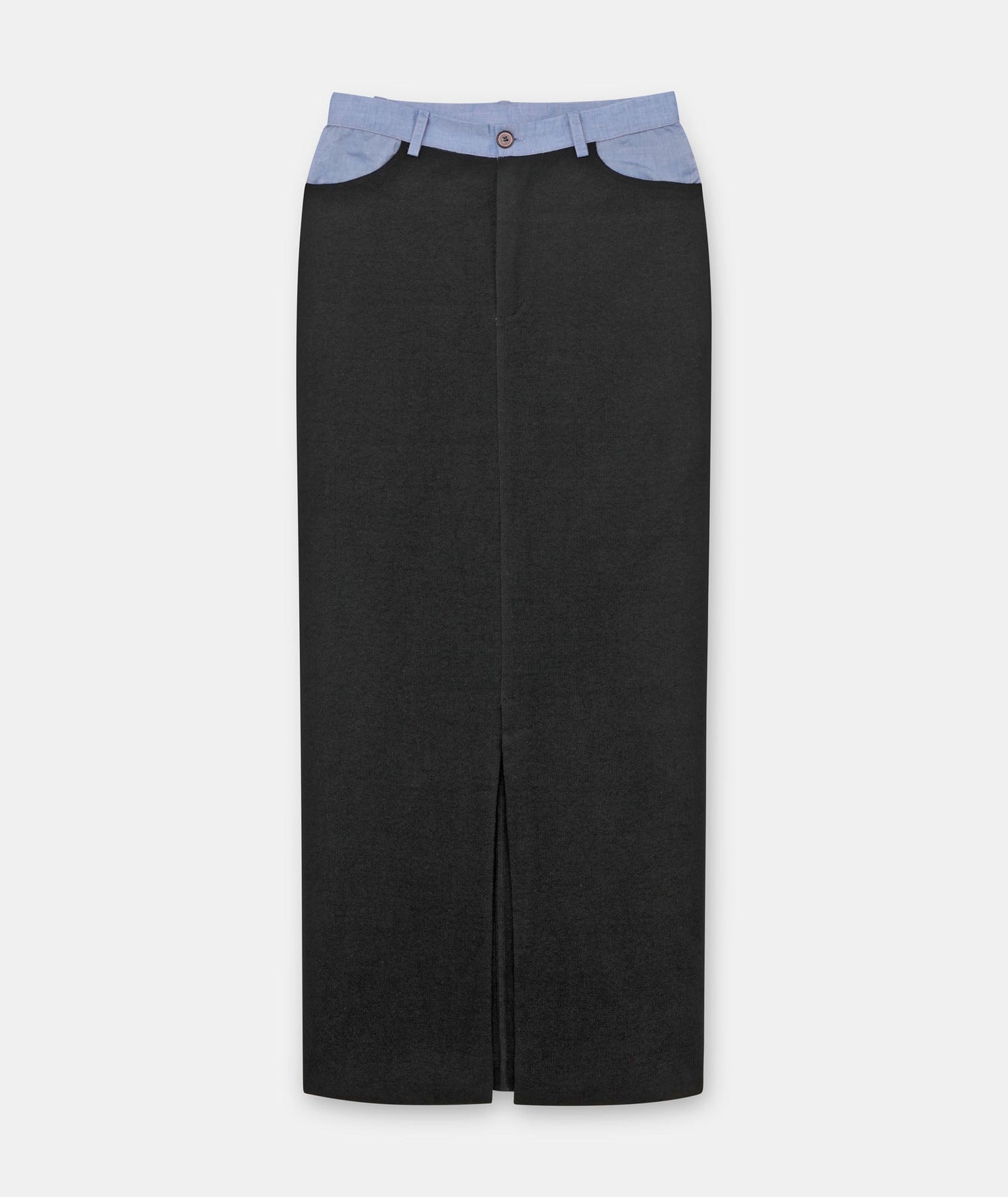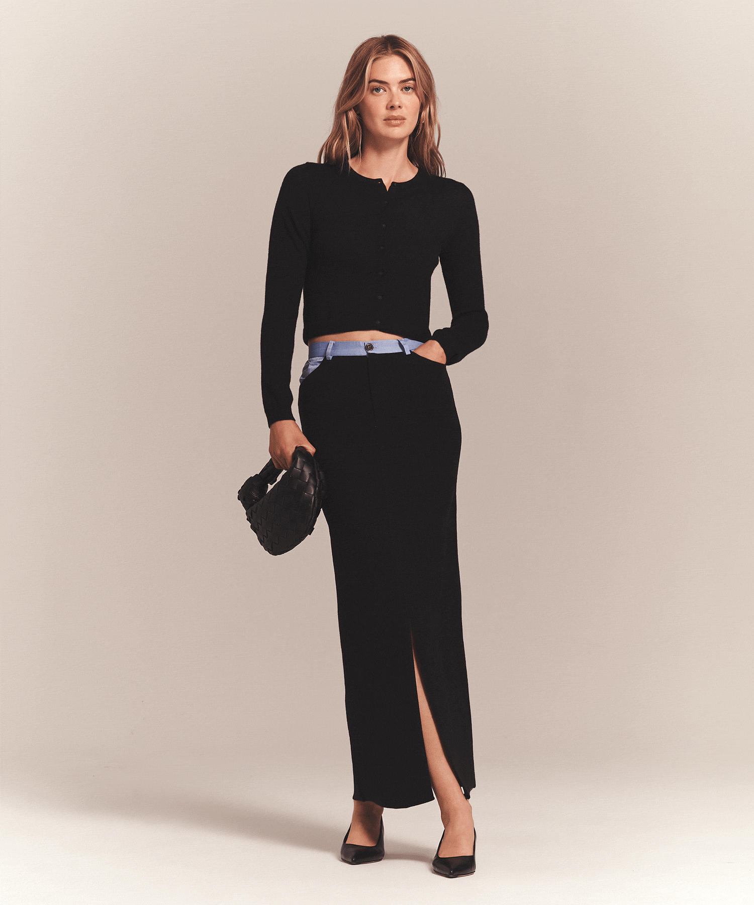 A skirt that does both. The Cotton Cashmere Mixed Media Skirt is a slim fitting midi skirt with plenty of visual interest. It features a classic zip and button waist, belt loops, side pockets, and a front slit. Crafted from a mixture of premium cashmere and cotton.