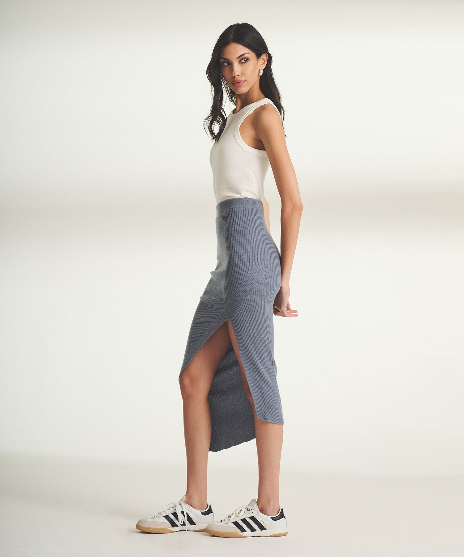 Urban asymmetry. A wool-cashmere asymmetrical ribbed skirt that introduces architectural lines to your wardrobe. 70% wool and 30% cashmere create a piece both classic and contemporary.