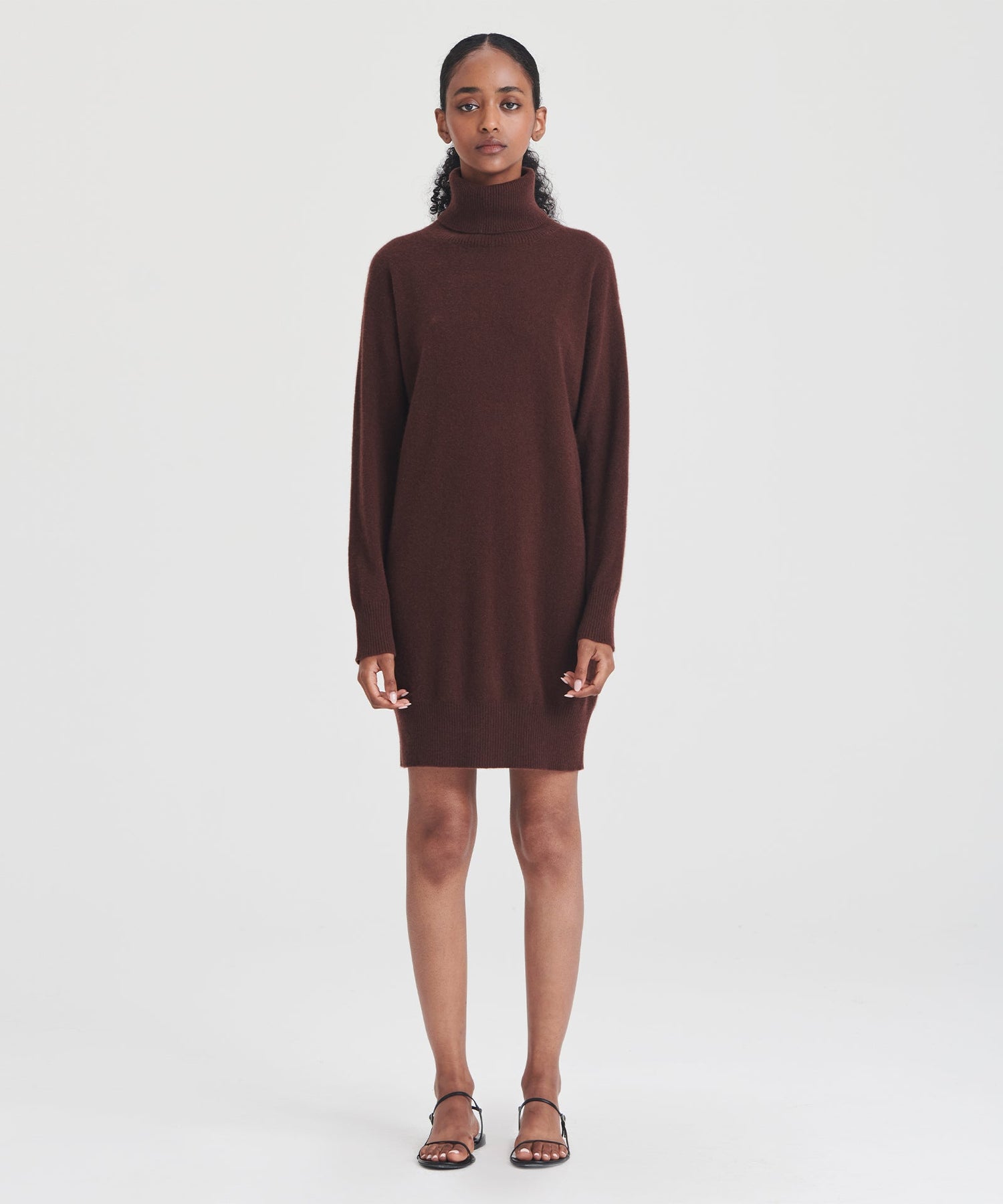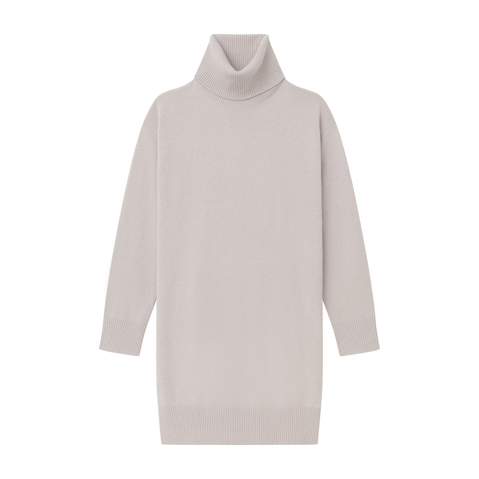 The Cashmere Turtleneck Mini Dress is an effortless one piece with a relaxed classic fit and mini length. It features long sleeves, a turtleneck, and ribbed detailing. Crafted from 100% premium, sustainable cashmere.