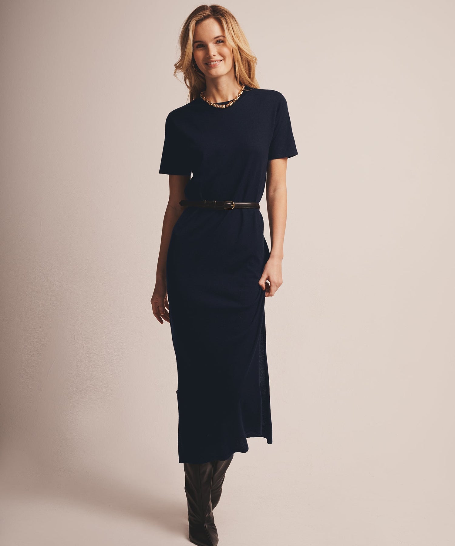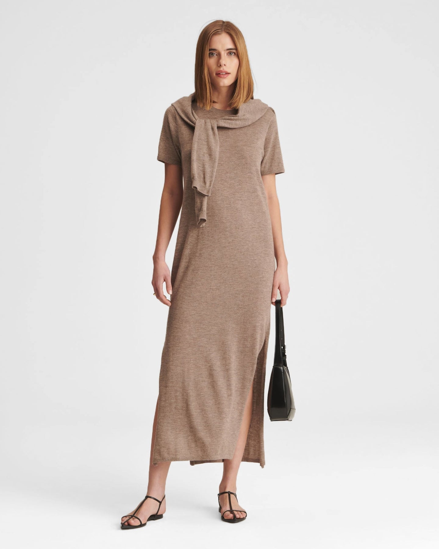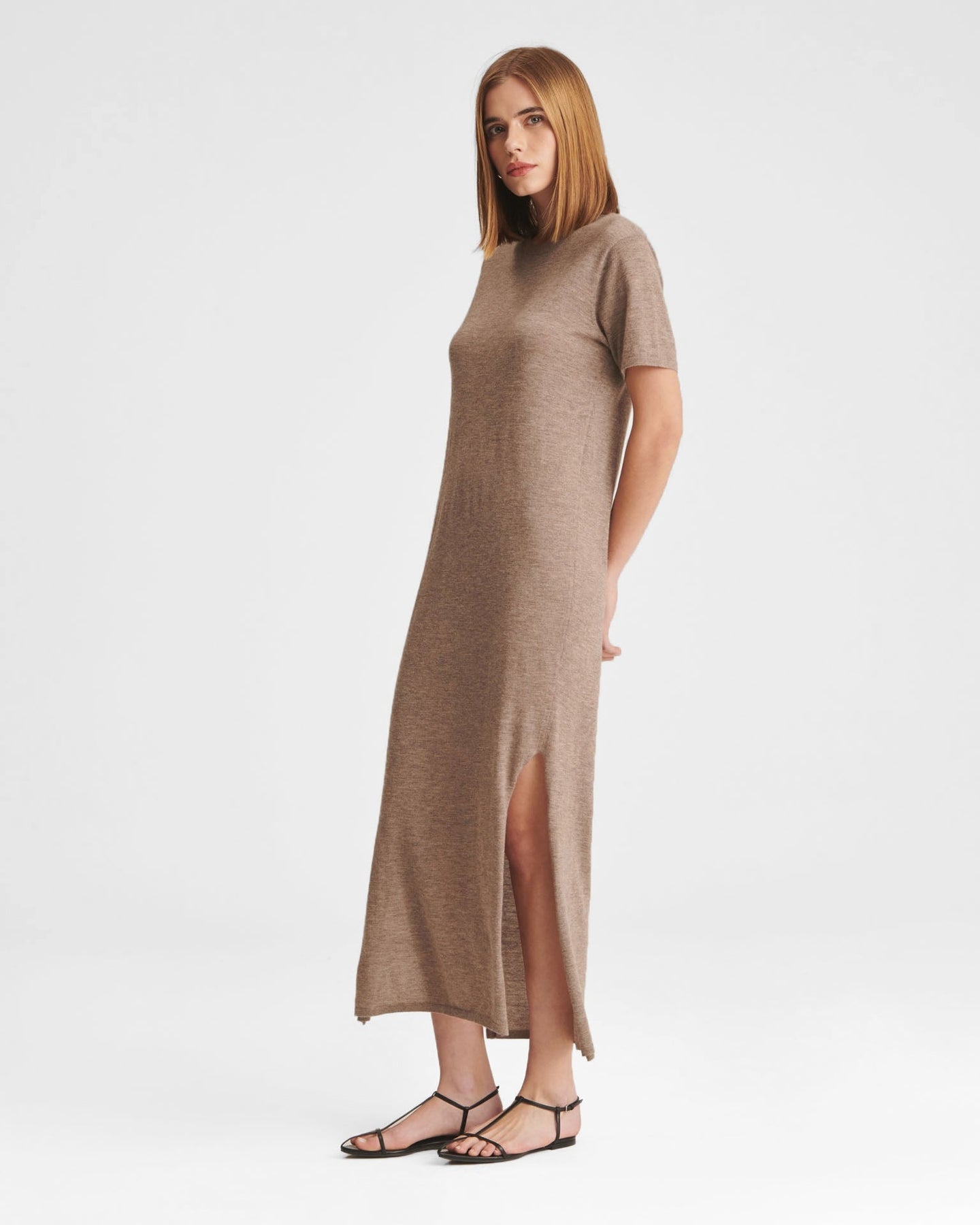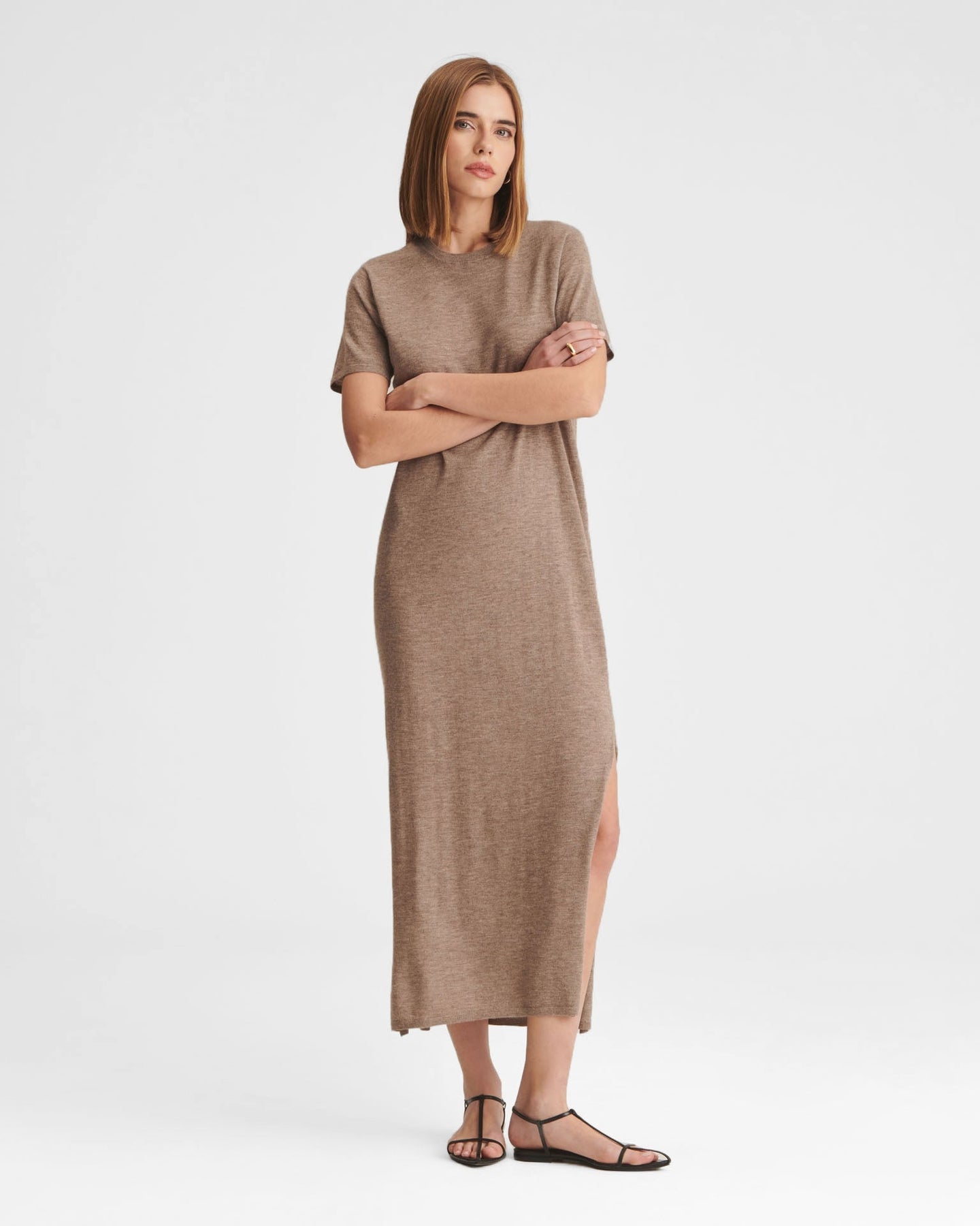 Instantly elevated. The Super Fine Cashmere T-Shirt Dress is a luxuriously-lightweight midi dress with a classic fit. It features a ribbed crew neckline, side slits, and an effortlessly-chic design. Crafted from Super Fine Cashmere: Our premium, 16gg cashmere that’s knit on top-of-the-line machinery. It’s extra-fine and silky-soft.