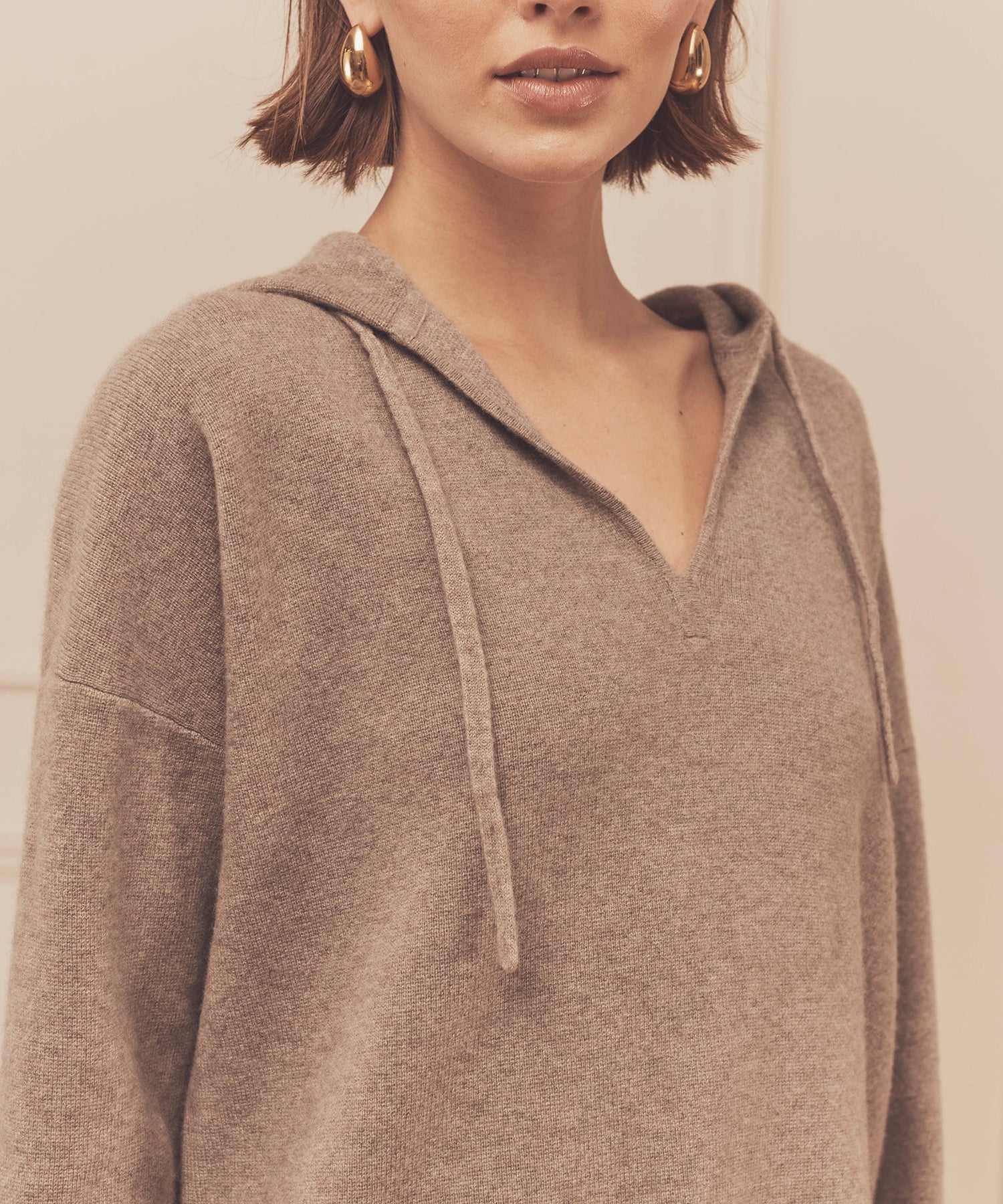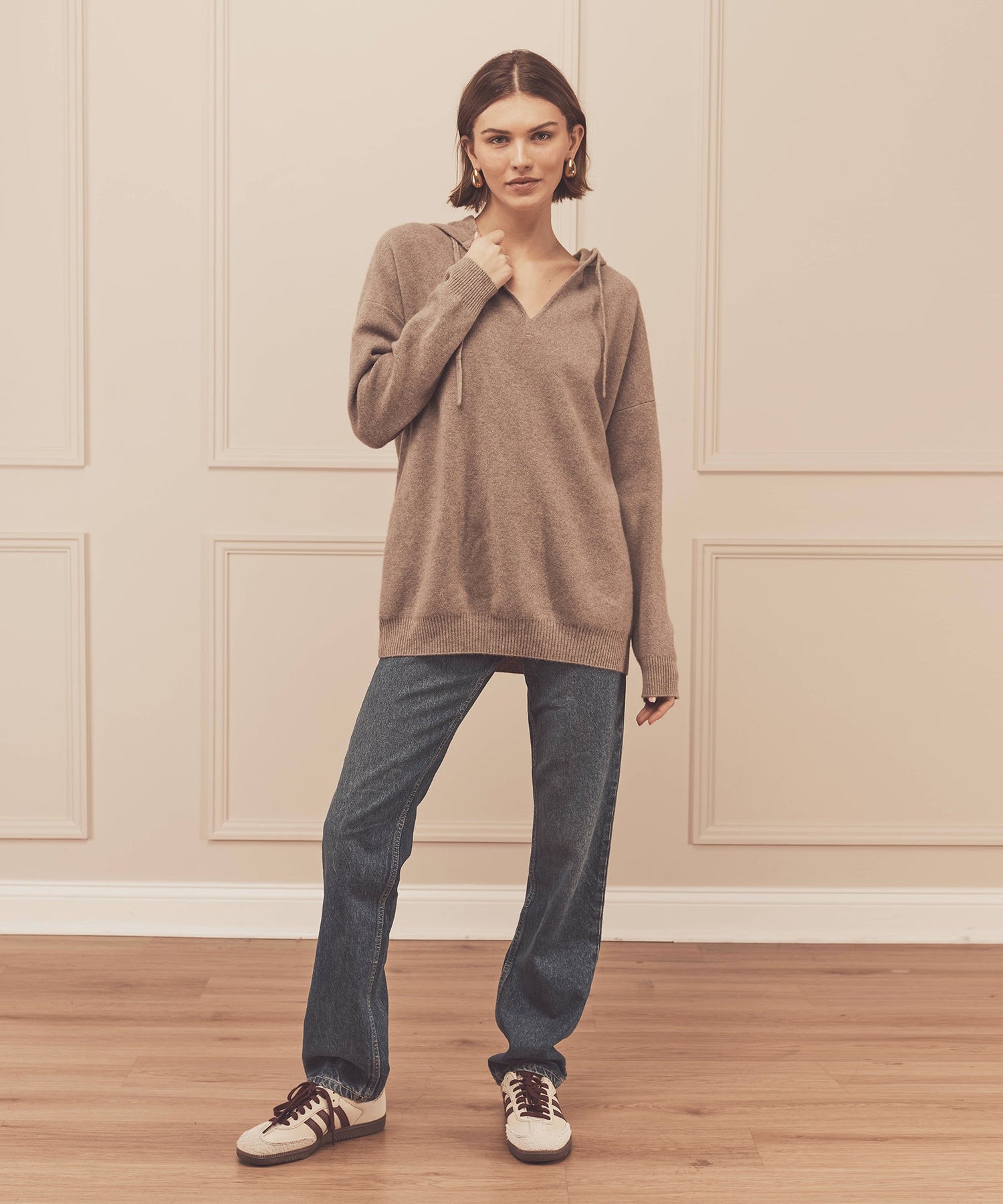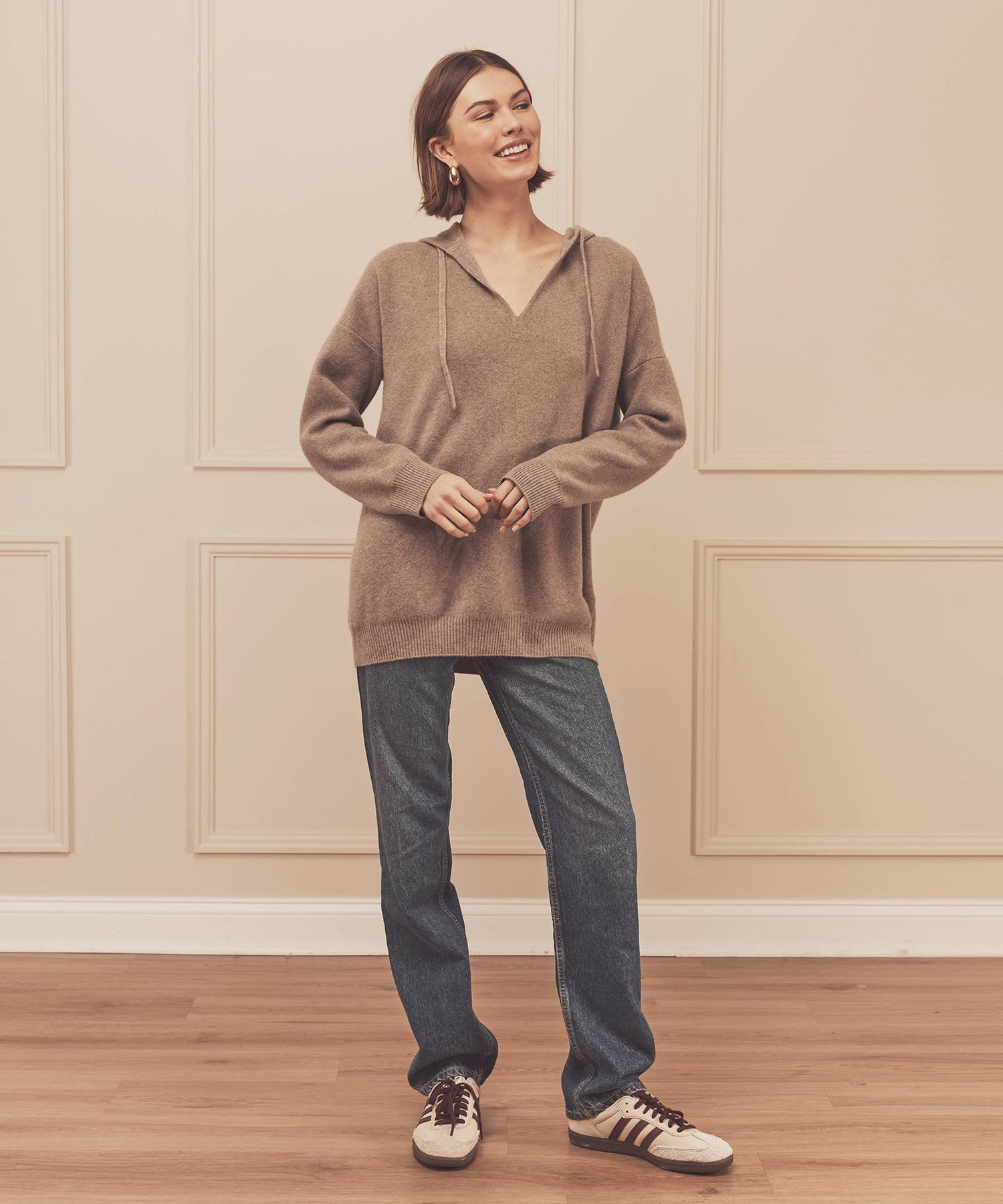 The Cashmino Tunic Hoodie is a cozy pullover with an oversized fit and tunic length. It features a wide v neckline, drawstring hood, and ribbed details. Crafted from a luxuriously-soft blend of merino wool and premium cashmere.