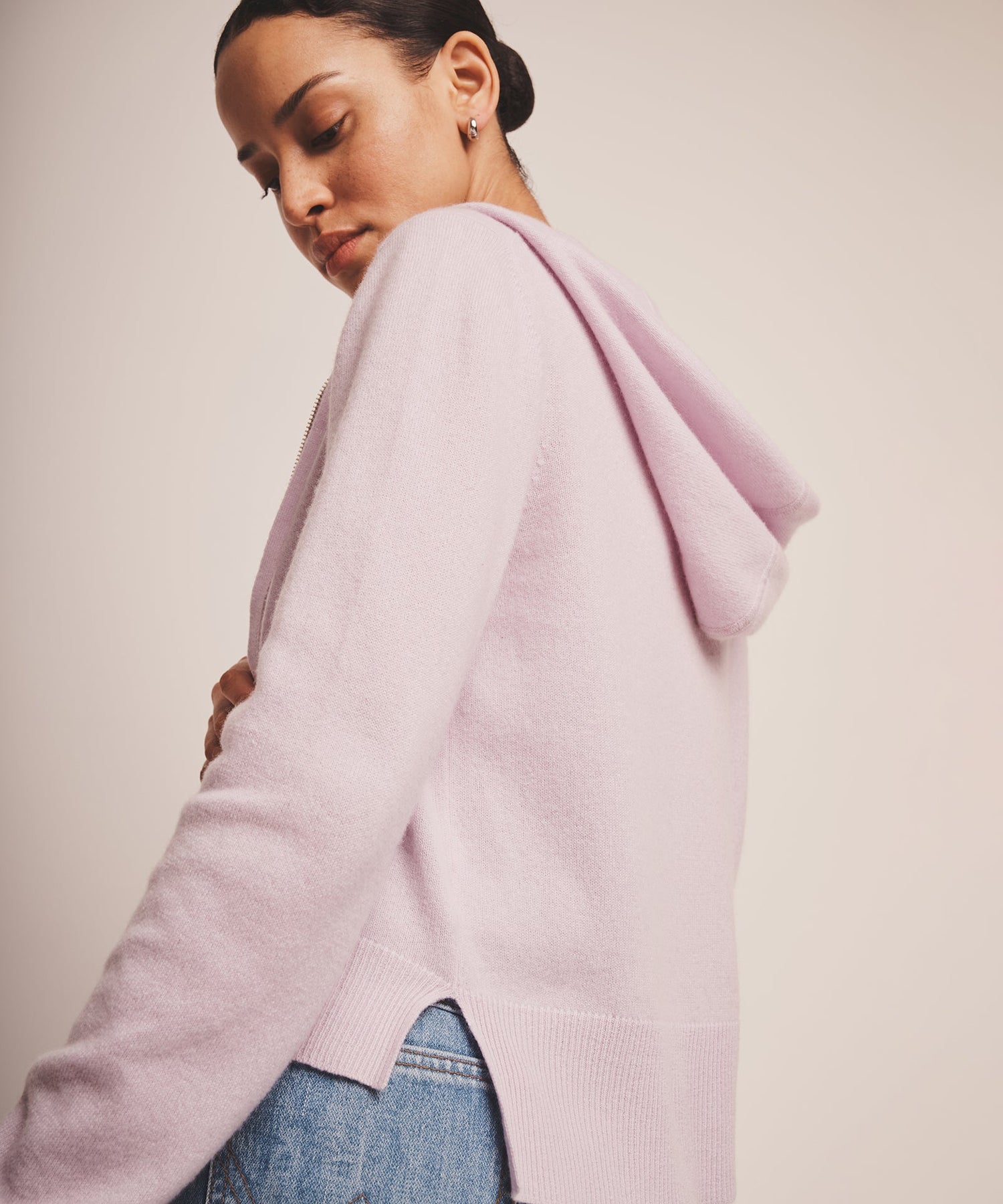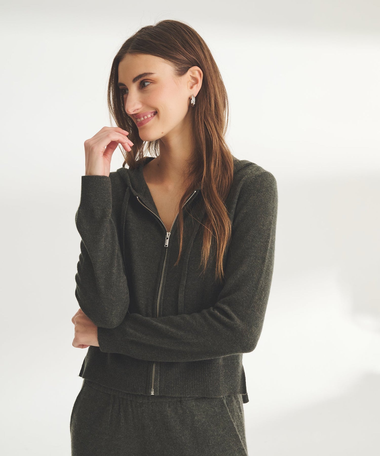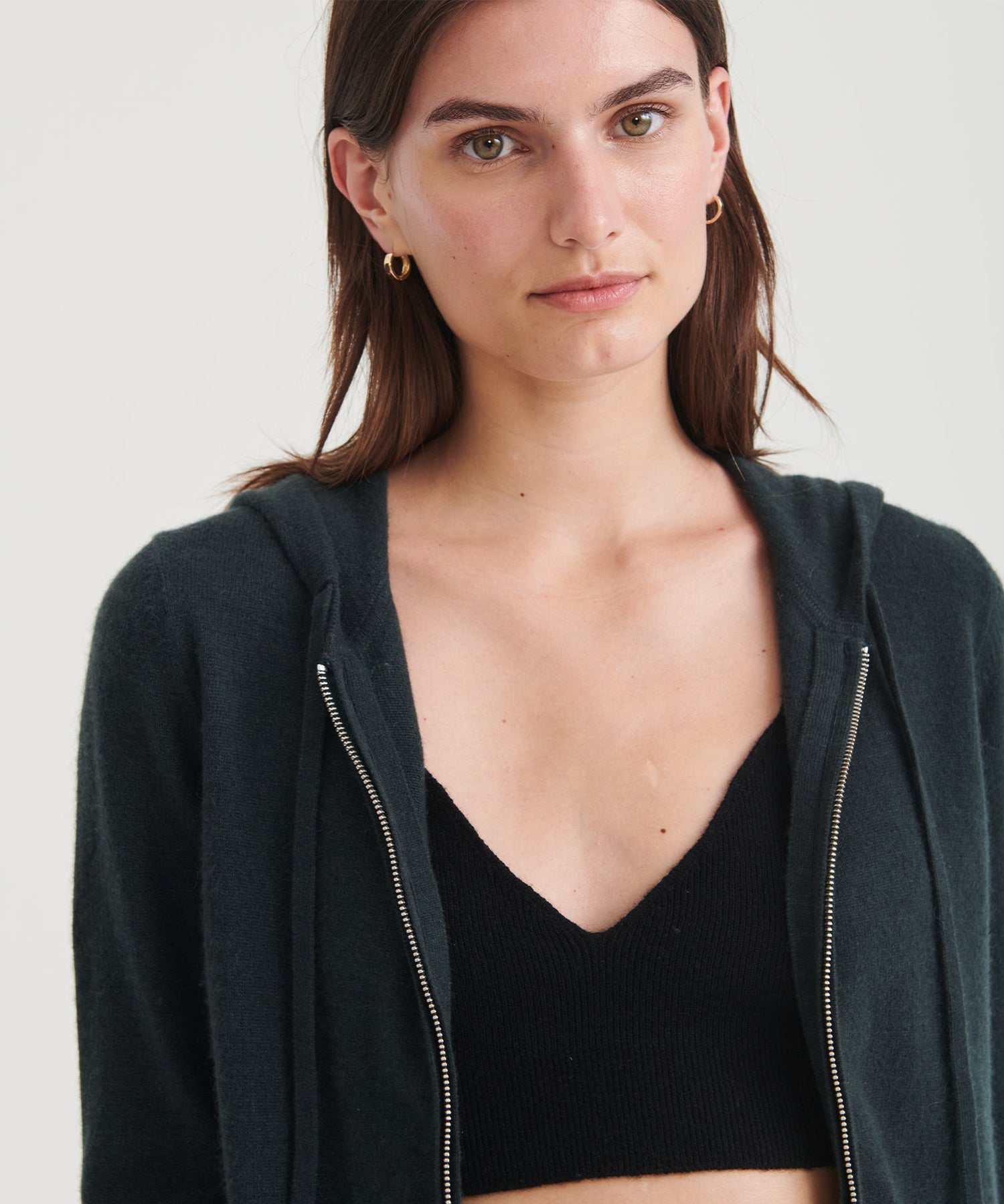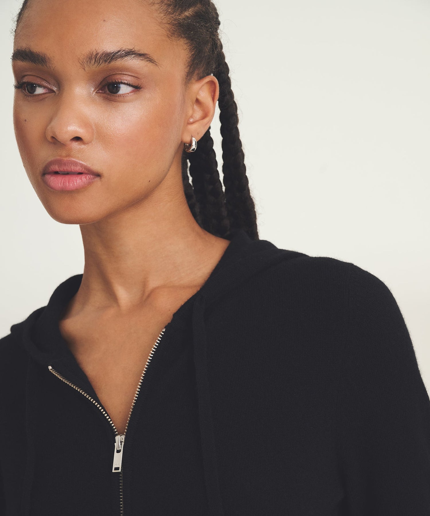 The Cashmere Cropped Zip Up Hoodie is an elevated essential with a classic fit and short classic length designed to skim the top of the hip bones. It features a drawstring hood, side slits, high-low hem, ribbed details, and full-zip construction. Crafted from 100% premium, sustainable cashmere.