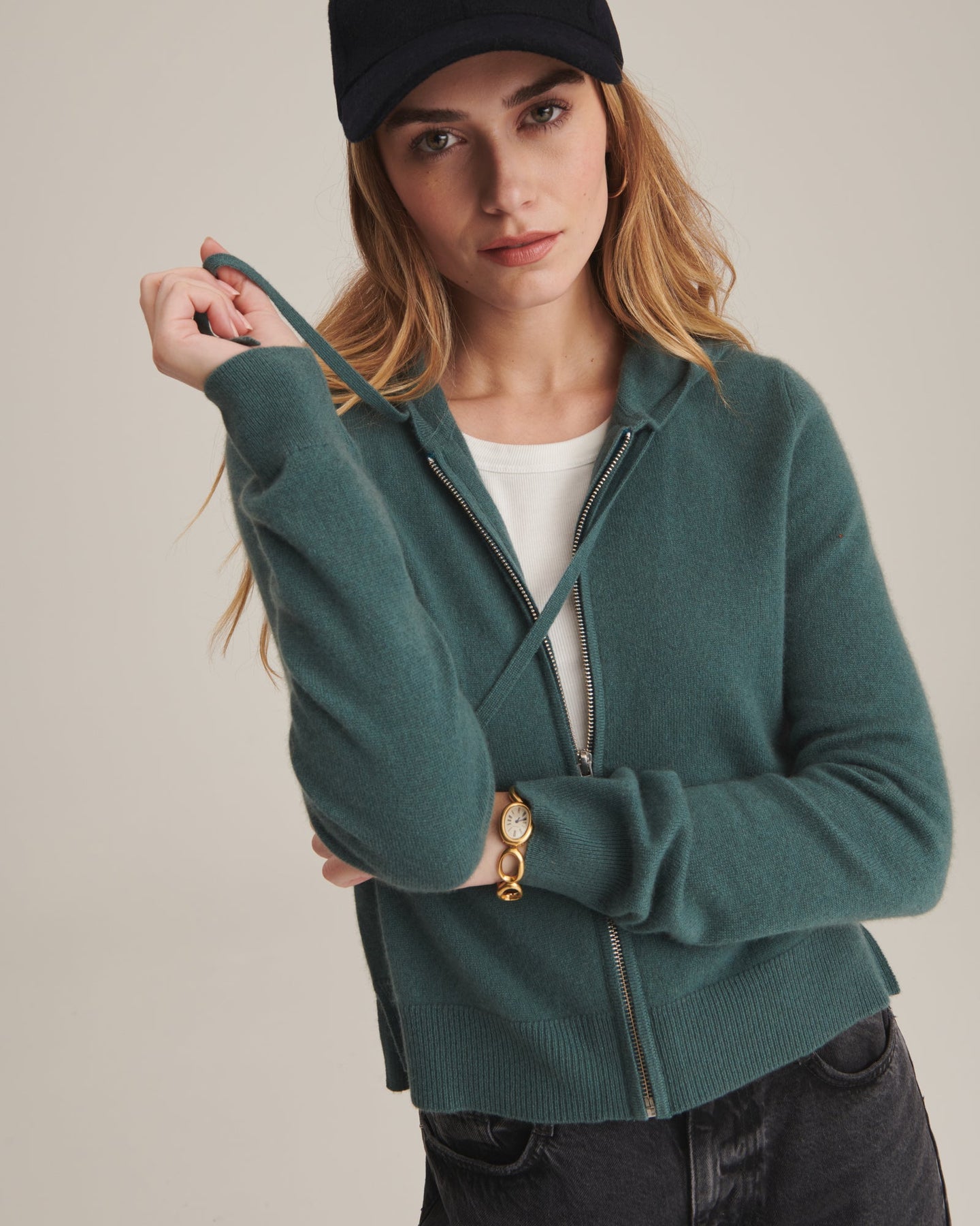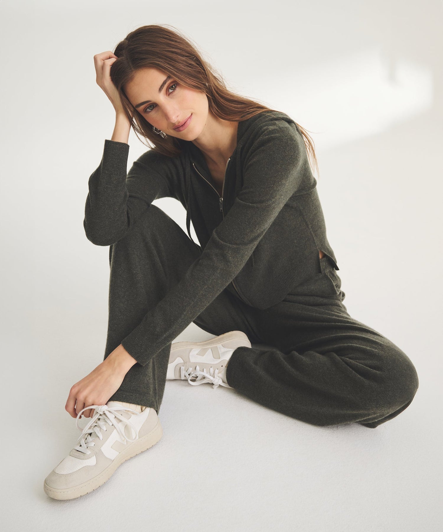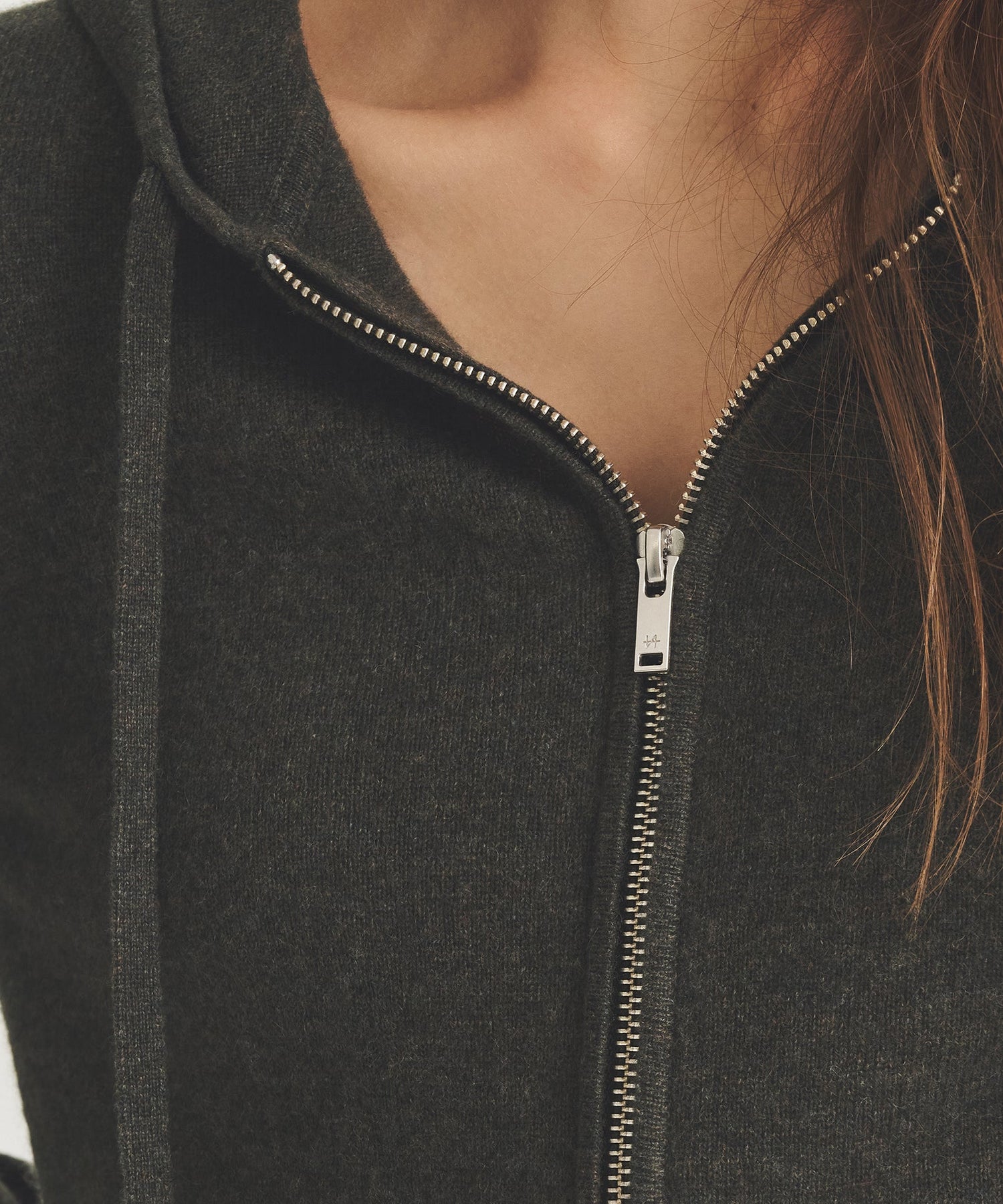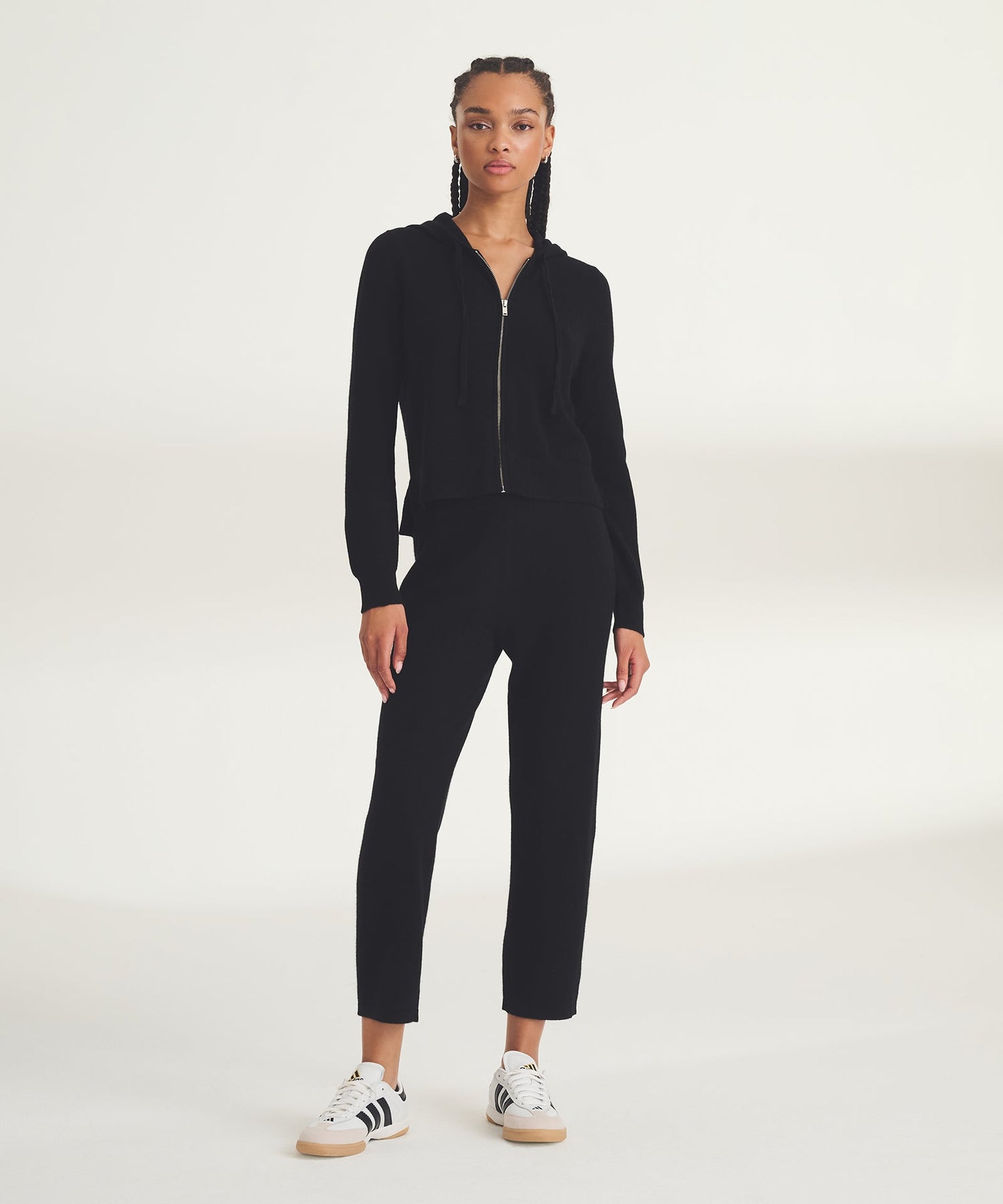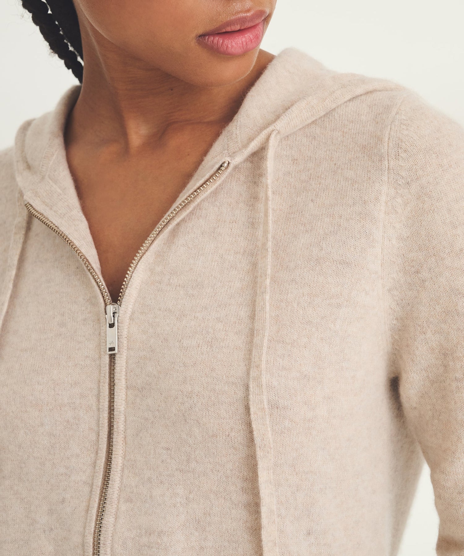 The Cashmere Cropped Zip Up Hoodie is an elevated essential with a classic fit and short classic length designed to skim the top of the hip bones. It features a drawstring hood, side slits, high-low hem, ribbed details, and full-zip construction. Crafted from 100% premium, sustainable cashmere.
