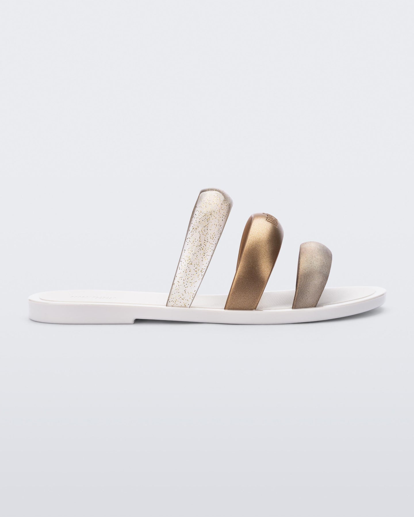 Feel free to stare right at the Eclipse Slideit's hard not to. This triple-strap slide catches eyes with a variety of tints and finishes on every pair, from high-shine translucent and metallic treatments to shimmery tones and glitter. Plus, the trio of straps rocks the puffed-look to keep the vibe light as air.