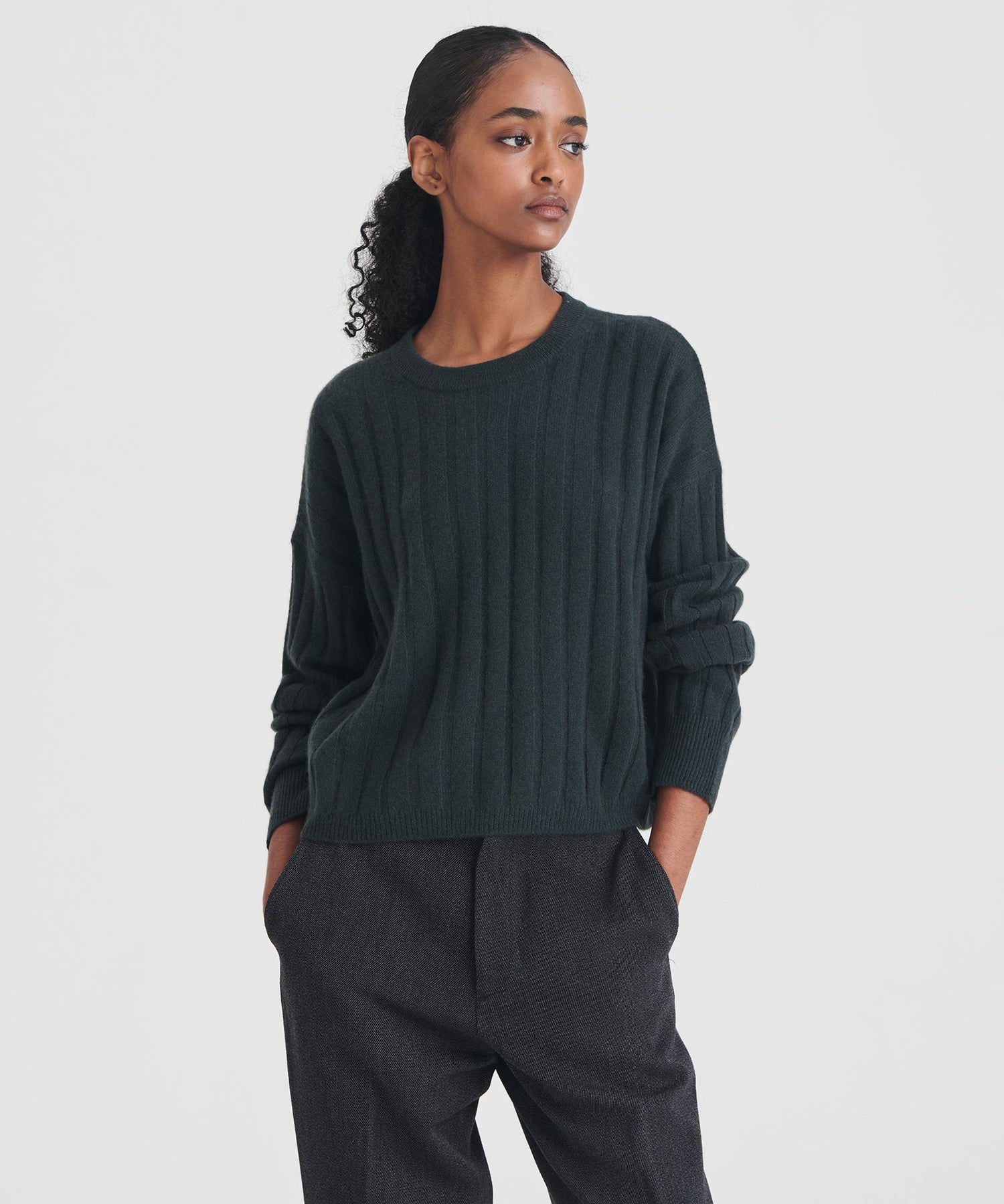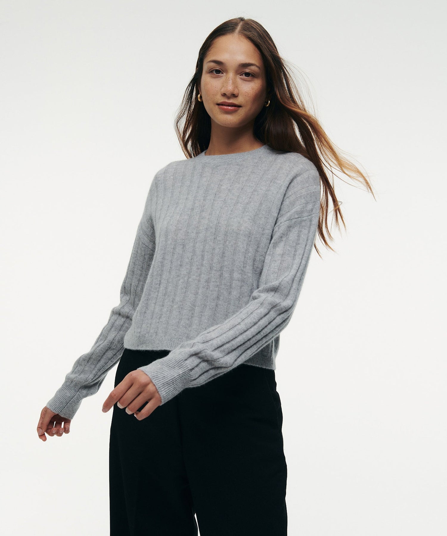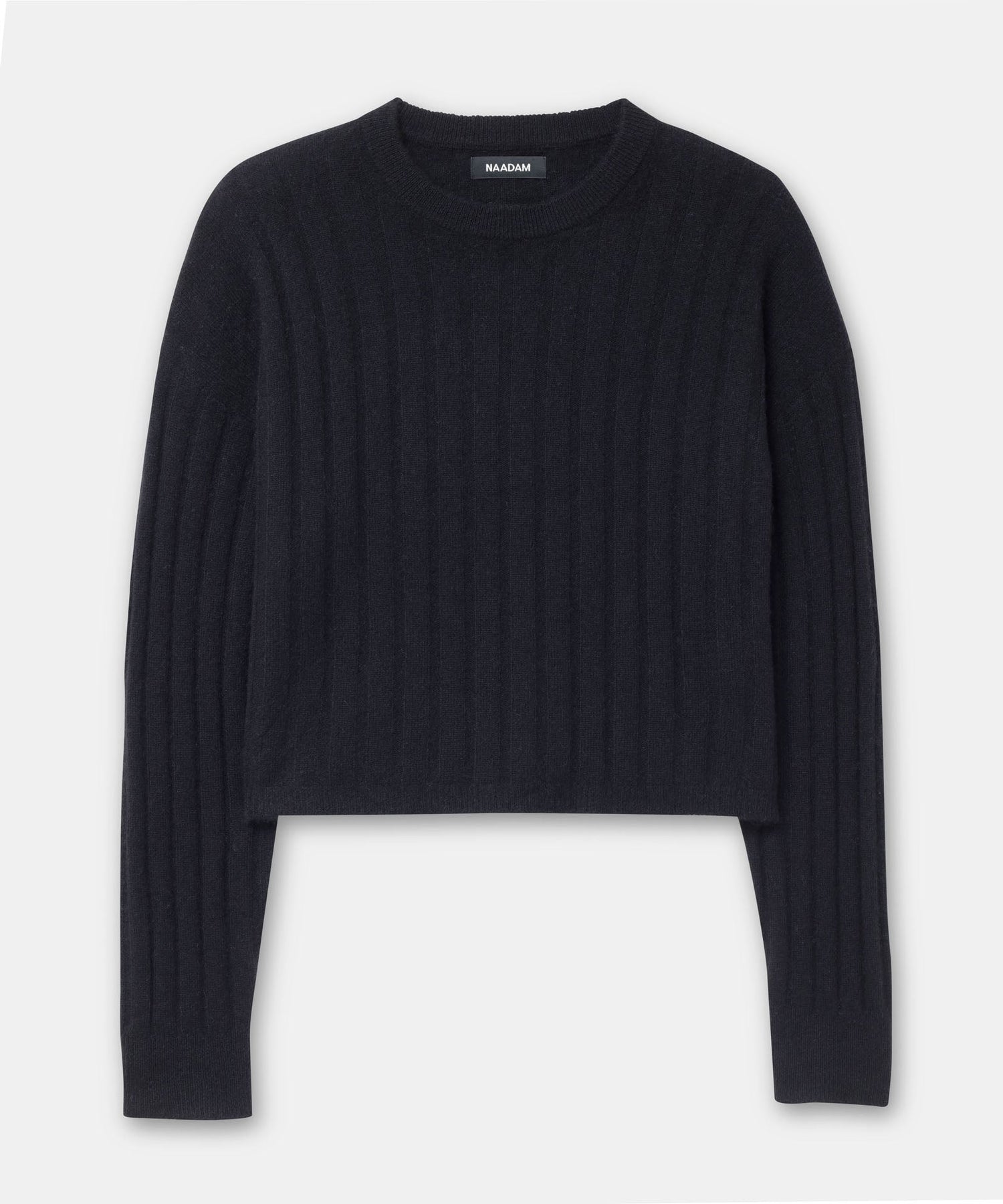 The Cashmere Ribbed Cropped Sweater is a versatile wardrobe staple with a relaxed classic fit and a cropped length. It features a crew neckline, drop shoulders, and wide ribbing throughout. Crafted from 100% premium, sustainable cashmere.