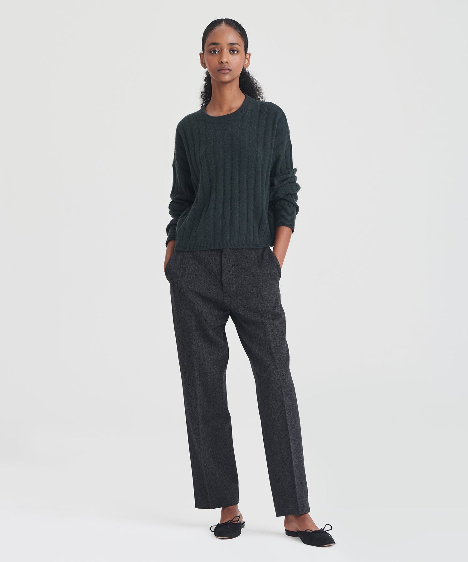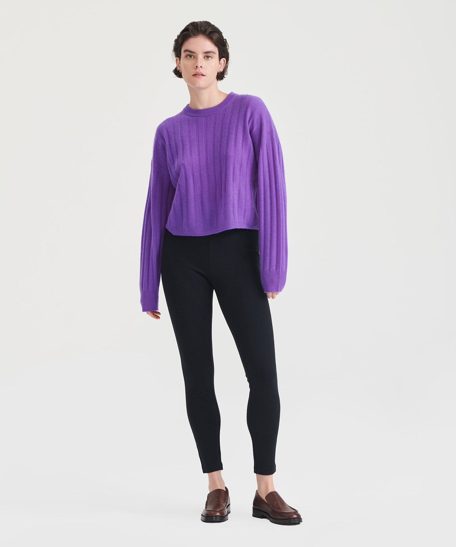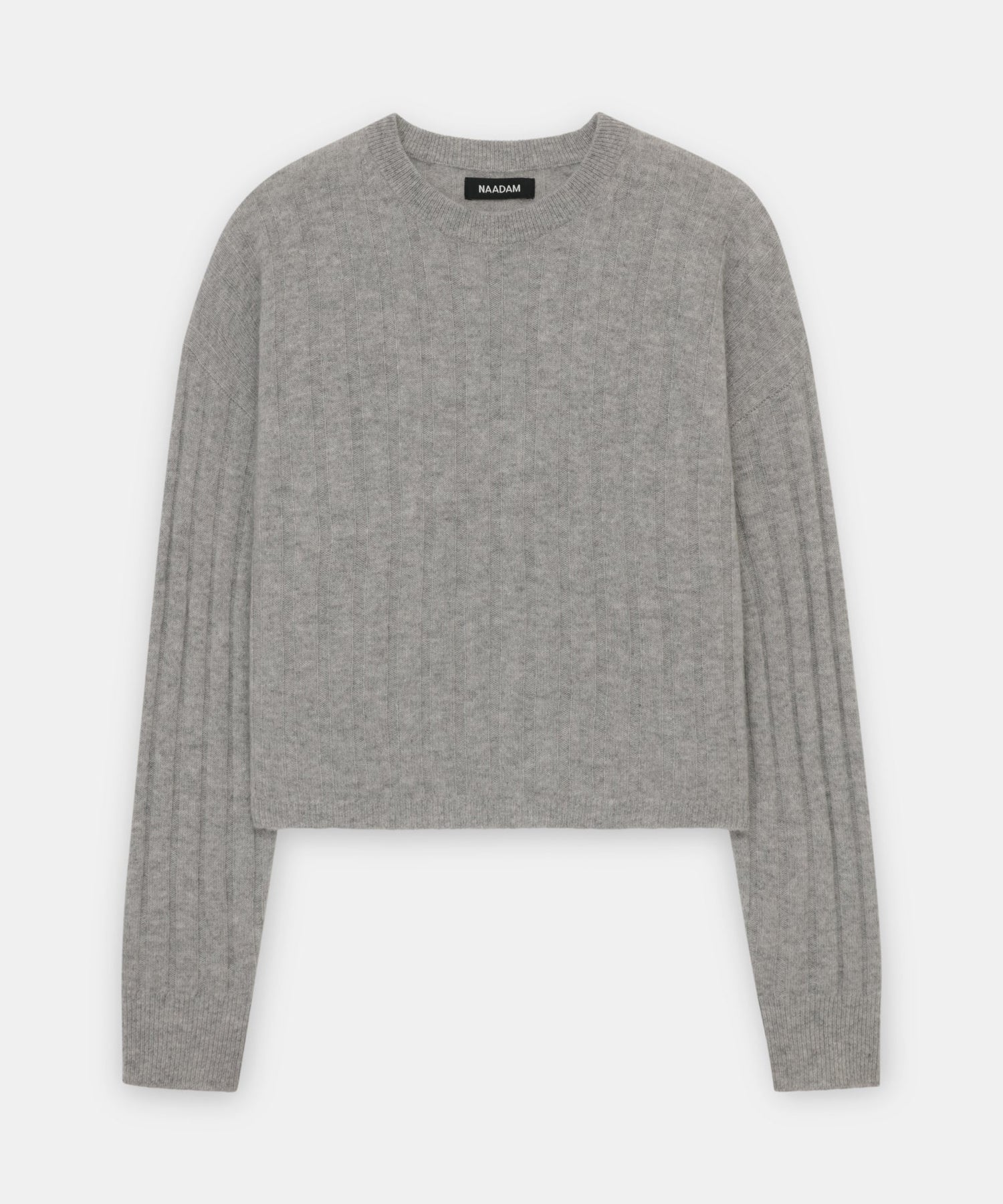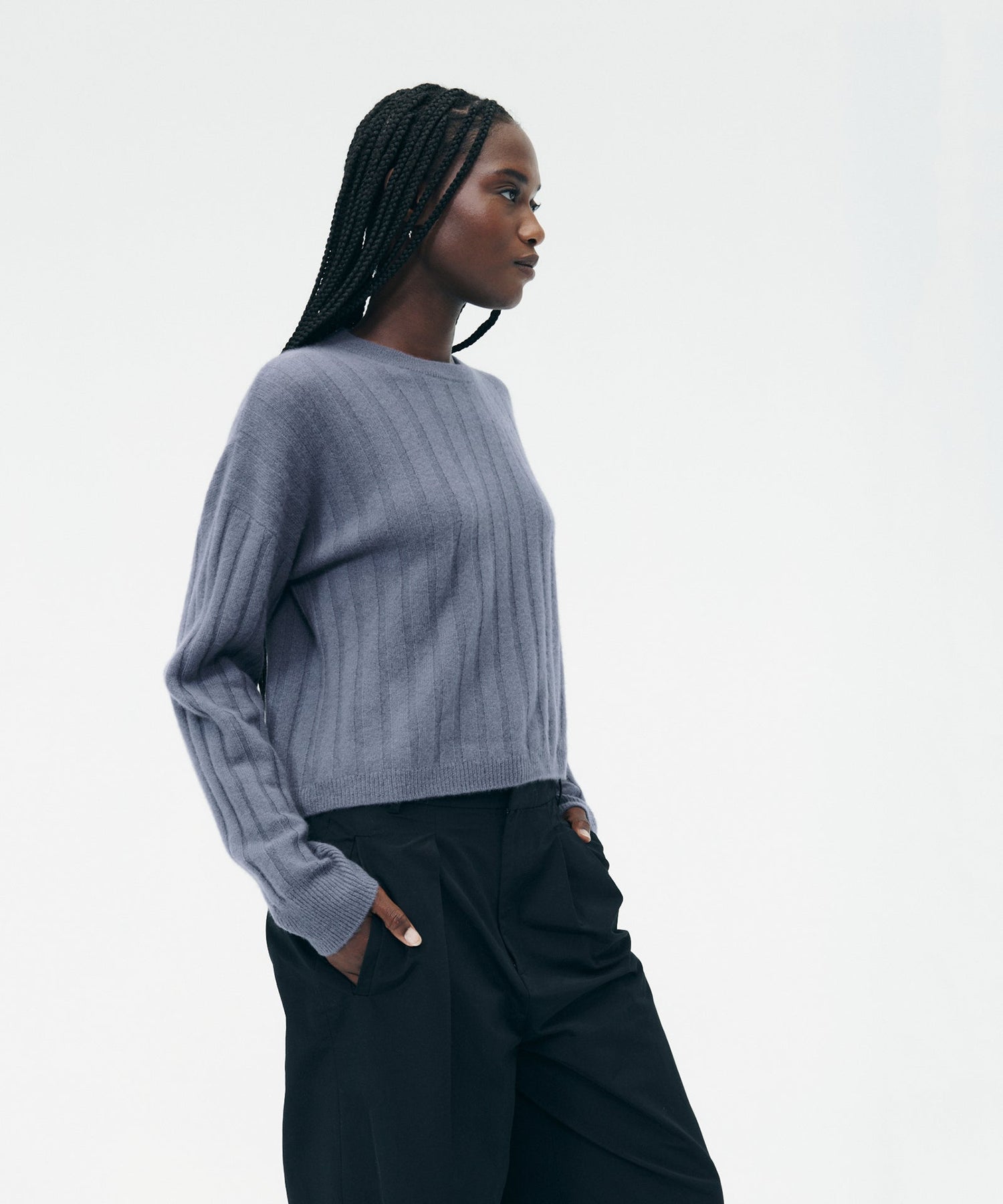 The Cashmere Ribbed Cropped Sweater is a versatile wardrobe staple with a relaxed classic fit and a cropped length. It features a crew neckline, drop shoulders, and wide ribbing throughout. Crafted from 100% premium, sustainable cashmere.