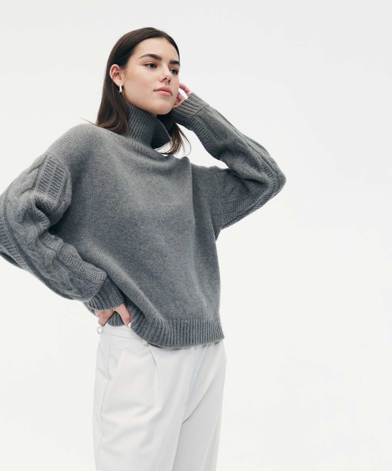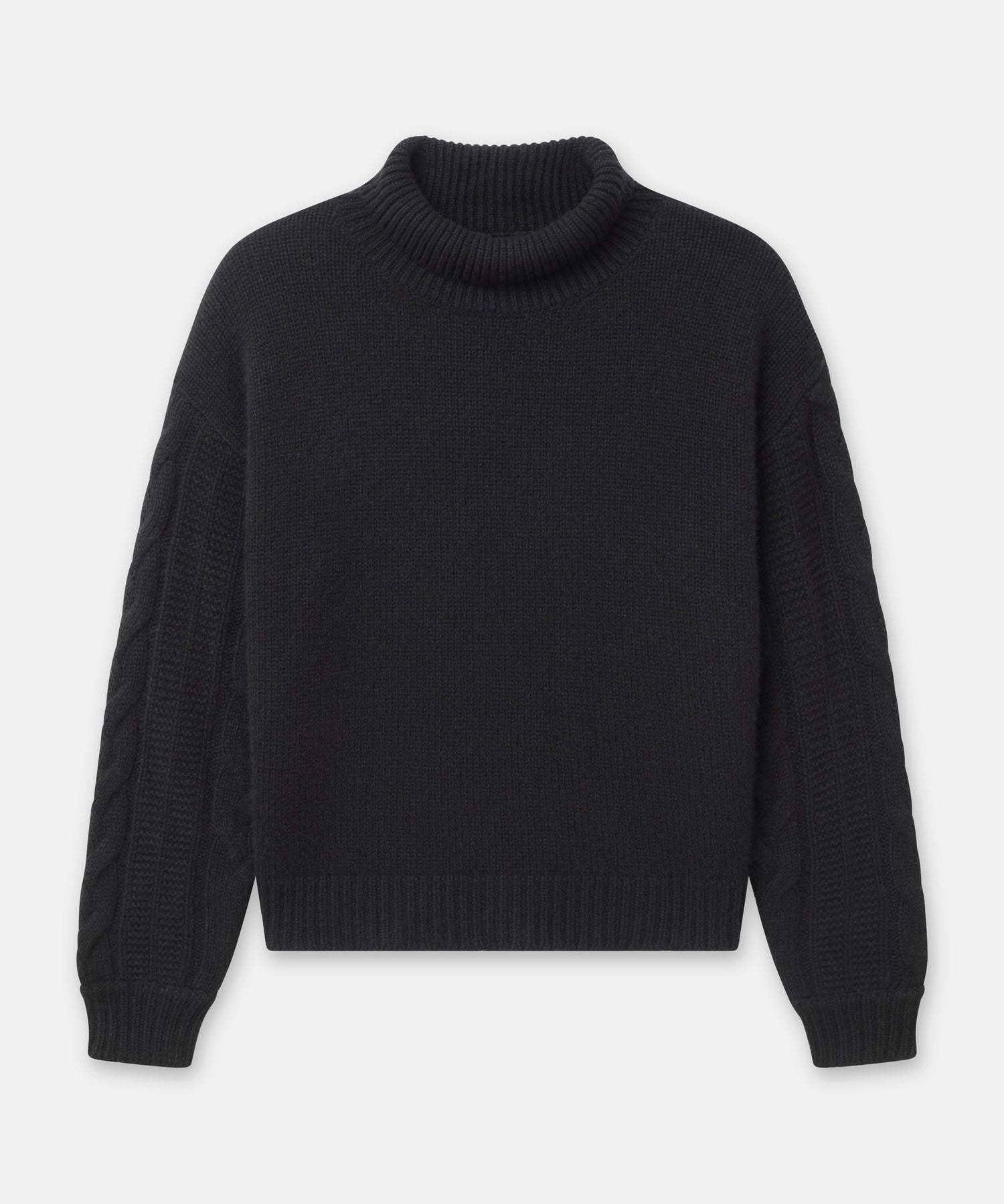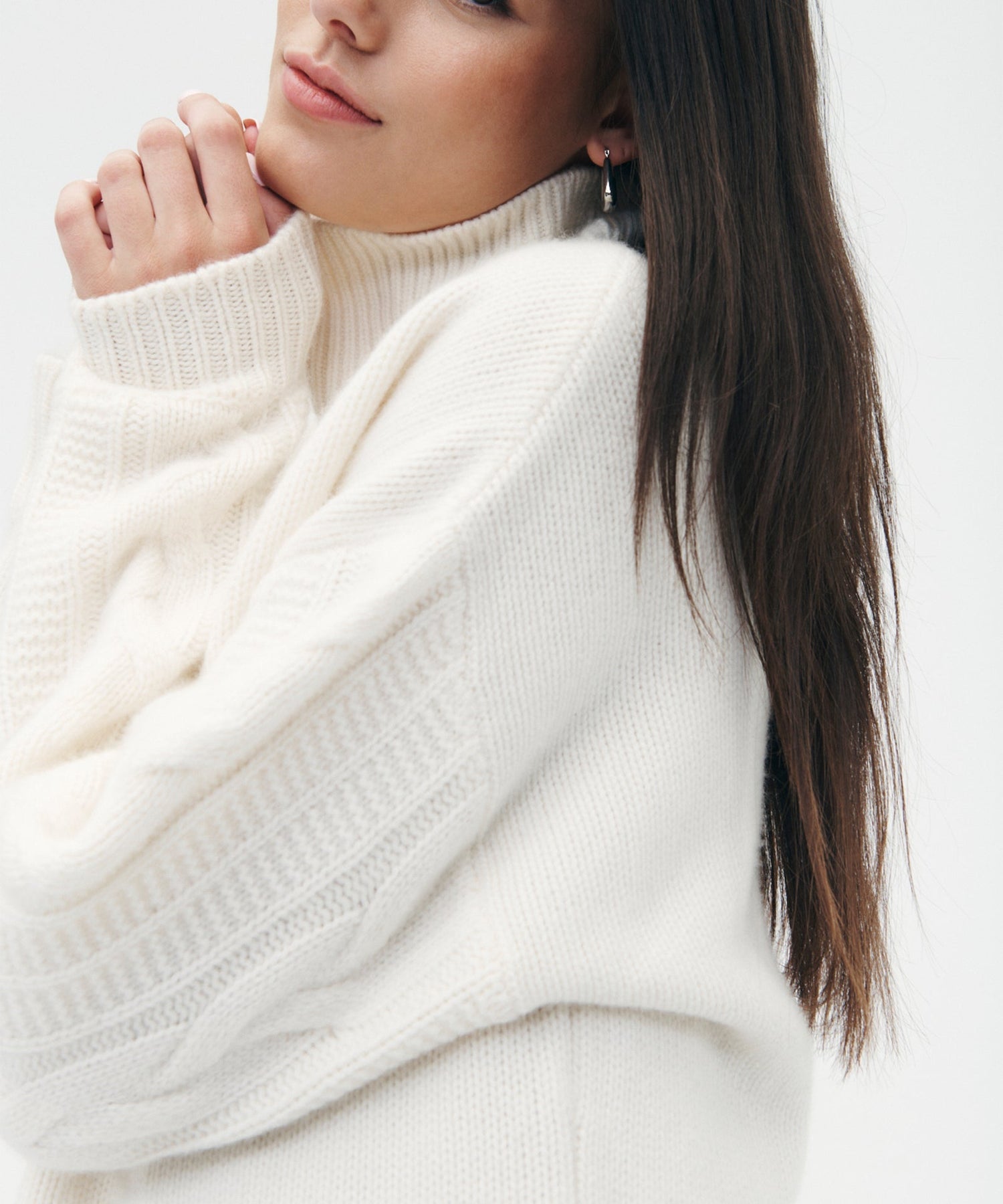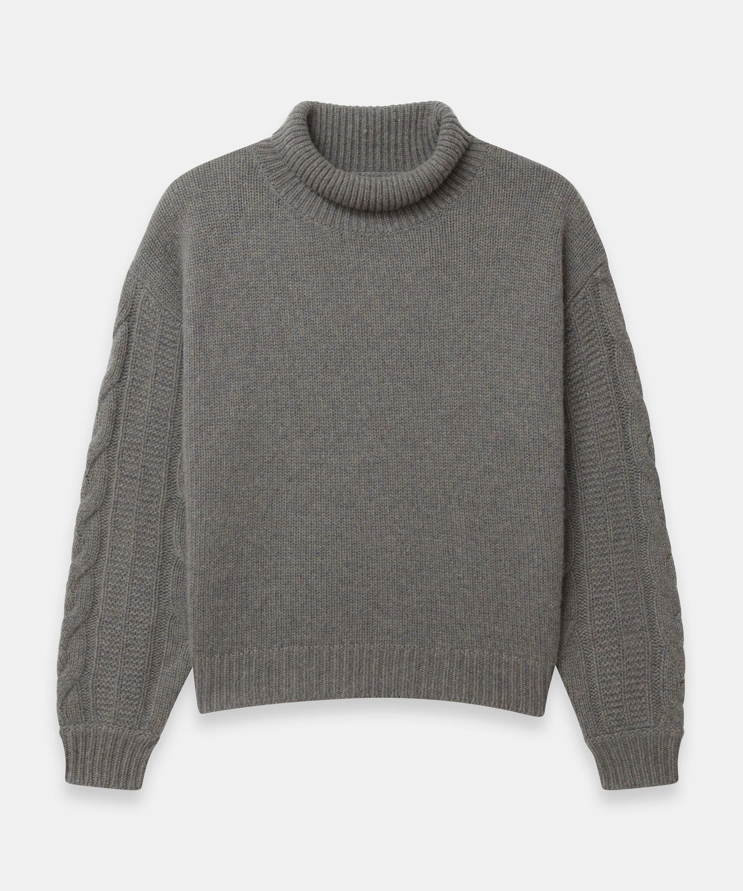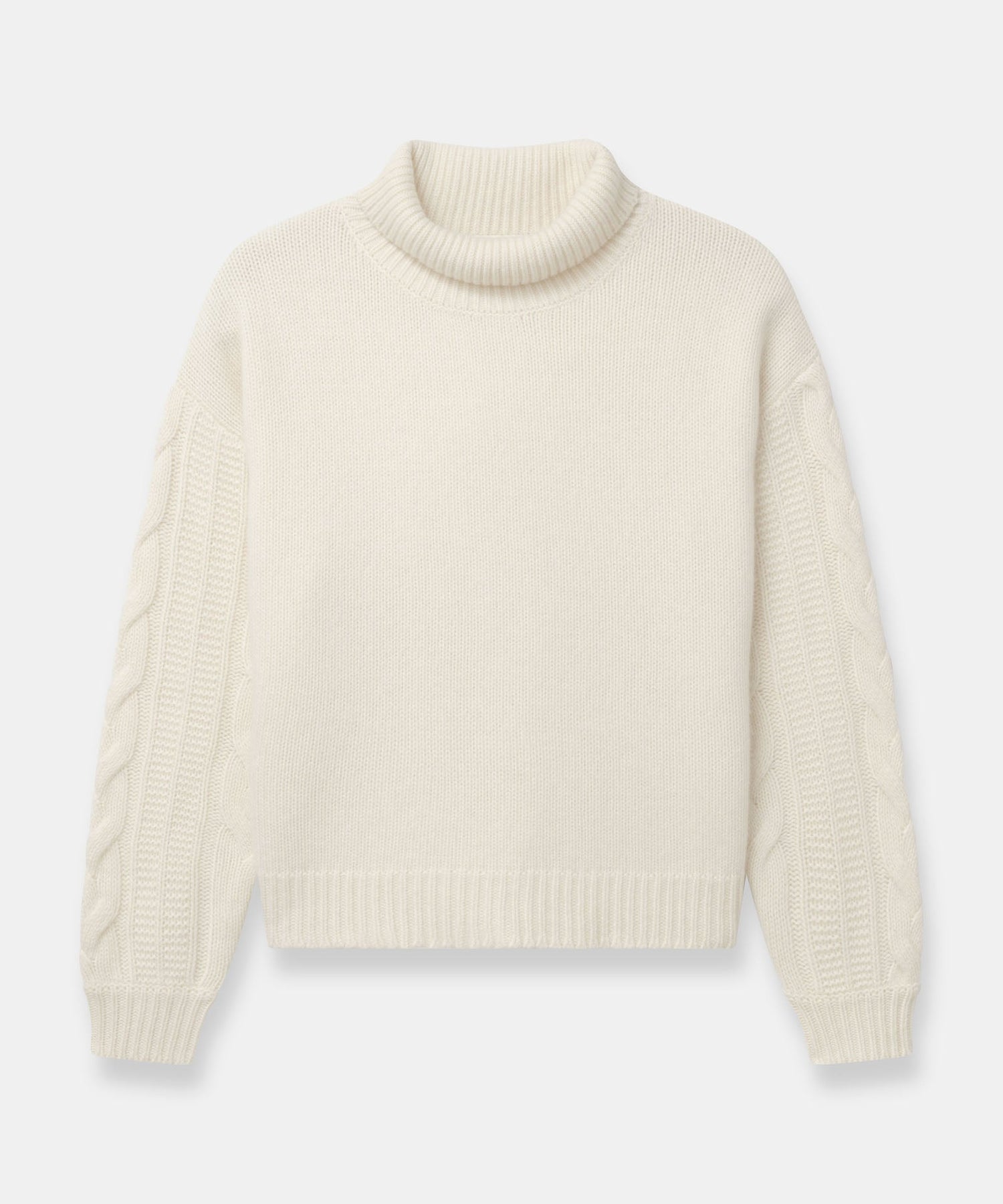 Statement sleeeve. The Merino Cashmere Cable Turtleneck redefines the cold weather classic with a roll neck collar, textured sleeves and ribbing at the cuffs and hems. Wear it with jeans or style it over a slip dress for a look that's as chic as it is cozy.