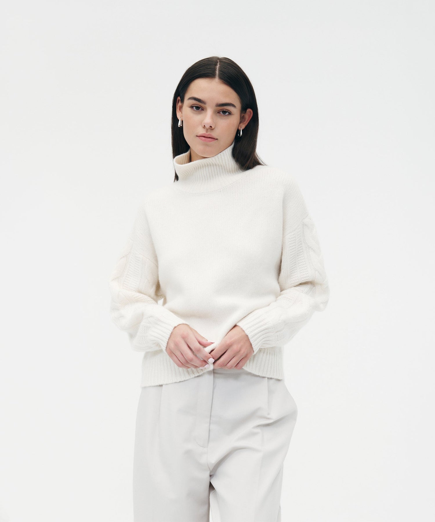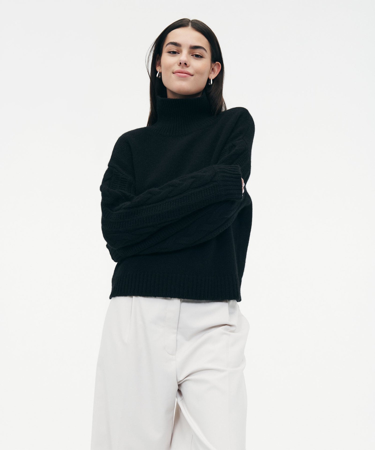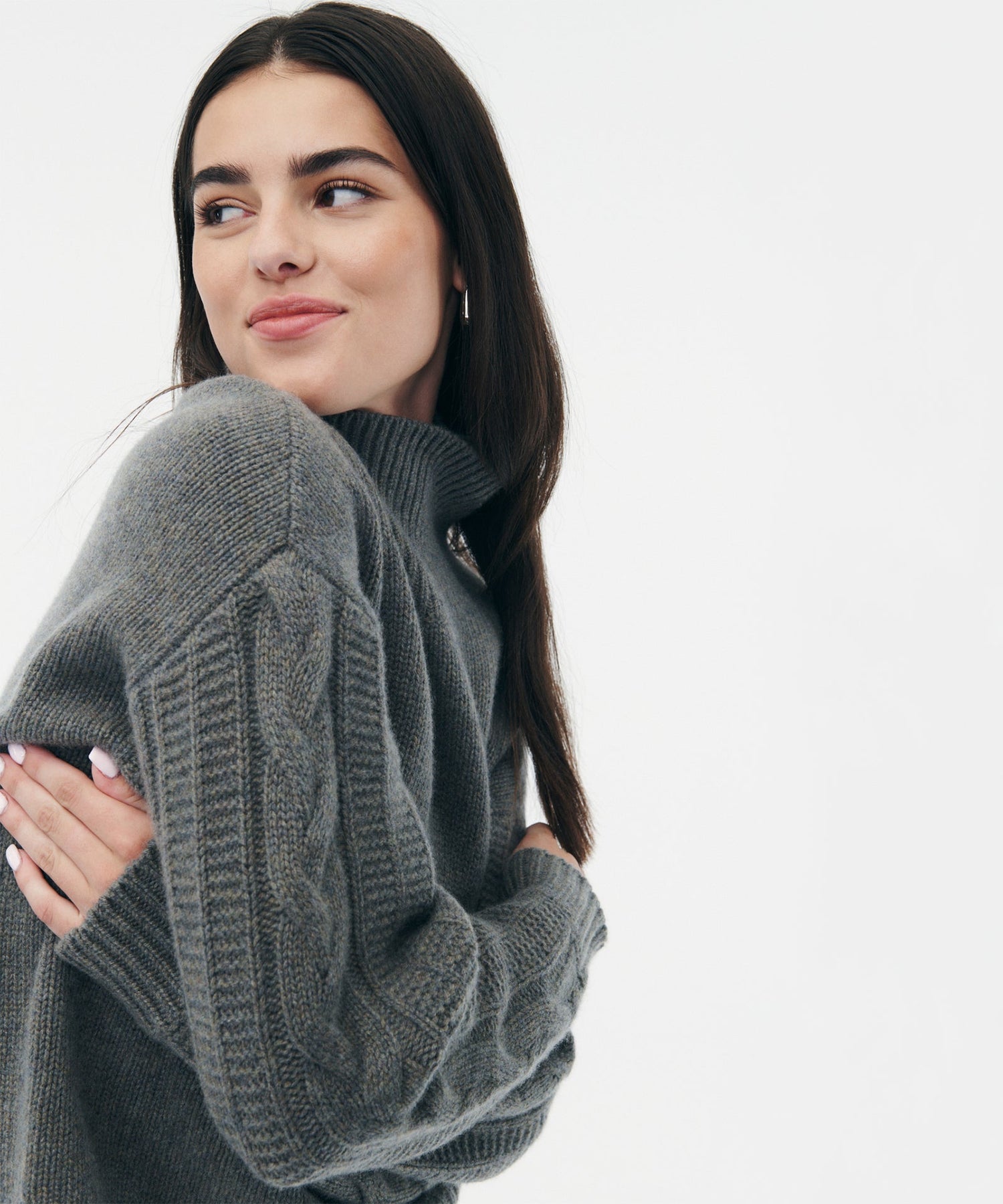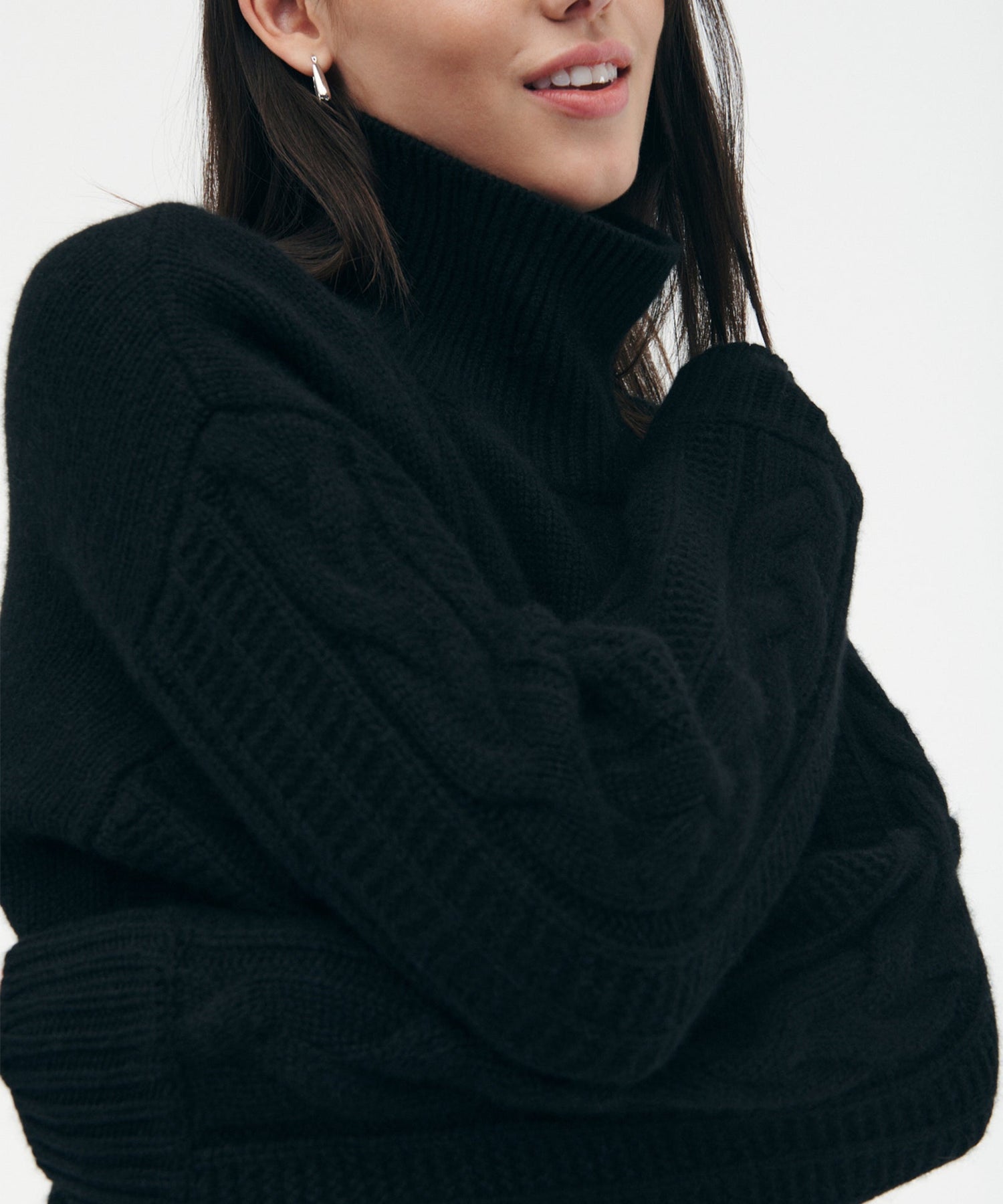 Statement sleeeve. The Merino Cashmere Cable Turtleneck redefines the cold weather classic with a roll neck collar, textured sleeves and ribbing at the cuffs and hems. Wear it with jeans or style it over a slip dress for a look that's as chic as it is cozy.